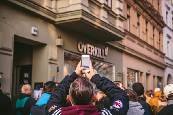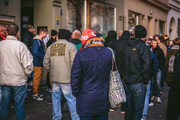 Der Release war auf den 31. Oktober angesetzt und schon früh haben sich hierzu die ersten Camper eingefunden, die den Schuh und die Special Box unbedingt ihr eigen nennen wollten. Zum Schluß waren es unglaubliche 500 Turnschuhverrückte, die ihre Campingstühle vor dem Laden aufgeschlagen haben – ein Ansturm, mit dem wir so nicht gerechnet haben. Für den Verkauf des Schuhs haben wir die Remise im Hinterhof in eine kleine aber feine Release Lounge verwandelt und liebevoll dekoriert. An den Wänden hing eine Auswahl der Editorial Fotos in Postergröße neben den Peter O’Toole Grafiken und dem Cover des Sneaker Freaker Magazins, welches unsere Kollabo abgebildet hat. Dazu gab es Vitrinen, in denen wir den Schuh, frühe Samples und Original EQT Racer von 1993 neben diversen typischen Elementen wie Taxileuchtschildern, Stadplänen, Spielzeugtaxis usw ausgestellt haben. Diese liebe zum Detail hat alle, die vor Ort waren, um sich unsere Version des EQT 93 zu kaufen begeistert und es war insgesamt mal wieder ein sehr schönes und entspanntes Relaseevent.