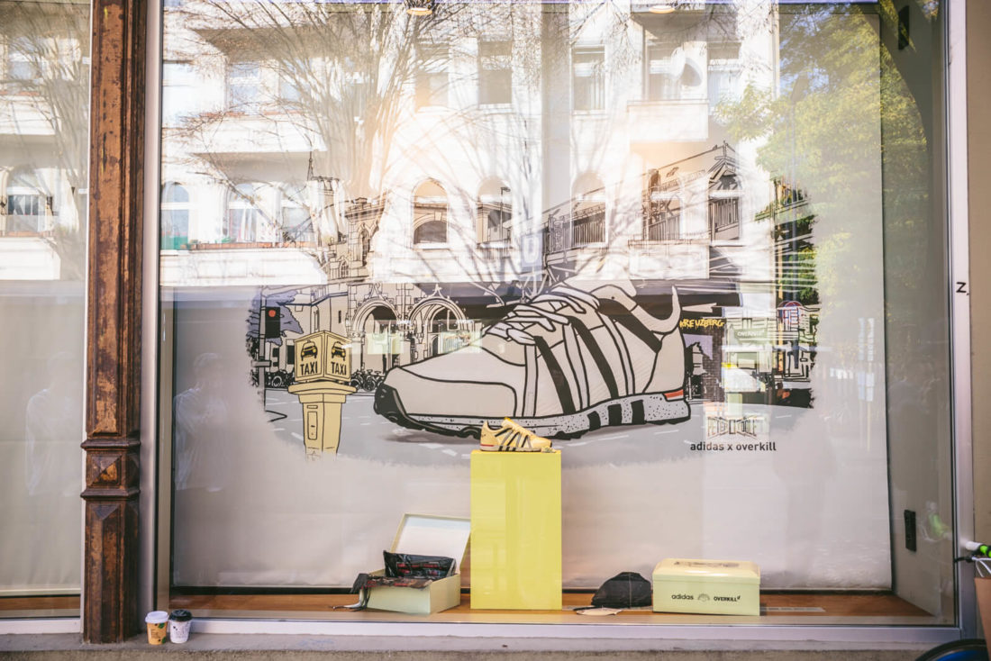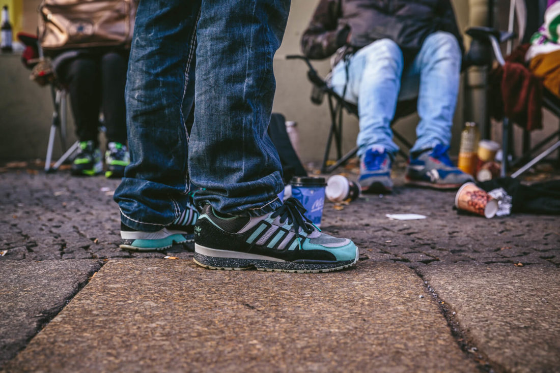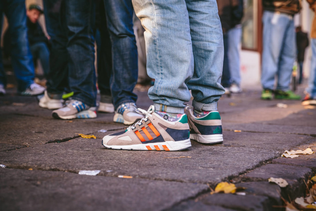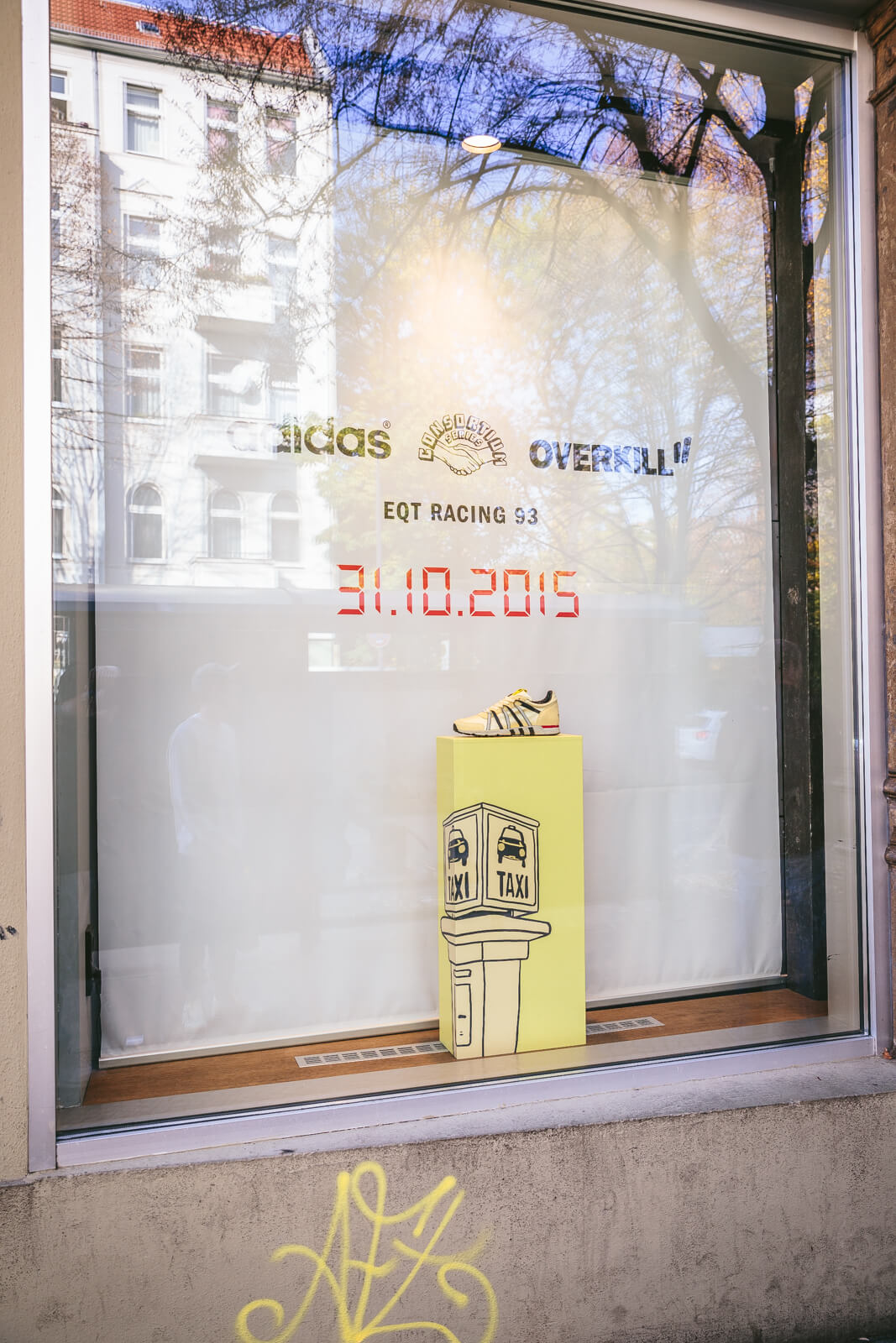 Der Release war auf den 31. Oktober angesetzt und schon früh haben sich hierzu die ersten Camper eingefunden, die den Schuh und die Special Box unbedingt ihr eigen nennen wollten. Zum Schluß waren es unglaubliche 500 Turnschuhverrückte, die ihre Campingstühle vor dem Laden aufgeschlagen haben – ein Ansturm, mit dem wir so nicht gerechnet haben. Für den Verkauf des Schuhs haben wir die Remise im Hinterhof in eine kleine aber feine Release Lounge verwandelt und liebevoll dekoriert. An den Wänden hing eine Auswahl der Editorial Fotos in Postergröße neben den Peter O’Toole Grafiken und dem Cover des Sneaker Freaker Magazins, welches unsere Kollabo abgebildet hat. Dazu gab es Vitrinen, in denen wir den Schuh, frühe Samples und Original EQT Racer von 1993 neben diversen typischen Elementen wie Taxileuchtschildern, Stadplänen, Spielzeugtaxis usw ausgestellt haben. Diese liebe zum Detail hat alle, die vor Ort waren, um sich unsere Version des EQT 93 zu kaufen begeistert und es war insgesamt mal wieder ein sehr schönes und entspanntes Relaseevent.