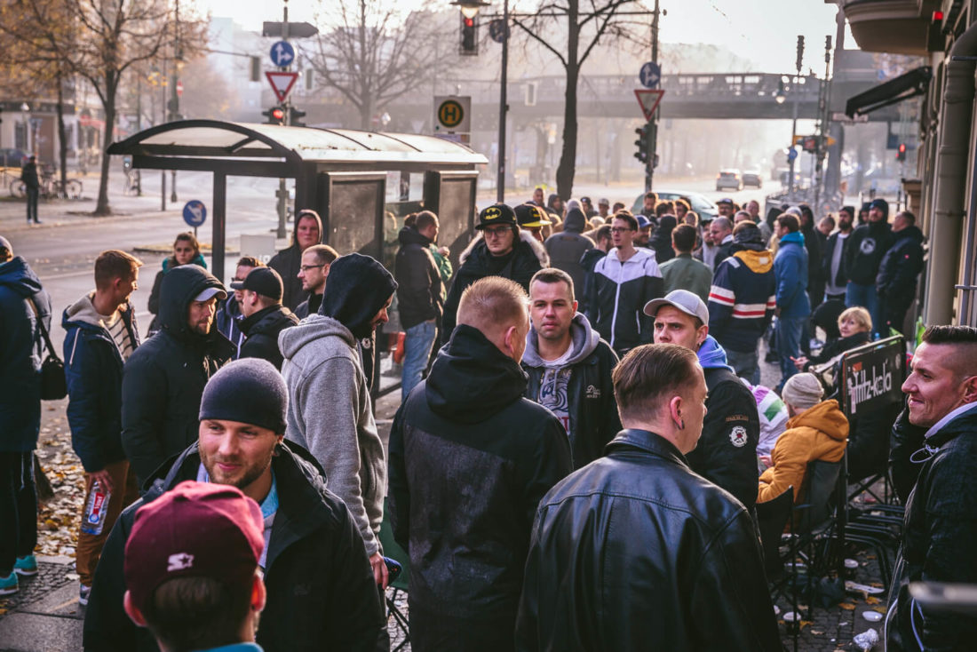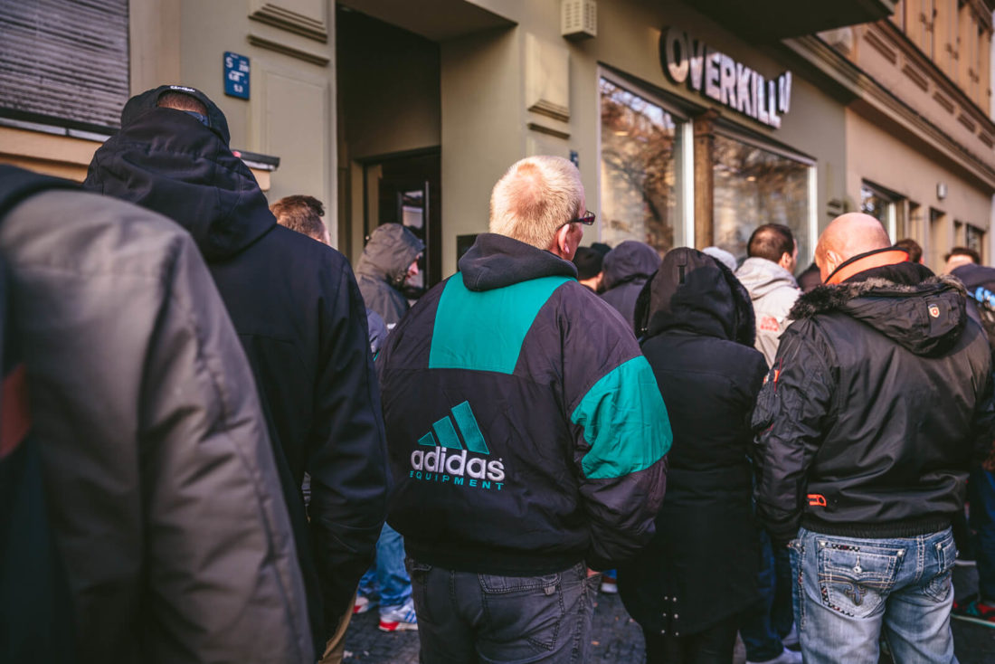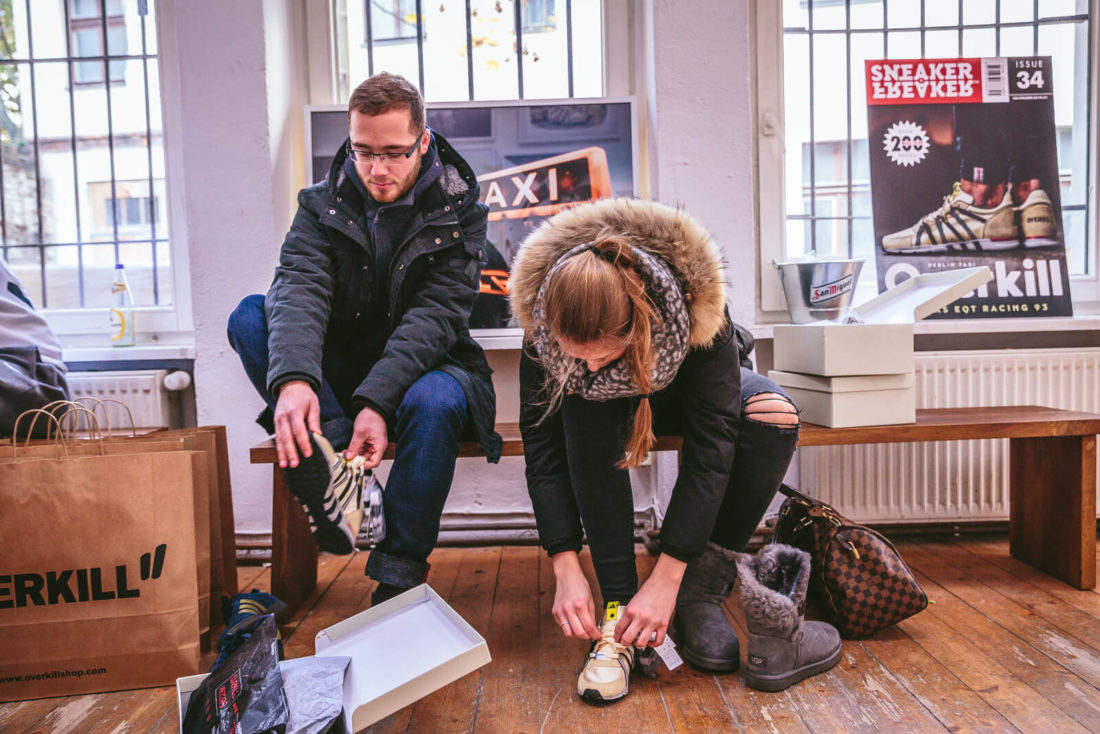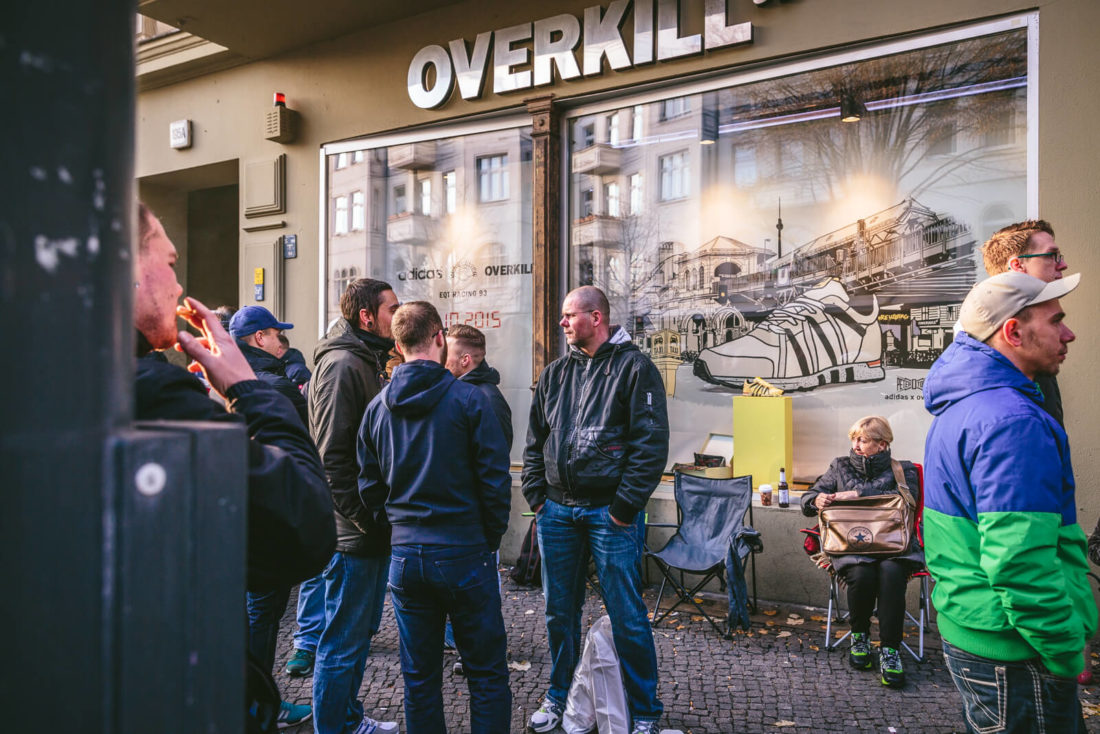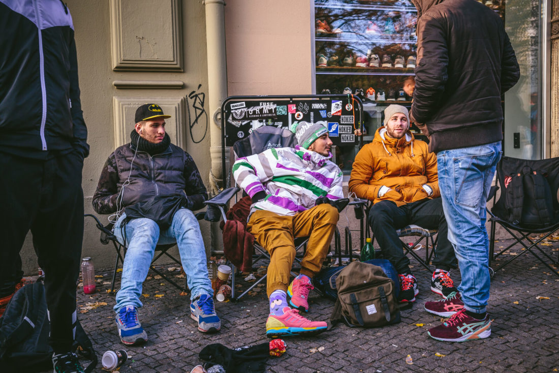 Der Release war auf den 31. Oktober angesetzt und schon früh haben sich hierzu die ersten Camper eingefunden, die den Schuh und die Special Box unbedingt ihr eigen nennen wollten. Zum Schluß waren es unglaubliche 500 Turnschuhverrückte, die ihre Campingstühle vor dem Laden aufgeschlagen haben – ein Ansturm, mit dem wir so nicht gerechnet haben. Für den Verkauf des Schuhs haben wir die Remise im Hinterhof in eine kleine aber feine Release Lounge verwandelt und liebevoll dekoriert. An den Wänden hing eine Auswahl der Editorial Fotos in Postergröße neben den Peter O’Toole Grafiken und dem Cover des Sneaker Freaker Magazins, welches unsere Kollabo abgebildet hat. Dazu gab es Vitrinen, in denen wir den Schuh, frühe Samples und Original EQT Racer von 1993 neben diversen typischen Elementen wie Taxileuchtschildern, Stadplänen, Spielzeugtaxis usw ausgestellt haben. Diese liebe zum Detail hat alle, die vor Ort waren, um sich unsere Version des EQT 93 zu kaufen begeistert und es war insgesamt mal wieder ein sehr schönes und entspanntes Relaseevent.