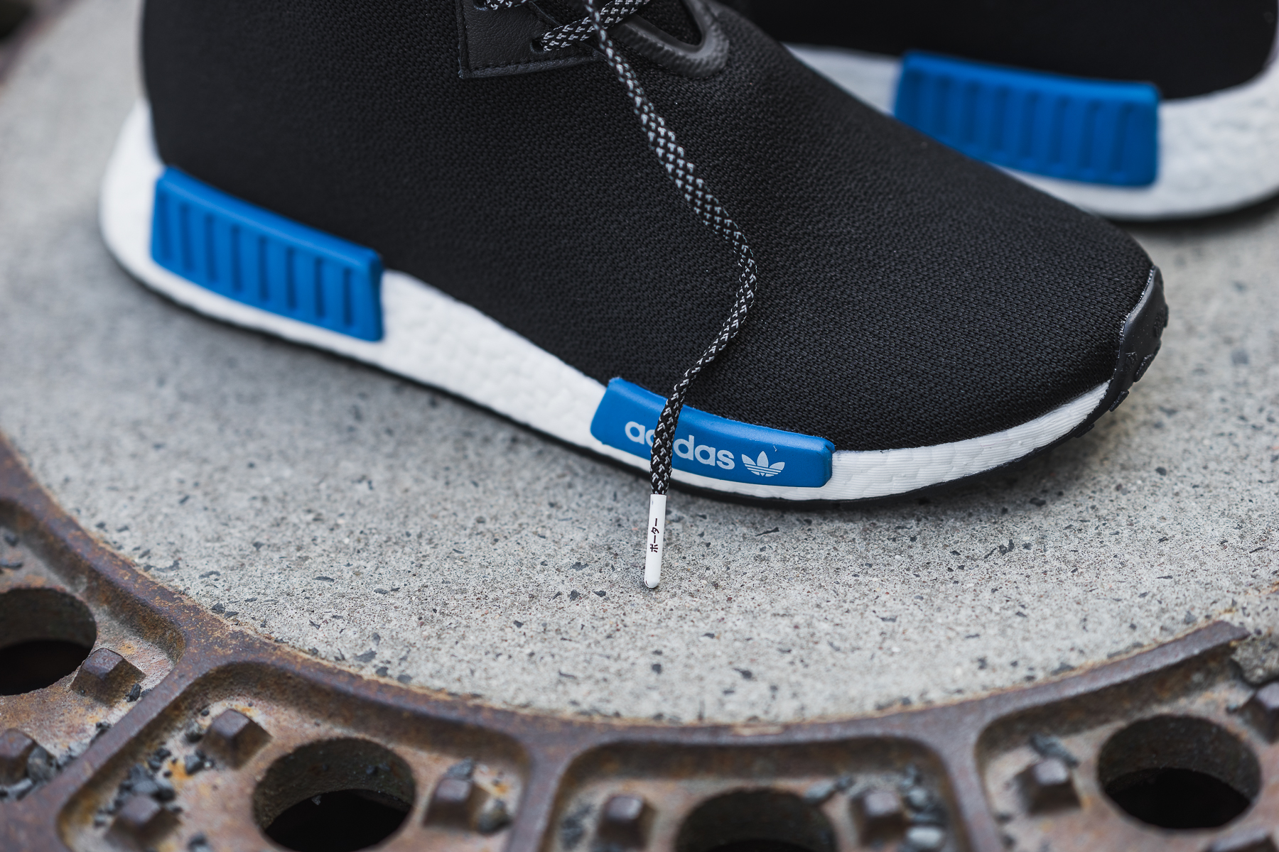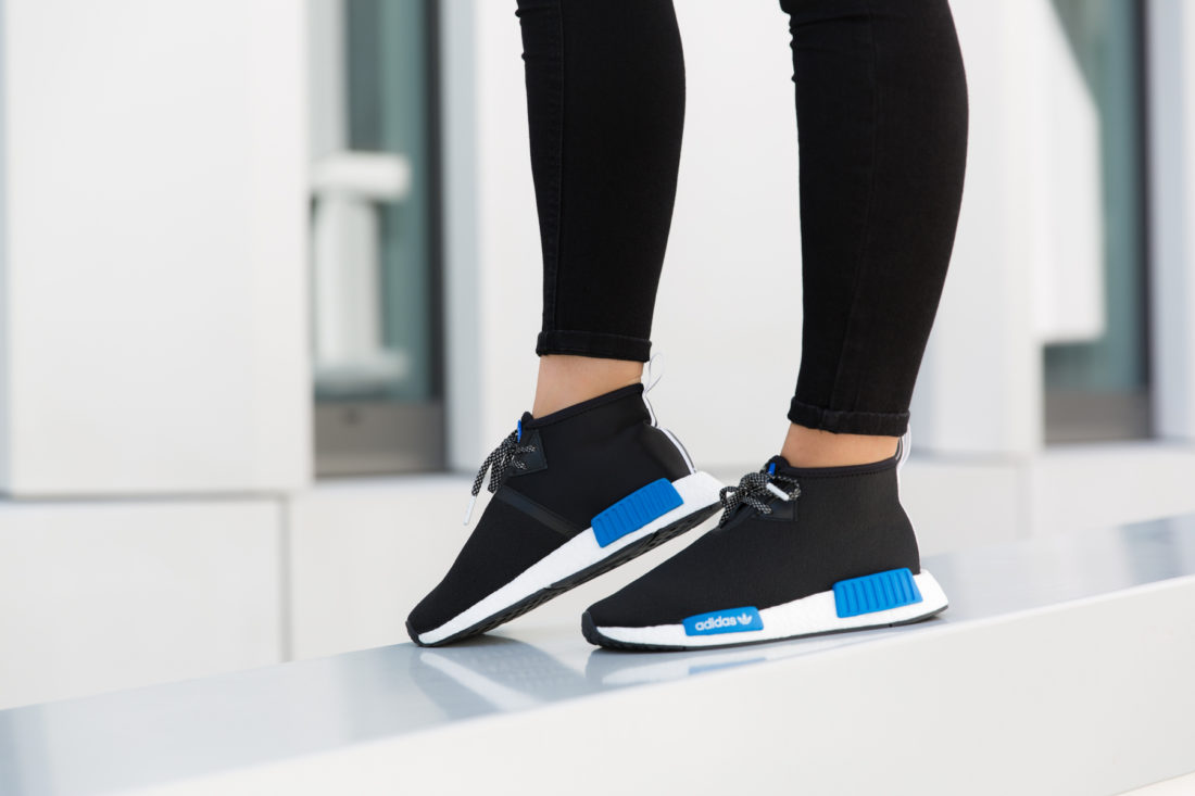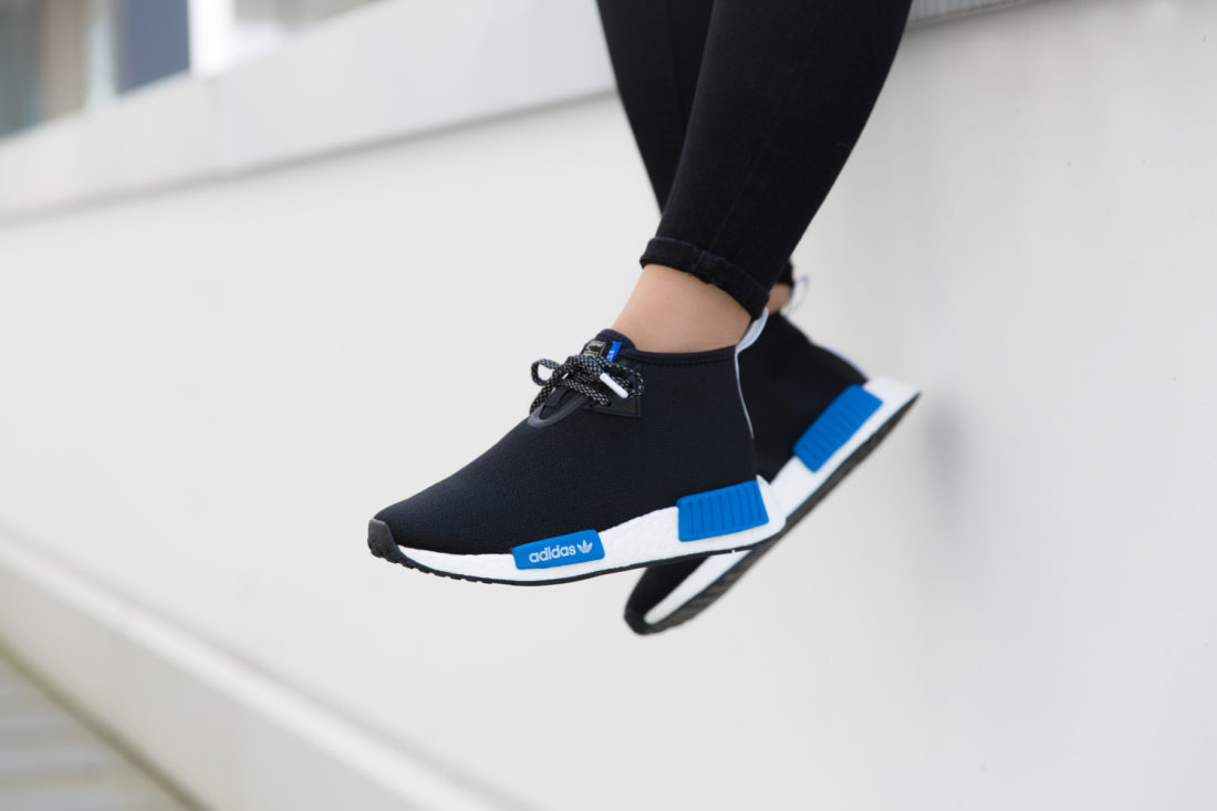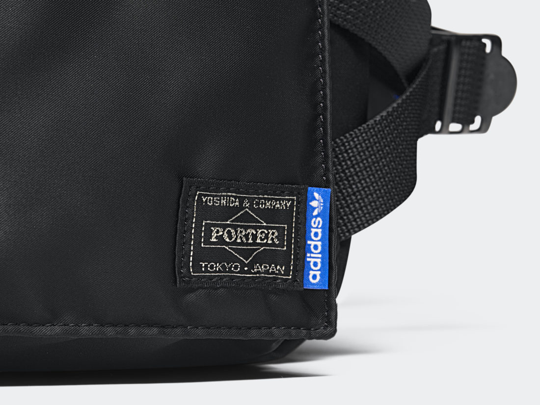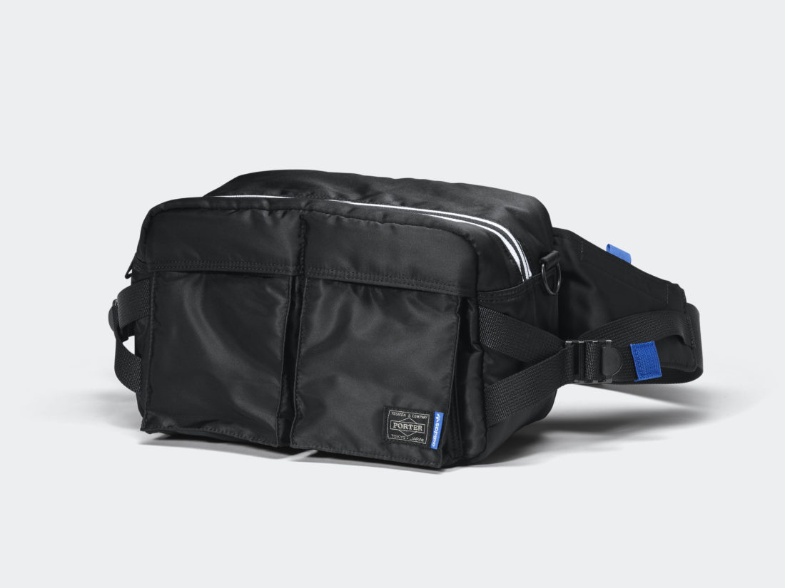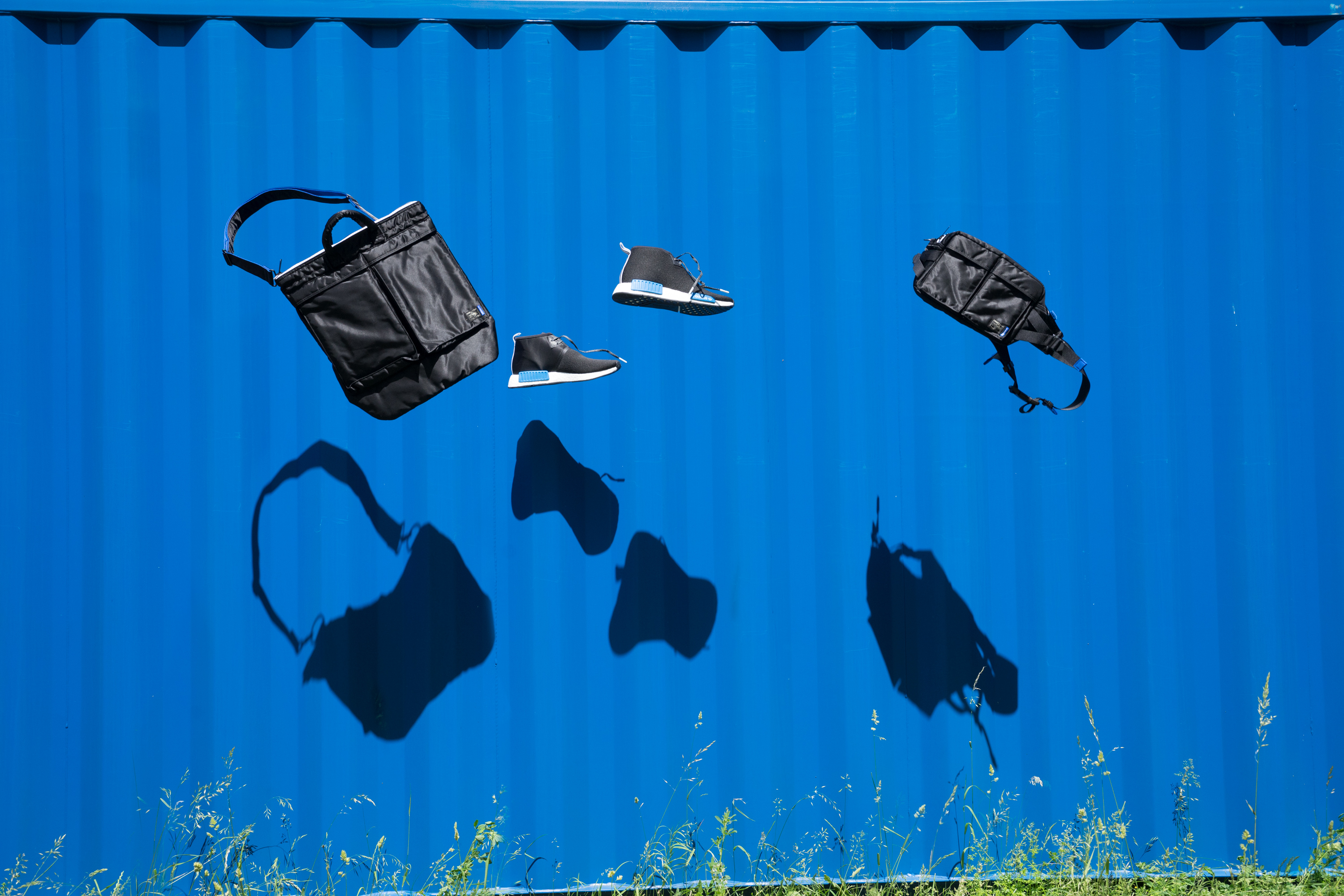 In dieser kleinen aber starken Kollektion finden wir zwei Key Pieces von Porter, die Helmet Bag und die Waist Bag, die jeweils in klassischem schwarzen Nylon mit adidas-blauem Lining kommen und mit diversen weiteren adidas Details versehen wurden. Ein schwarzer NMD C1 mit farblich passenden blauen Details komplettiert das Pack und weist zusätzlich auf dem Upper zum Teil das typische Tanker-Nylon auf.