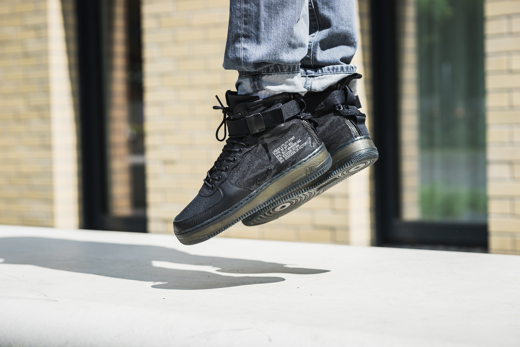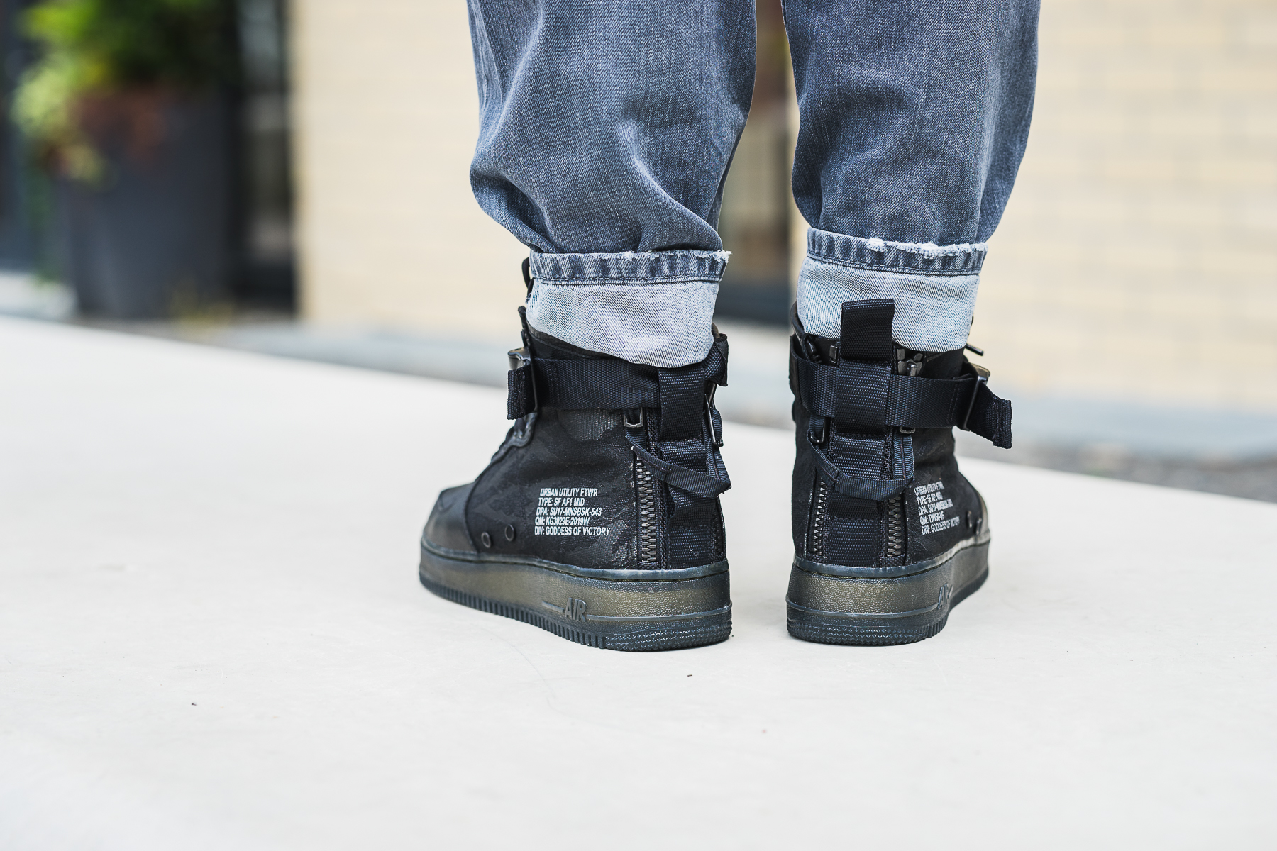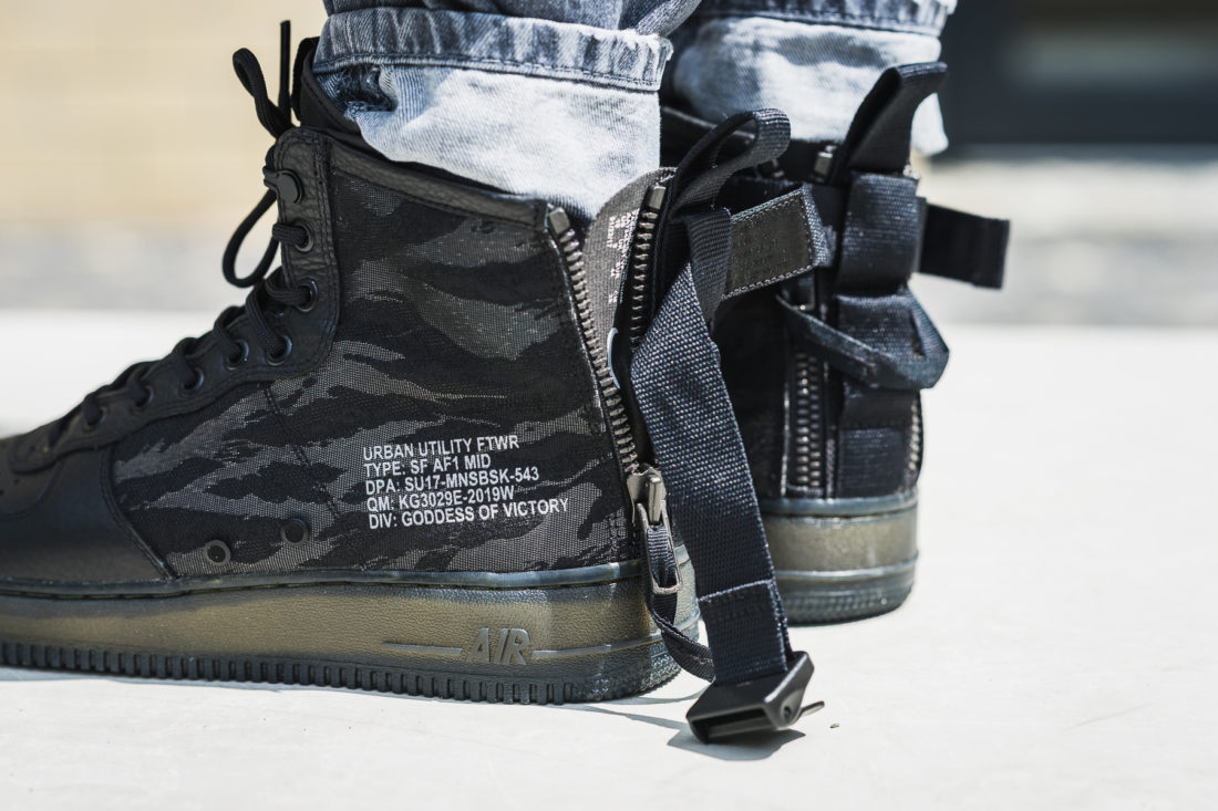Bei diesem Drop kommt der SF-AF1 in einem Matrialmix aus hochwertigem schwarzen Leder und Ballistic Nylon in schwarzen Tiger Camo. Dazu kommt ein Knöchelstrap und Reissverschlüsse an der Ferse.