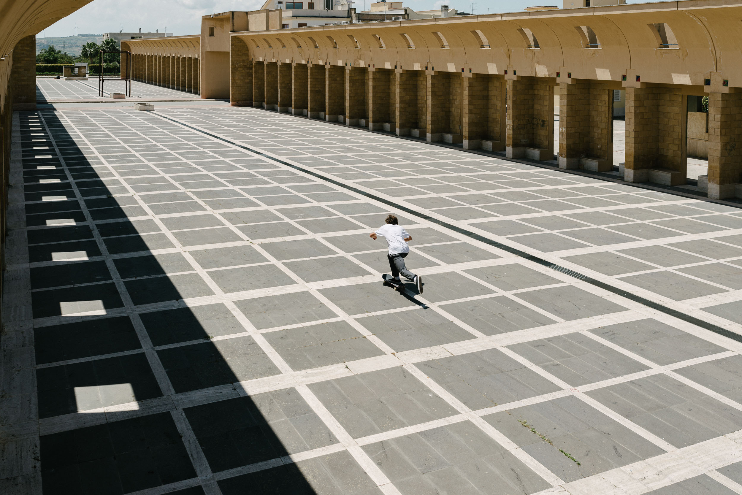 Das Video wurde in Gibellina Nuova gedreht, eine kleine Stadt im Westen Siziliens und bei der handelt es sich um keinen gewöhnlichen Ort. Das “Nuova” bezieht sich nämlich darauf, dass es vorher schon ein Gibellina gab, welches 11km entfernt war und 1968 durch ein Erdbeben zerstört wurde. Und die Rekonstruktion der Stadt zeichnet sich dadurch aus, dass sie von den damals bekanntesten italienischen Künstlern und Architekten designed wurde. Dadurch macht Gibellina Nuova streckenweise den Eindruck eines Freilichtmuseums und bietet für das Skatevideo eine außergewöhnliche Umgebung.