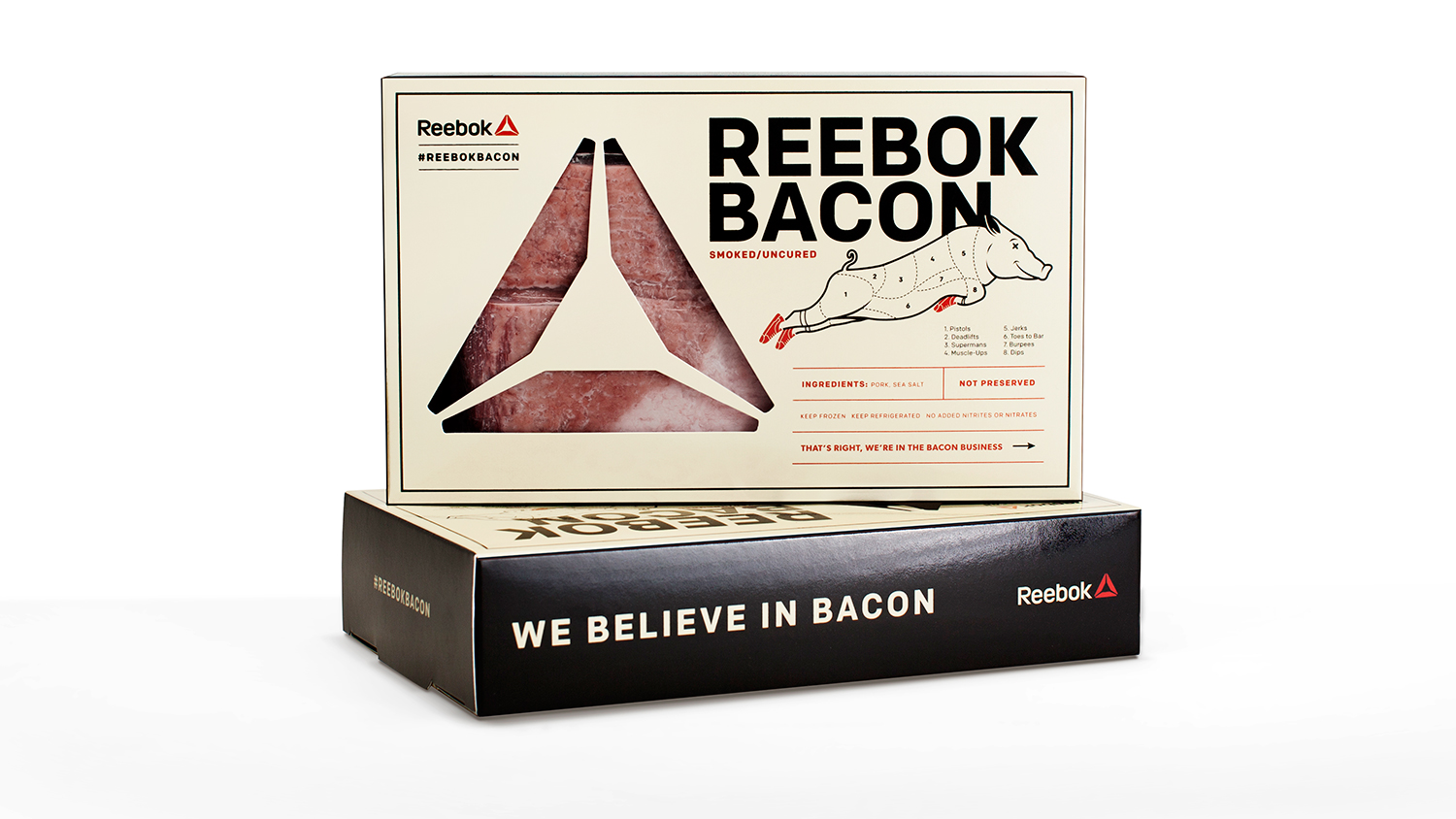 Anlässlich der Crossfit Games im Jahr 2014 hat Reebok dieser Vorliebe Tribut gezollt, in dem das Brand 74 Packungen mit unbehandeltem und nach allen Paläo-Richtlinien einwandfreien Schinken an die Teilnehmer des Wettbewerbs geschickt haben, die diese Steinzeitdiät befolgen. Das ganze natürlich hygienisch einwandfrei und in einer eigens dafür designten Verpackung, auf der groß “Reebok Bacon” stand, Nährwertangaben angegeben waren und ein Bekenntnis an den Bacon aufgedruckt war.