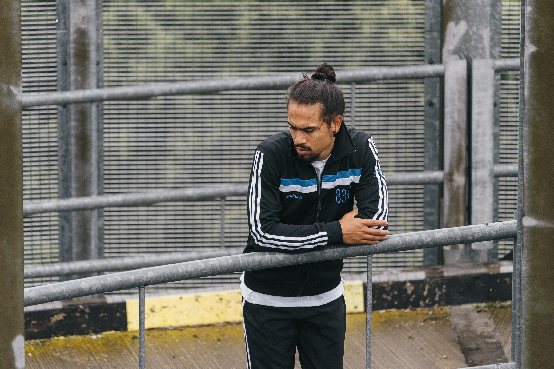 Das adidas 83-C Tracktop ergänzt den Look perfekt und mit dem adidas Tubular Shadow in Triple Black wird das ganze Outfit abgerundet.