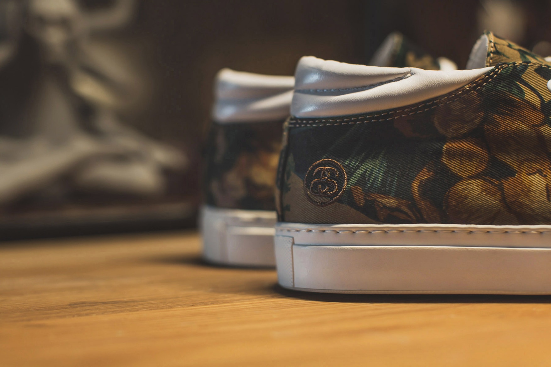 Für diese Zusammenarbeit hat Stussy das Oberteil des Chukkas mit einem Hokkoh-Stoff mit Blumenprint überarbeitet und einen kontrastierenden weißen Lederkragen hinzugefügt. Ein tonales Stussy Branding, weiße Schnürsenkel und eine weiße vulkanisierte Sohle vervollständigen das Look für diese Modell des italienischen Brands.
