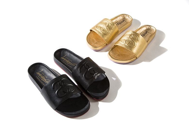 Hier haben wir die erste Kollabo speziell von Stussy Women, bei der mit Solestruck aus Portland zusammen gearbeitet wurde, um pünktlich zum Frühjahr 2015 zu ein paar Slides heraus zu bringen. Diese kamen in zwei Colourways, Schwarz und Gold. Sie bestehen aus 100% Leder mit einer zusätzlichen Unterstützung für das Fußgewölbe und einem geformten Fußbett, das mit Stussys SS-Link-Prägung versehen ist.