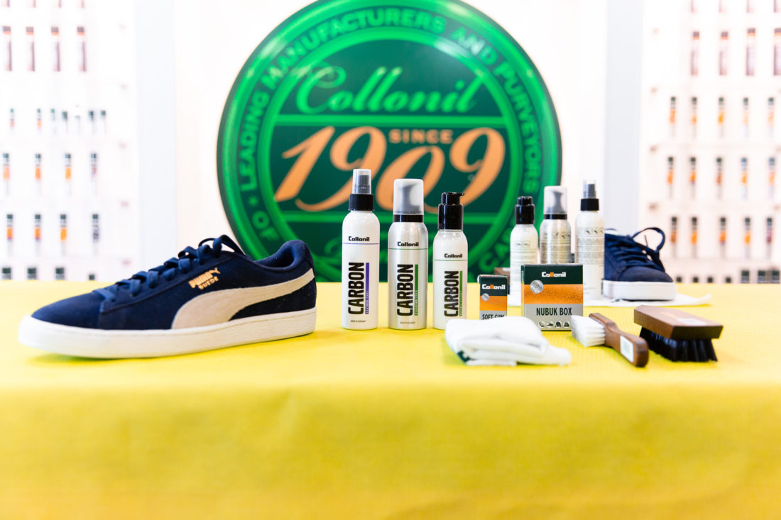 Nach einem sehr interessantem Austausch hieß es aber, die Theorie Theorie sein zu lassen und sich an die praktische Ausführung der eben gehörten Profitipps zu machen. Dazu hat Collonil von PUMA ein paar Schuhe bekommen, die im Vorfeld schon dreckig gemacht wurden. An diesen Probestücken konnte man dann die breite Produktpalette an Reinigungsmitteln und -geräten ausprobieren und nachdem sich jeder austoben konnte ging der Workshop auch dem Ende zu. Als Abschiedsgeschenk gab es noch einen Beutel, prall gefüllt mit den wichtigsten Produkten aus der Collonil Carbon Serie, mit denen man bestens ausgestattet ist, um so ziemlich jeden Fleck beseitigt zu bekommen.