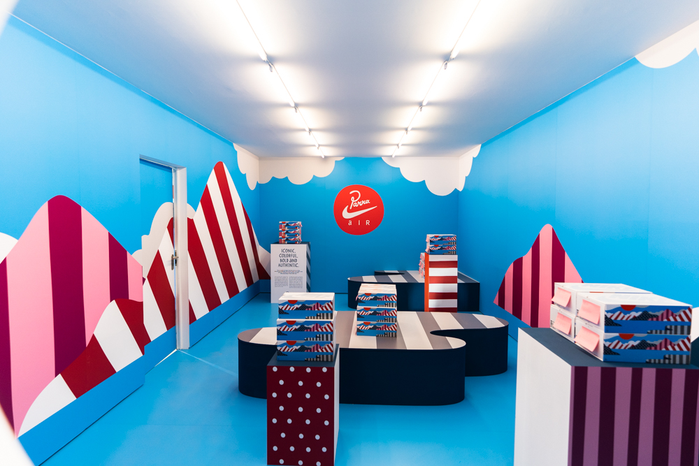 Besonders hervorzuheben sind die Details von Nike Serviettenhaltern, über Parra Gläsern bis hin zu Parra x Nike Untersetzern – wirklich sehr liebevoll umgesetzt. Und bevor es dann ans Essen ging, gab es auch noch Geschenke für alle Gäste in Form vom Air Max 1, dem Trainingsanzug und einer gebrandeten Sprühdose. Und das Essen war ebenfalls großartig.