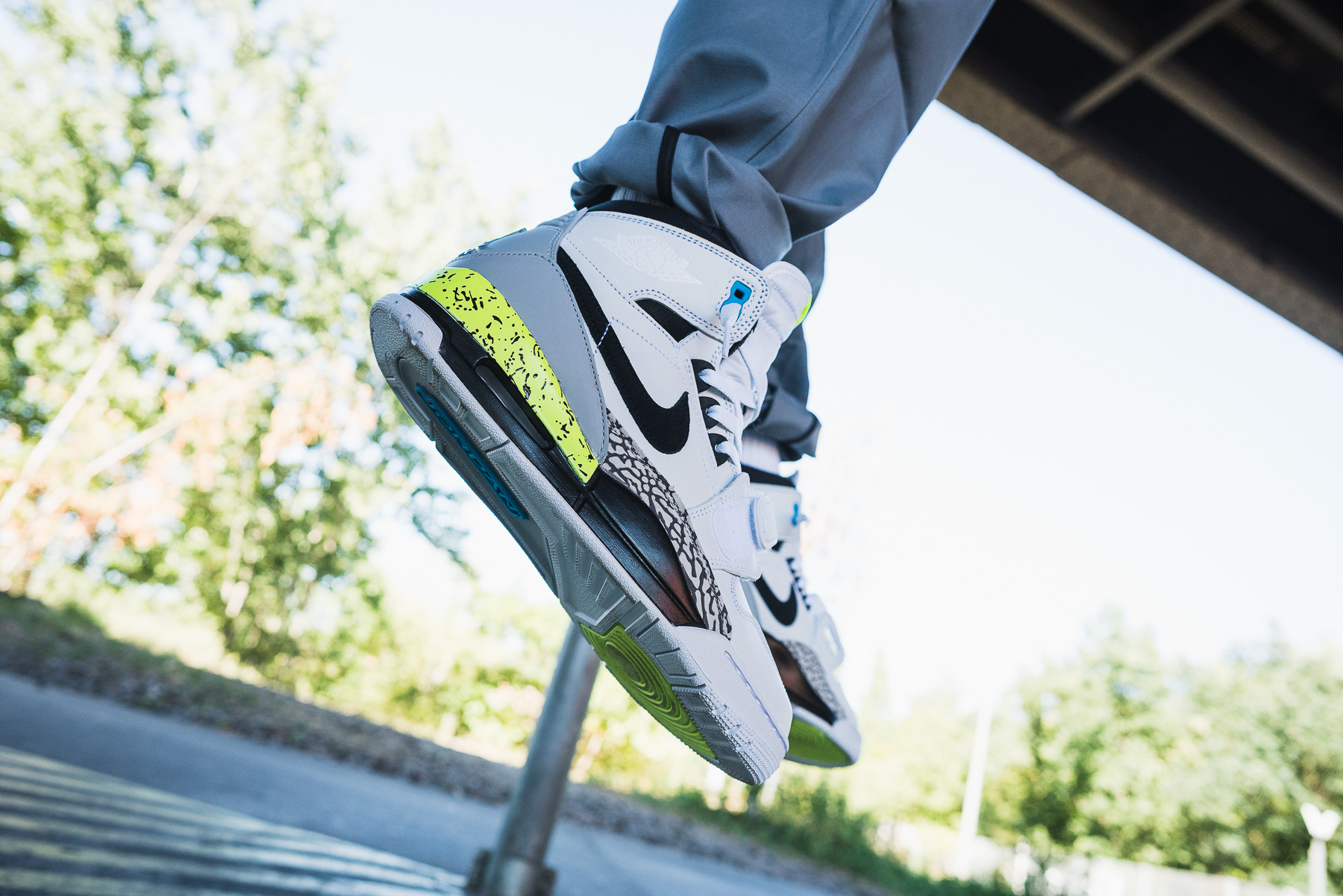 auf dem Schaft und dem allgemeinen Panneling des Uppers, den Air Jordan 3 an der Heel Konstruktion, der Sohle und dem ikonischen Elephant Print im Bereich des Mittelfußes, sowie einen weiteren Schuh, der durch den Strap angedeutet wird. Dieser könnte zu einem Nike Air Trainer oder auch dem Nike Air Revolution gehören. Tatsächlich soll der Strap für den Nike Alpha Force Low stehen, der das dritte Modell im Hybrid-Bunde ist. Der Grund, dass die Wahl für den Legacy 312 auf diesen eher unbekannten Schuh gefallen ist liegt darin, dass Michael Jordan, den der Chicago Native Don C sein ganzes Leben bewundert hat, zwischen dem