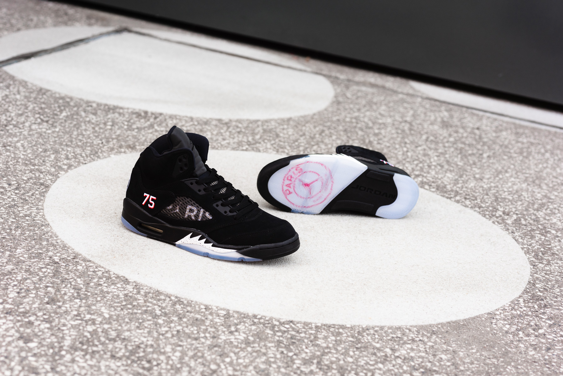 Auf dem äußeren Heel befindet sich statt der gestickten 23 eine gestickte 75. Jordan Brand verweist damit auf den Postleitzahlencode von Paris und nimmt gleichzeitig Bezug auf den Air Jordan 10 “Paris” aus dem Jahr 2016, bei dem dieses Thema ebenfalls verwendet wurde. Ein weiteres Feature ist das Lettering “PARIS” unter dem seitlichen, für den Jordan 5 typischen Gitter. Dabei wurde im Wort Paris der Jumpman an die Stelle des As gesetzt. Auf der schwarzen Zunge ist ein schwarzer Jumpman gestickt. Sowohl auf der Innenseite der Zunge, als auch auf der Innensohle sind die Worte “ICI C’EST PARIS” zu lesen, was so viel wie “Hier ist Paris” bedeutet. Dabei handelt es sich um einen markenrechtlich geschützten Schlachtruf der Ultras von Paris Saint-Germain, den der Verein frei benutzen darf und mit dem er eine Menge Geld verdient. Interessanter Weise reichte das “PSG” nicht. 2016 zog der Verein gegen die eigenen Ultras vor Gericht, um als einziger den Slogan verwenden und mit ihm Geld verdienen zu können. Ein erstes, geradezu lächerliches Kaufangebot für “ICI C’EST PARIS” von PSG über € 2000 war zuvor von den Fans abgelehnt worden, bedenkt man, dass der Verein Einnahmen in Millionenhöhe durch Merchandising mit dem Slogan erwirtschaftet.