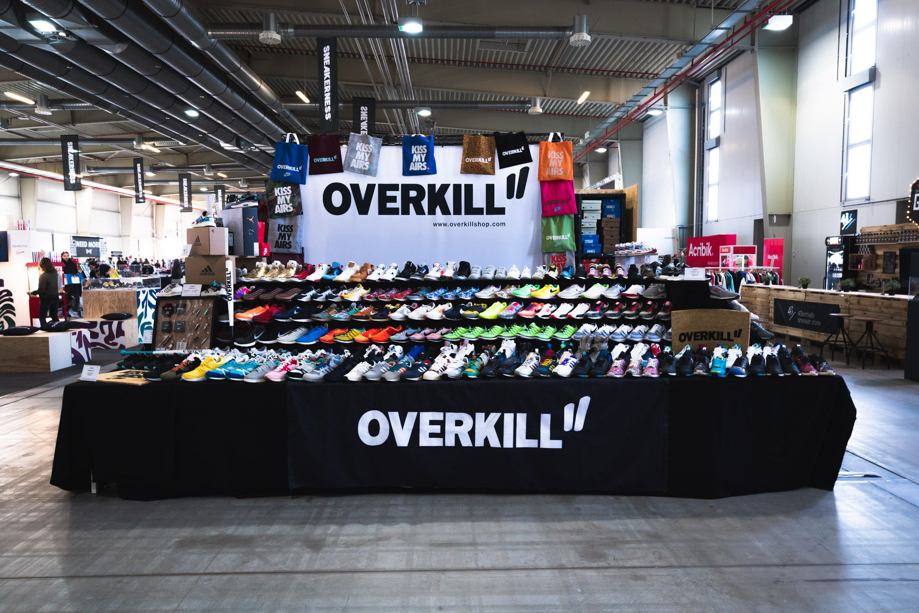 Die Sneakerness gehört weltweit zu den führenden Turnschuhmessen und findet regelmäßig in diversen Städten in Europa statt. Der jährliche Termin in Köln ist Pflicht für das #Teamoverkill und so machten wir uns am Freitagmorgen auf Richtung Westen. Mit zwei Autos waren wir unterwegs, die bis oben hin mit feinster Ware vollgepackt waren! Nachdem wir angekommen sind, haben wir den restlichen Abend genutzt, um unseren Stand aufzubauen und uns seelisch auf die Sneakerness Köln 2018 vorzubereiten. Eine Unmenge an Schuhen wurde drapiert, von Vintage über klassische Releases bis hin zu limitiertem Hype war alles dabei.