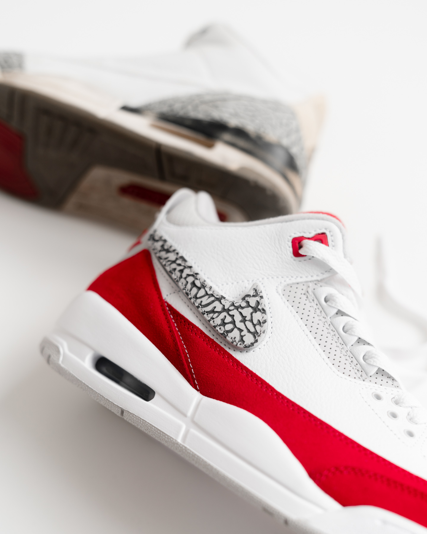 Swoosh, anders als zuvor, austauschbar ist. Mit dem Schuh kommen insgesamt vier verschiedene Swooshes in Rot, in Weiß, mit “Elephant Print” und als “Reflective”, also vermutlich mit 3M. Auf der Innenseite hingegen sehen wir ein in grau gesticktes NIKE Lettering. Das Upper selber ist aus weißem, genarbtem Leder. Ebenfalls weiß sind das Lining und die Mittelsohle. Am Schaft, der Zunge und dem Eyestay ist eine leichte Perforation zu erkennen. Diese Bereiche sind, genau wie die Außensohle und das Heel Tab, eher grau gehalten. Das Air Max inspirierte University Red sehen wir an den Overlays des Uppers. Sie sind aus Suede, was man auch nicht allzu häufig an einem Jordan 3 findet. Außerdem sind das Nike Air Branding auf dem Heel, der Jumpman auf der Zunge, sowie die Innenseite der Zunge rot. Das oberste Loch des Lacing kommt ebenfalls im University Red. Als kleines Detail ist Tinker Hatfields Signature auf die Innenseite der Zunge gedruckt.