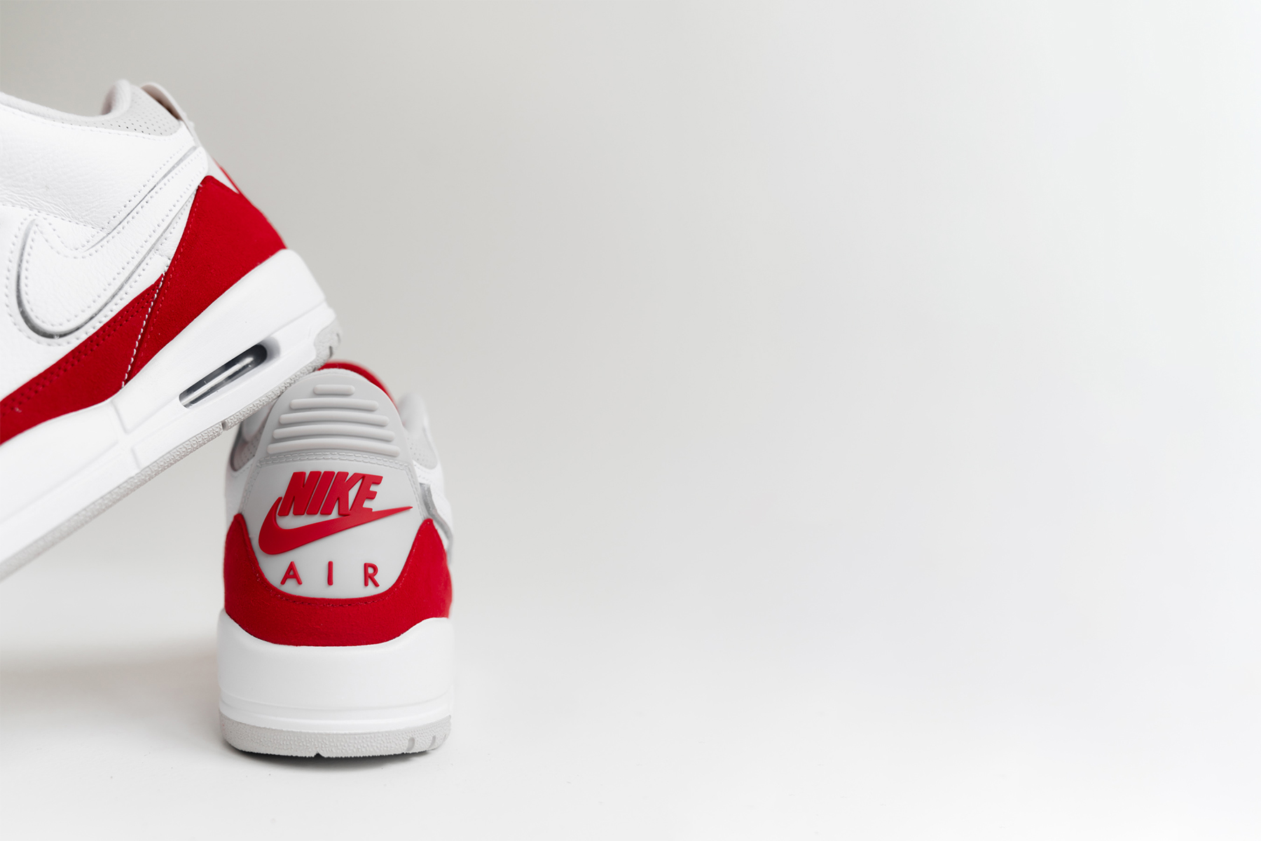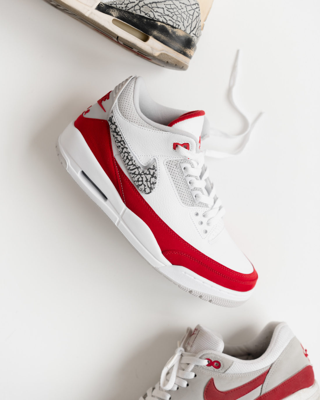 Swoosh, anders als zuvor, austauschbar ist. Mit dem Schuh kommen insgesamt vier verschiedene Swooshes in Rot, in Weiß, mit “Elephant Print” und als “Reflective”, also vermutlich mit 3M. Auf der Innenseite hingegen sehen wir ein in grau gesticktes NIKE Lettering. Das Upper selber ist aus weißem, genarbtem Leder. Ebenfalls weiß sind das Lining und die Mittelsohle. Am Schaft, der Zunge und dem Eyestay ist eine leichte Perforation zu erkennen. Diese Bereiche sind, genau wie die Außensohle und das Heel Tab, eher grau gehalten. Das Air Max inspirierte University Red sehen wir an den Overlays des Uppers. Sie sind aus Suede, was man auch nicht allzu häufig an einem Jordan 3 findet. Außerdem sind das Nike Air Branding auf dem Heel, der Jumpman auf der Zunge, sowie die Innenseite der Zunge rot. Das oberste Loch des Lacing kommt ebenfalls im University Red. Als kleines Detail ist Tinker Hatfields Signature auf die Innenseite der Zunge gedruckt.