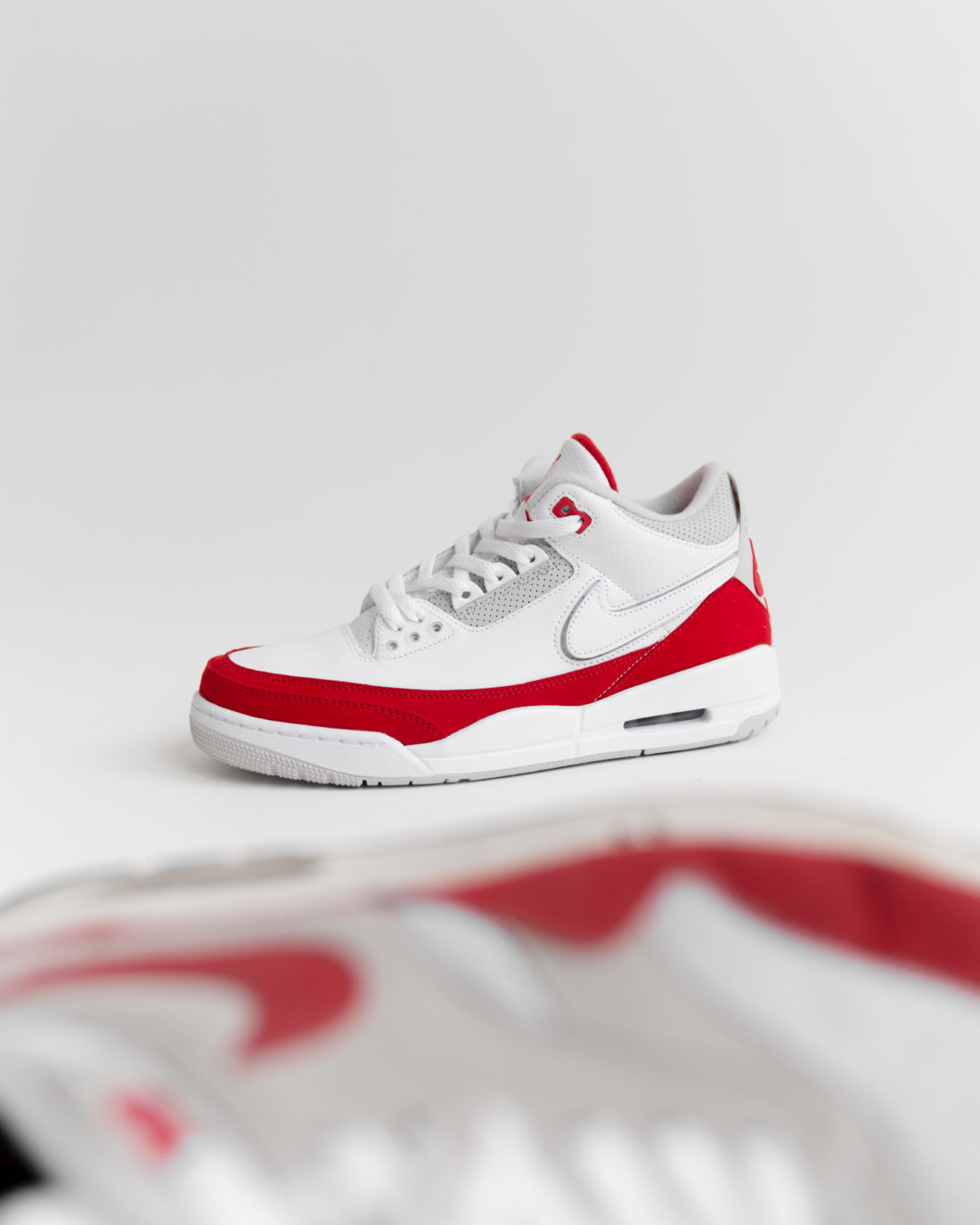 Seit ein paar Tagen ist ausschließlich in unserem Onlineshop der hier präsentierte Air Jordan 3 Tinker im White/ University Red-Neutral Grey Colorway zu haben. Angelehnt ist diese Farbkombination an den vielleicht beliebtesten Colorway des Nike Air Max 1, der ja bekanntermaßen genauso der Kreativität Tinker Hatfields entsprungen ist, wie auch der Air Jordan 3. Man kann jetzt durchaus sagen, dass sich hier zwei Kreise zusammen fügen, die im Jahr 2018 noch voneinander getrennt waren. Zum einen ist im letzten Jahr der Air Jordan 3 “Tinker” in verschiedenen Colorways auf den Markt gekommen, der angeblich der erste Entwurf des unverwechselbaren Nike Air Jordan 3 war, und der damals in diesem ersten Entwurf noch einen Swoosh aufwies. Zum