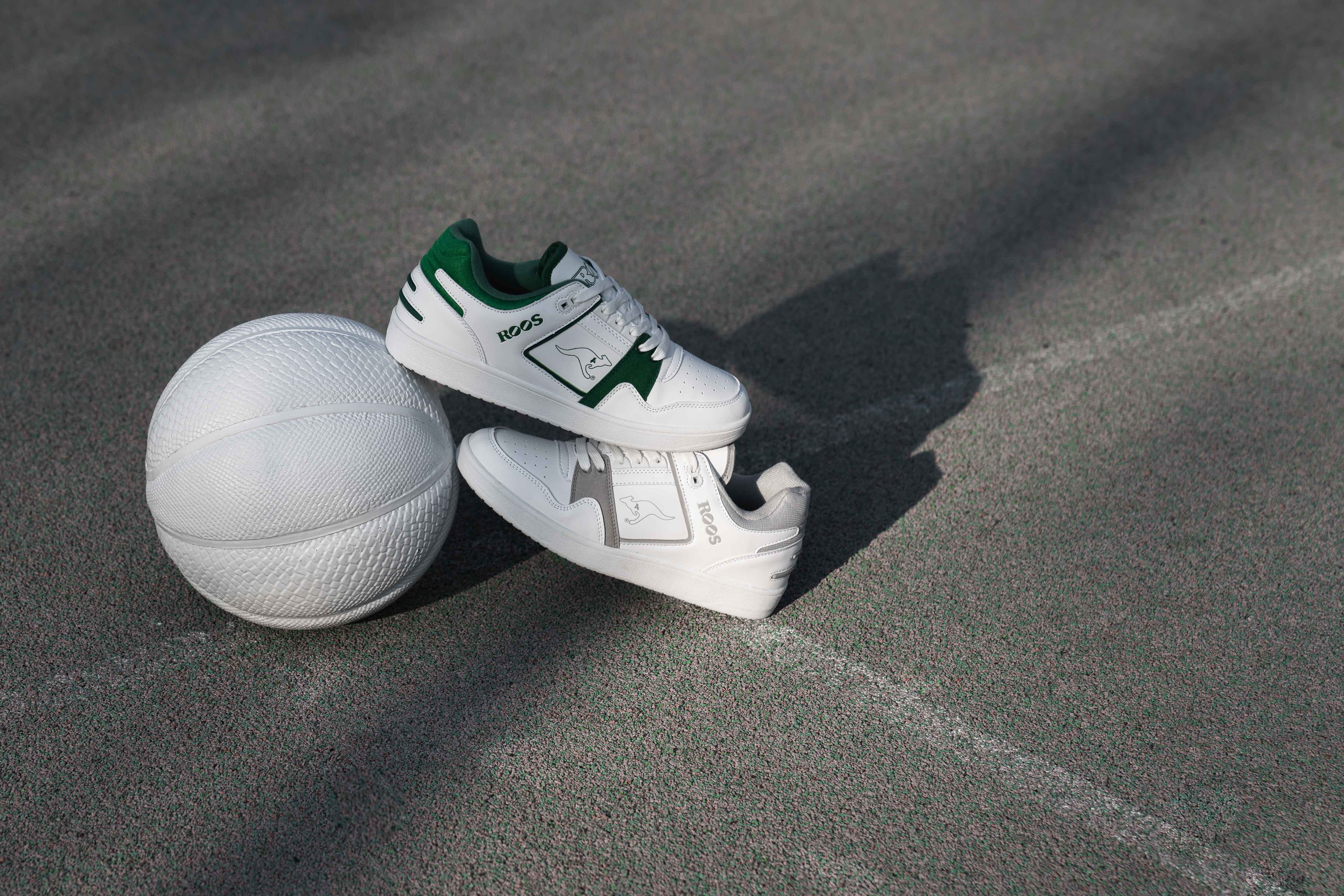 Bei uns im Overkill Store sind mittlerweile zwei Colorways des flachen Retro Basketballschuhs zu bekommen. Schon seit einigen Wochen ist die weiß-graue Variante des Schuhs erhältlich, seit einigen Tagen steht jetzt auch der weiß-grüne Hot Shot in den Regalen. Beide Schuhe haben eine weiße Base aus synthetischem Glattleder. Ebenfalls aus diesem Material ist das weiße Overlay, das sich 80er Jahre-typisch um den Hacken zieht. Die Toebox ist zur anständigen Belüftung des Fußes natürlich perforiert. Geschützt wird die Toebox vom weißen Mudguard. Auf dem Layer, der sich im Mittelfußbereich befindet, sehen wir das ROOS-Lettering in Grau, bzw. in Grün. Colorway-entsprechend hat dieser Layer eine auffällige Paspelierung, die einen farbigen Akzent setzt. Im Sidepanel befindet sich das farblich passende Brand-Label. Der Übergang zum Vorderfuß wird durch ein Overlay aus synthetischem Suede verstärkt. Das ebenfalls farbige Heel Tab ist aus Mesh und unterbricht das Leder des Hackens an zwei weiteren Stellen – “80s Design at ist best” eben. Das gefütterte Lining macht diesen Schuh sehr bequem und sorgt für ein angenehmes Tragegefühl, welches durch die geschäumte EVA-Mittelsohle und die Dynacoil-Dämpfung unterstützt wird. Farblich hat man sich bei der Sohle nicht ganz ans Original gehalten. Hier sehen wir eine komplett weiße Sohle, wohingegen beim OG lediglich die Mittelsohle weiß war, die Außensohle aber farblich passend zur zweiten Farbe des Uppers gestaltet war. Abgerundet wird dieser tolle Retro Basketball-Sneaker vom fetten ROOS Lettering auf der Zunge, die selbstverständlich auch eine kleine Pocket auf der Innenseite beherbergt. Was wäre ein KangaROOS Schuh auch ohne diese praktische Tasche? Was da alles rein kann….