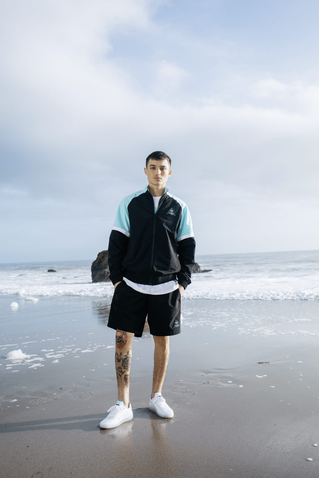 Das zweite bei uns erhältliche Modell ist der PUMA Cali-O, der mit einem weißen Lederupper daherkommt und das Diamond Blue zurückhaltend am Lining, sowie am seitlichen PUMA Lettering einsetzt. Das Upper sitzt auf einer durchsichtigen Icy Sole. Beide Modelle haben ein Co-Branding auf dem Zungenlabel, sowie ein keines, in Diamantenform geshaptes Heeltab. Neben diesen beiden Schuhmodellen kommen auch zwei farblich matchende Kleidungsstücke in den Verkauf. Zum einen wird eine Shorts, zum anderen ein XTG Track Top erhältlich sein. Die Short ist im Wesentlichen schwarz, wird seitlich aber durch einen Diamond Blue/ weißen Streifen komplementiert. Auf dem linken Bein prangt ein kleines Diamond Supply Co. x PUMA Logo. Dasselbe Logo ist auch auf der Brust des Track Tops zu finden, die ebenfalls hauptsächlich schwarz ist. Der obere Teil der Ärmel samt Schultern und Collar sind Diamond Blue, ein schmaler weißer Streifen trennt die beiden zuvor beschriebenen Bereiche.
