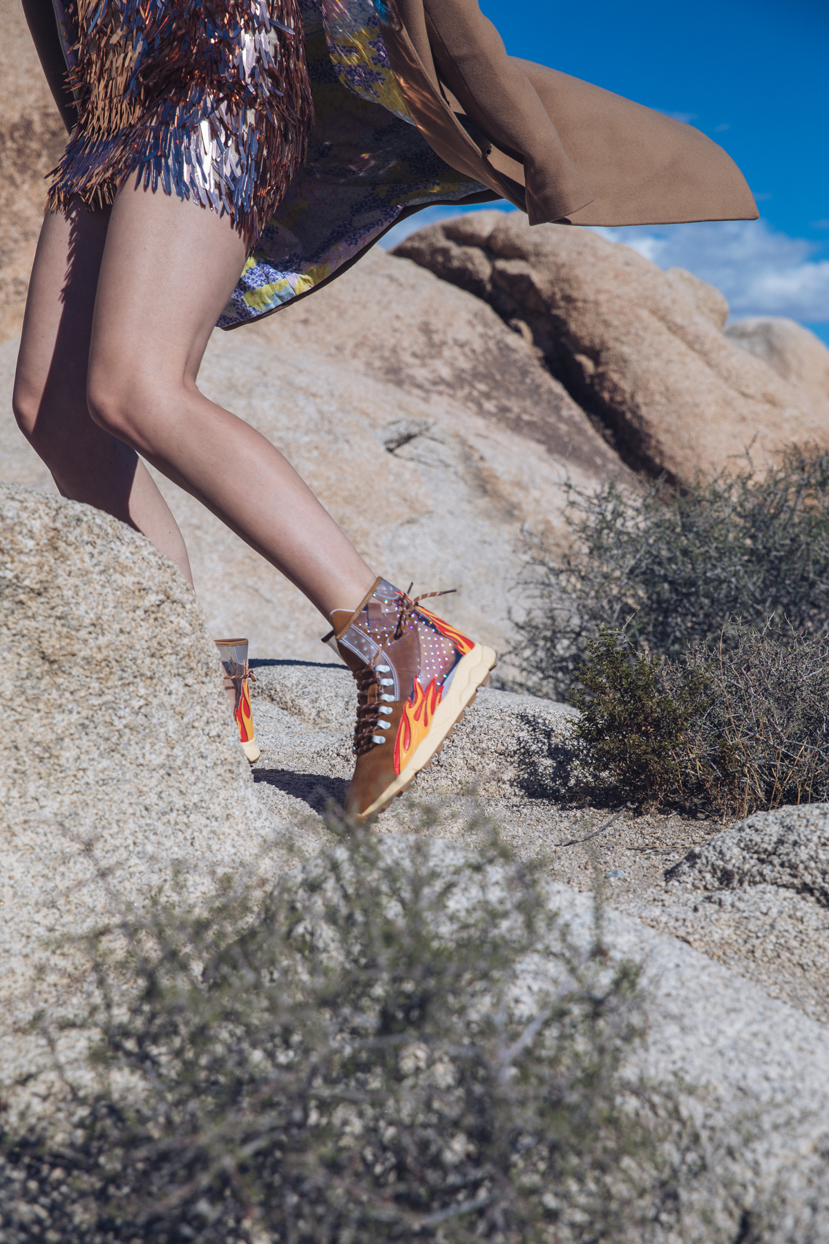 Ehrlich gesagt ist einen Sneaker zu designen ne recht tricky Angelegenheit. Zumal für Fashion Frauen wie uns. Wir tragen zu 70 % Sneaker privat aber eben in Kombination mit sehr modischen Sachen. Das heißt, wir mussten für uns das Sneaker Thema einmal völlig neu konzipieren und uns von allem lösen, was wir bis jetzt gesehen haben. Auch was die Materialien, Shape und den Umgang mit Design angeht. Klassischerweise würde man beim Sneaker vielleicht mit Farben spielen. Unsere Flammen Applikationen haben alle bei Djinns ganz schön ins schwitzen gebracht, da man beim Sneaker eigentlich nichts drauf näht. Noch schlimmer waren produktionstechnisch unsere Stoffeinsätze am Bein, die halb transparent und anschmiegsam am Bein sein sollten damit man den Sneaker eng binden kann. Für feminine Stylings zu kurzen Kleidern und Shorts. Um aber nicht alle in den Wahnsinn zu treiben mit unseren Ideen, haben wir eine bereits bestehende Sohle von Djinns aus der Männer Kollektion gewählt.