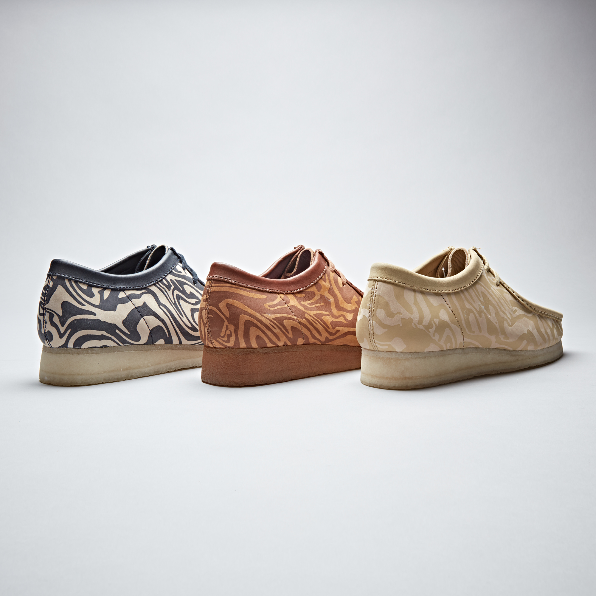 auf der Wallabee-typischen Kreppsohle, die beim Navy- und Maple-Colorway seine natürliche helle Farbe behalten hat. Beim braunen Wallabee ist sie farblich dem Upper angepasst und in einem Honigbraun gehalten. Das Design des Uppers erinnert an die in den Lyrics beschriebenen Farbmischungen. Wenn man zwei cremige Eissorten miteinander mischt entstehen solche geswirlten Muster, fast schon marmorartig anmutend, einfach lecker. Das Trimming ist aus klassischem Leder, genau wie das Lining. Ein Wu Wear Branding ist zum einen auf der Einlegesohle zu finden, zum anderen aber auch auf den Clarks Hang Tags, die wie gewohnt aus Leder sind und an den Laces hängen. Kann man dran lassen, muss man aber nicht, man fällt mit diesen Schuhen sowieso auf, Wu-Hang Tag hin oder her…