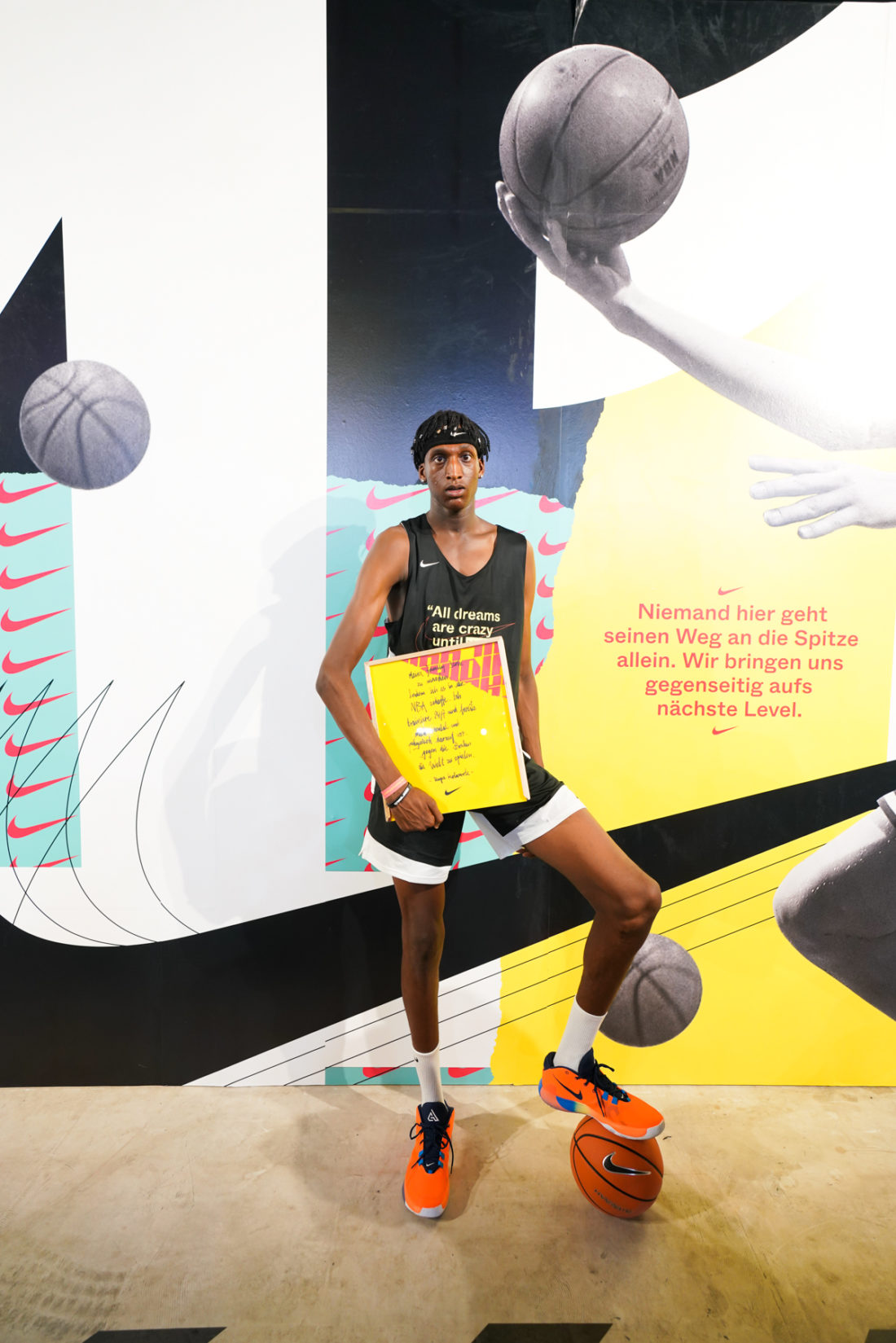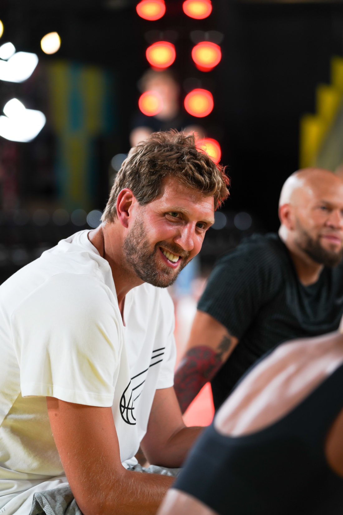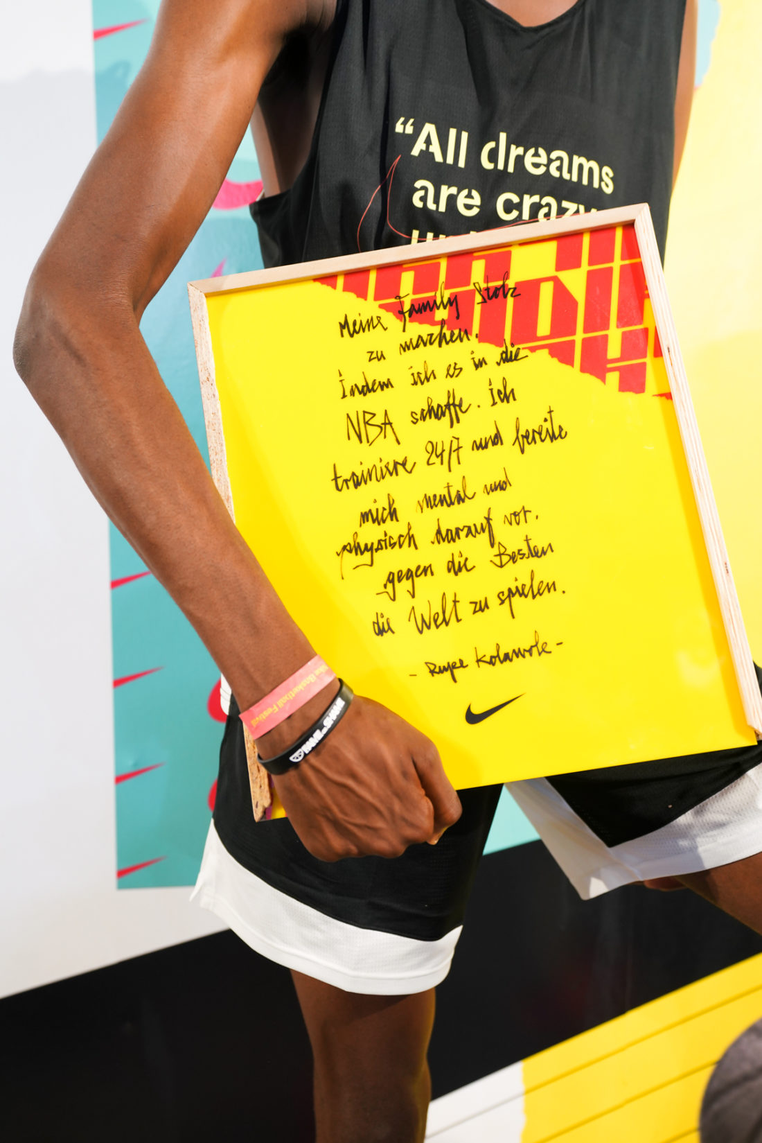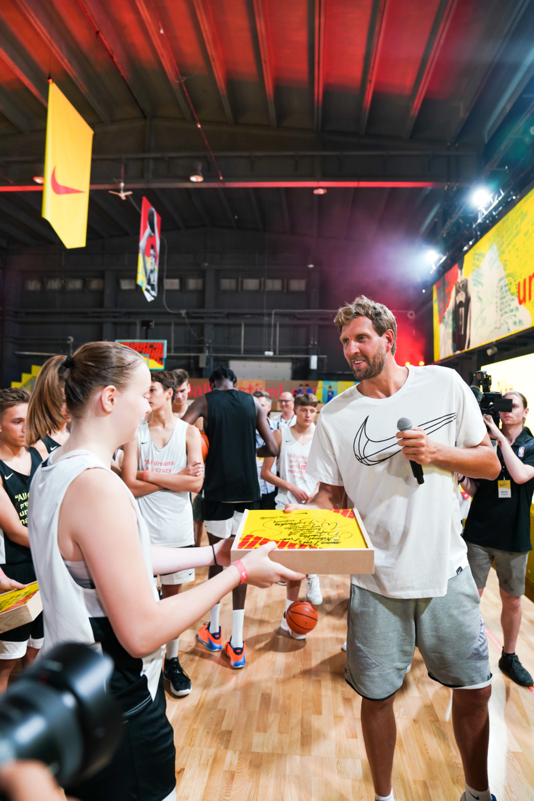 und sollte den Nachwuchs natürlich motivieren, an den eigenen Träumen festzuhalten, egal wie verrückt sie anderen erscheinen. In der Halle hatte Nike eigens einen Basketball Court aus Parkett aufgebaut, auf dem die eingeladenen Sportler tagsüber mit zwei weiteren deutschen NBA Stars ein paar Trainingssessions durchführten. Der gebürtige Berliner Moritz “Mo” Wagner von den Washington Wizards und der ursprünglich aus Braunschweig stammende Dennis Schröder, Spieler der Oklahoma City Thunder, kamen eigens zum Nike Basketball Festival um sich Dirks Ehrentag nicht entgehen zu lassen, den Nachwuchsspielern ein paar Tipps und Tricks zu geben und ihnen ein paar Moves beizubringen.