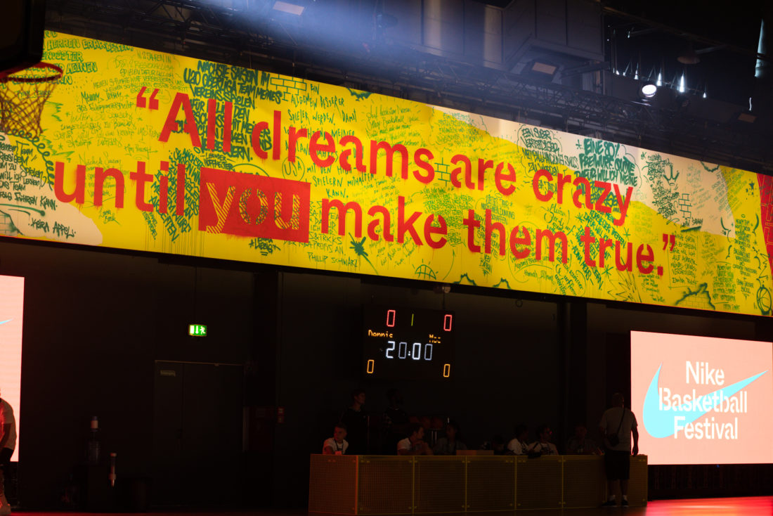 Vor knapp drei Wochen konnte man durch die Nike+ App erfahren, dass Dirk Nowitzki am 27. Juli nach Berlin zum Nike Basketball Festival kommen würde. Es stellte sich heraus, dass es eine Veranstaltung ihm zu Ehren werden sollte, auf der ihm und seiner unfassbaren, unvergleichlichen Karriere gehuldigt werden sollte. Dabei stand das Motto des langen Blonden aus Würzburg als zentraler Slogan über der Veranstaltung: “All Dreams Are Crazy Until You Make Them True”. Ein Spruch, den Nike im Jahre 2011 rausgehauen hat, um Dirks gerade gewonnene Meisterschaft zu feiern. Das Nike Basketball Festival fand in einer umgebauten Lagerhalle im Wriezener Karree statt. Auf riesigen Grafiken war der Spruch in der Halle zu lesen. Er erinnerte die jungen deutschen Basketballtalente aus Berlin und ganz Deutschland daran, dass man es mit der richtigen Einstellung schaffen kann