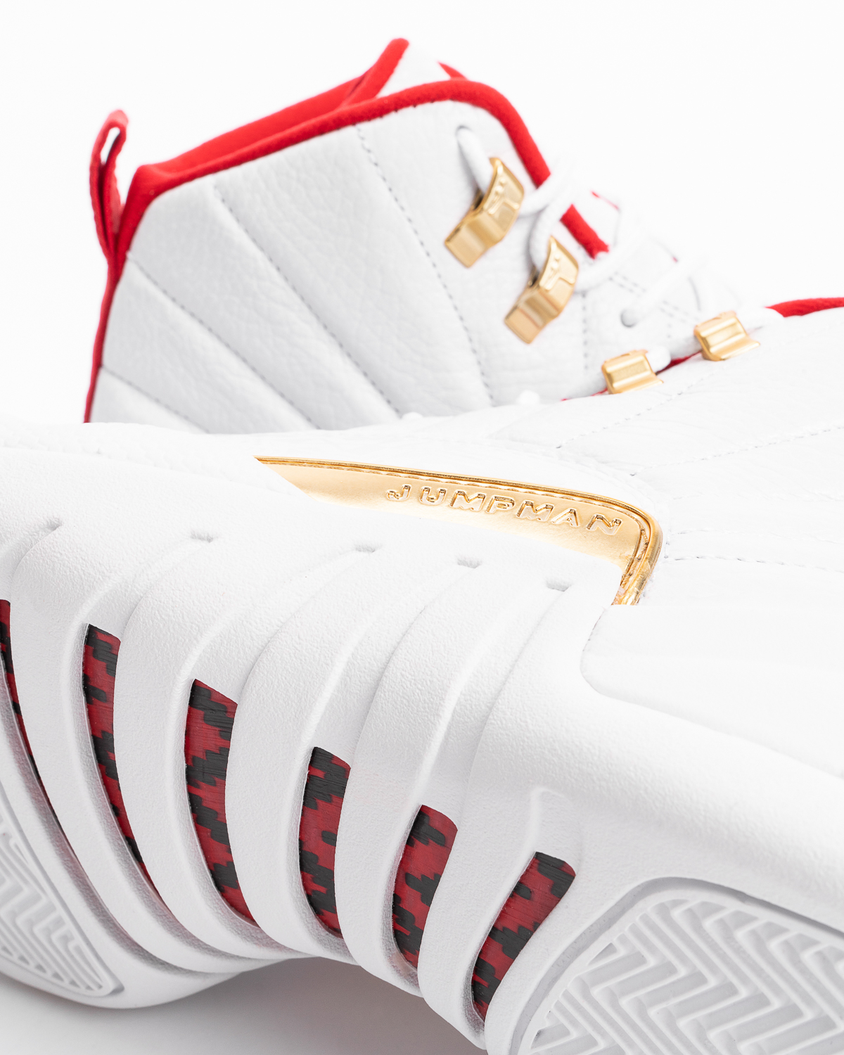 Der Schuh hat eine weiße Base aus einem schönen “Tumbled Leather”. Auf dem weißen Mudguard sind weiße Grafiken gearbeitet, die so etwas wie Flaggen darstellen. Ebenfalls in Weiß kommen die Zunge, das Lacing und die Sohle. Goldene Akzente sitzen seitlich außen und innen über dem Mittelfuß in Form eines Badges, auf dem zumindest auf der Außenseite das Wort “Jumpman” geschrieben steht. Neben diesem Badge sind auch die beiden obersten Laceloops golden. Rot sehen wir am Lining, dem Branding auf der Zunge und am Heeltab, das sich bis zur Mittelsohle herunter zieht. Auf diesem roten Heeltab stehen in chinesischen Schriftzeichen die Worte “Liebe das Spiel” geschrieben. Dies soll vermutlich verdeutlichen, welch große Liebe auch die Chinesen für die geilste Sportart der Welt haben – Basketball gehört zu den beliebtesten vier Sportarten des 1,4 Milliarden Volkes. Die Außensohle wird von einer schwarz-roten Mittelfußplatte aus Carbon geprägt. Insgesamt wirkt der hier beschriebene “FIBA” Air Jordan 12, der seit langem zu den beliebtesten Jordan Modellen gehört, eher dezent und extrem clean. Hier hat sich Jordan Brand mal wieder einen wirklich gelungenen Non-OG Colorway ausgedacht, der zugleich noch eine gute Geschichte erzählt.