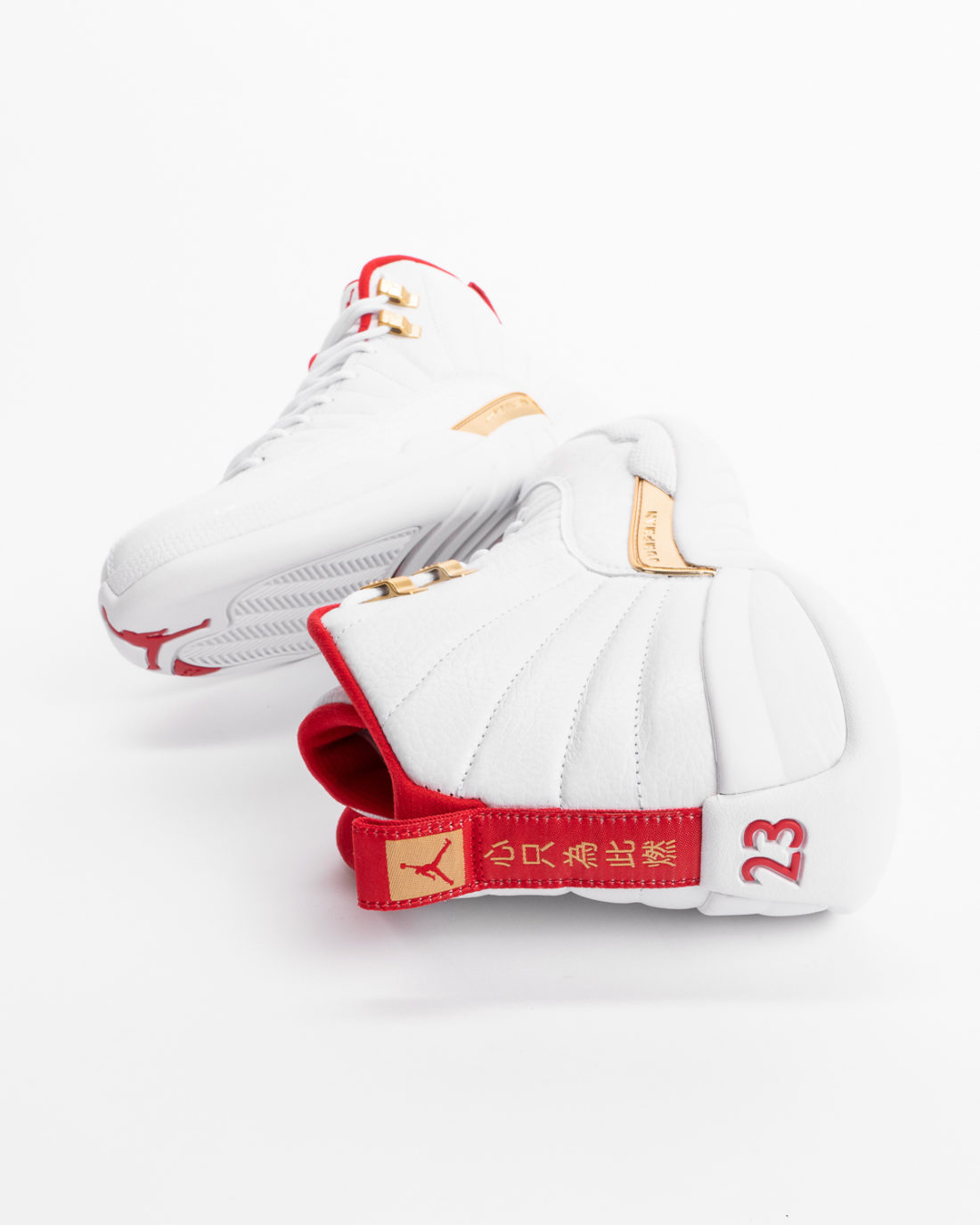 Der Schuh hat eine weiße Base aus einem schönen “Tumbled Leather”. Auf dem weißen Mudguard sind weiße Grafiken gearbeitet, die so etwas wie Flaggen darstellen. Ebenfalls in Weiß kommen die Zunge, das Lacing und die Sohle. Goldene Akzente sitzen seitlich außen und innen über dem Mittelfuß in Form eines Badges, auf dem zumindest auf der Außenseite das Wort “Jumpman” geschrieben steht. Neben diesem Badge sind auch die beiden obersten Laceloops golden. Rot sehen wir am Lining, dem Branding auf der Zunge und am Heeltab, das sich bis zur Mittelsohle herunter zieht. Auf diesem roten Heeltab stehen in chinesischen Schriftzeichen die Worte “Liebe das Spiel” geschrieben. Dies soll vermutlich verdeutlichen, welch große Liebe auch die Chinesen für die geilste Sportart der Welt haben – Basketball gehört zu den beliebtesten vier Sportarten des 1,4 Milliarden Volkes. Die Außensohle wird von einer schwarz-roten Mittelfußplatte aus Carbon geprägt. Insgesamt wirkt der hier beschriebene “FIBA” Air Jordan 12, der seit langem zu den beliebtesten Jordan Modellen gehört, eher dezent und extrem clean. Hier hat sich Jordan Brand mal wieder einen wirklich gelungenen Non-OG Colorway ausgedacht, der zugleich noch eine gute Geschichte erzählt.