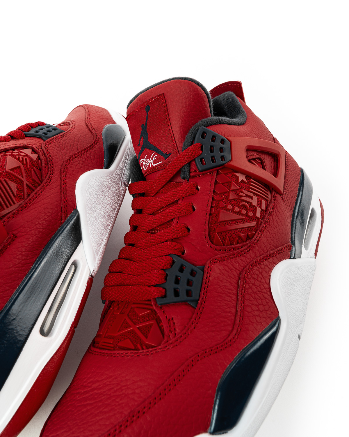 Pünktlich zu dieser Zwischenrunde erscheint am Samstag, dem 07. September der Air Jordan 4 “FIBA” mit einem roten Upper aus genarbtem Leder. Der untere Bereich der Mittelsohle ist weiß gehalten, der Übergang zum Upper kommt in einem Dunkelblau, dem sogenannten Obsidian Blue. Dies matcht mit den 4er typischen Plastikösen des Lacings und dem Lining. An der Stelle, an dem sich normalerweise das wohlbekannte und für manche beim 4er sinnstiftende Mesh Netting befindet, ist hier auf dem Quarter ein texturierter und ebenfalls in Rot gestalteter Flaggen-All-Over-Print. Dabei handelt es sich um Flaggen von teilnehmenden Mannschaften – wirklich erkennen kann man durch die Tonalität allerdings keine. Dieses internationale Flaggengewirr zeigt jedoch, dass der Colorway wohl nicht an die amerikanische Flagge in “Red, White and Blue” angelehnt ist, sondern den internationalen Gedanken des FIBA World Cups feiert. Den goldenen Jumpman auf dem Heel hat sich Jordan Brand dann doch nicht nehmen lassen, quasi als Hinweis darauf, was von dem Land mit den besten Basketballern der Welt, die leider nicht am Turnier teilnehmen, erwartet wird. Ob sich diese Erwartungen erfüllen, zeigt sich am 15. September in Peking.