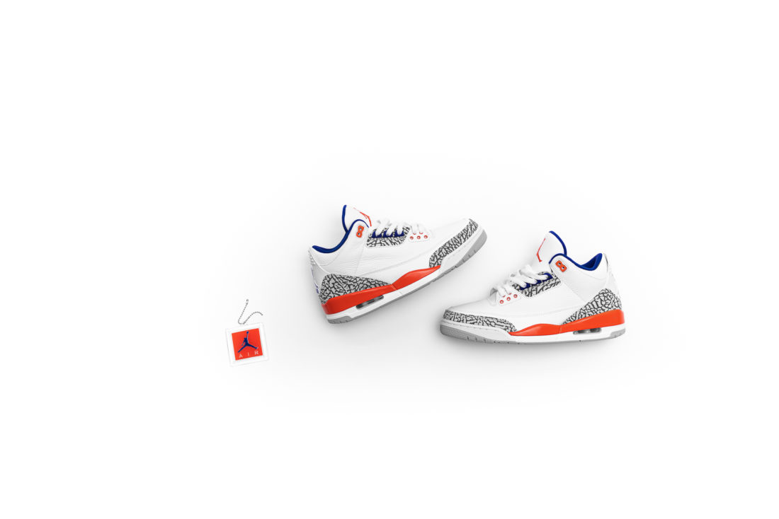 gegnerischen Team mit Patrick Ewing ein anderer absoluter Superstar dieser Zeit auf dem Parkett stand. Doch auch die besondere Beziehung zu Knicks-Edelfan Spike Lee sollte wohl bei Spielen gegen das Team aus dem Madison Square Garden eine Rolle spielen. Das oben genannte Datum des 08. Aprils 1988 findet sich jedenfalls in Form der amerikanischen Schreibweise 04.08.1988 im Inneren des Schuhs, genauer gesagt auf der Innenseite der Zunge wieder, wo es an dieses besondere Spiel erinnern soll. Insgesamt ist der Schuh wieder einmal absolut klassisch gehalten. Ein weißes Narbenleder bildet die Base des Schuhs. Der graue Elephant Print ist am Mudguard, dem Heel Overlay und dem Eyestay zu finden. Das Knickerbocker-Blau wird am Lining, den Eyelets und dem Jumpman, der das Nike Air-Branding ersetzt, auf dem Hacken verwendet. Der Jumpman statt des Nike Air-Brandings ist hier im Übrigen logisch und konsequent, da es sich beim “Knicks” AJ3 natürlich nicht um einen OG-Colorway aus dem Jahre 1988 handelt. Das für die Knickerbockers typische Orange wird flächendeckend am vom Mittelfuß um den Heel verlaufenden Midsole-Clip verwendet. Orange Highlights sind auch der Jumpman auf der Zunge, sowie einige der kleinen unteren Eyelets und das obere Eyelet. Abgerundet wird dieser Colorway des Air Jordan 3 von einer grau-blauen Außensohle.