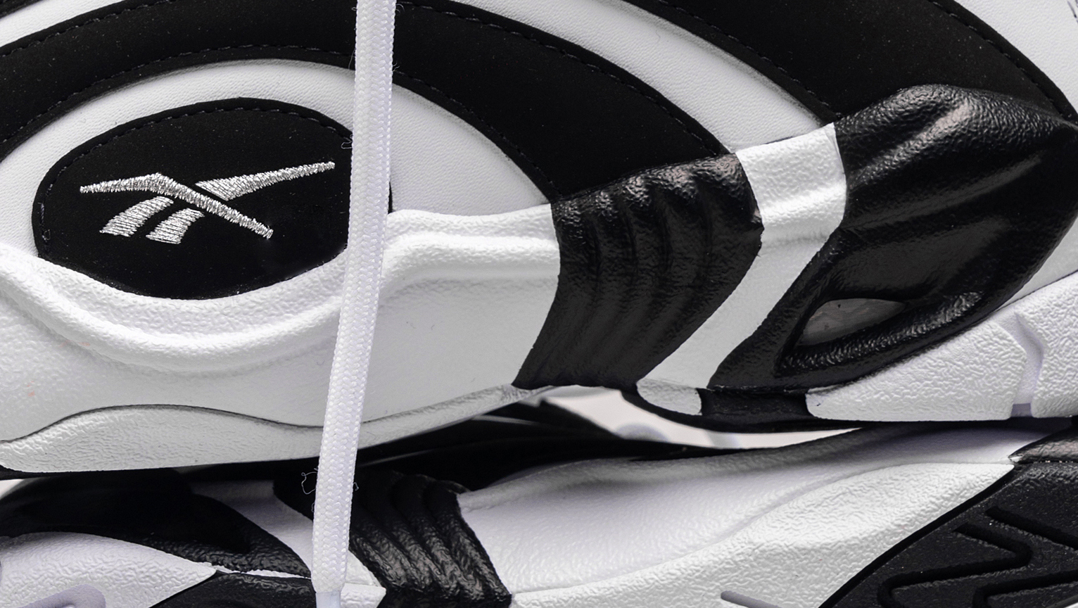 Auf der weißen Lederbase sitzen großflächig schwarze elliptische Kreise aus Nubuk, die sich auf der Mittelsohle fortsetzen. Die Mitte dieser Ellipsen bildet ein schwarzes, fast vollständiges Oval, auf welches das Reebok Vector Logo in Weiß aufgestickt ist. Im Bereich der Achillessehne befindet sich innen im Schuh eine weiche Polsterung, die für ein angenehmes Tragegefühl sorgt. Dadurch dass diese schwarze Polsterung etwas höher als der Außenschuh ist, gehört die Polsterung zur Silhoutte. An ihr sitzt ein Pull Tab, welches das Anziehen der Schuhe einfacher macht. Unter dem Pull Tab sehen wir ein weiteres schwarzes Panel auf dem sich Shaqs Markenzeichen befindet. Es zeigt das “The Green Monster“ (ein weiterer Nickname von Shaq) bei seiner Lieblingsbeschäftigung: einem krachenden, beidhändigen Dunk, bei dem er anschließend mit angezogenen Knien noch kurz am Ring hängen bleibt. Dieses gestickte Shaq-Logo finden wir außerdem noch unten auf der Zunge, direkt unterhalb des Lacings. Die Zunge selber ist recht kurz gehalten und schaut kaum über den Schaft hinaus. In der Sohle ist sowohl im Fersenbereich, wie auch im Bereich des Vorderfußes das Hexalite Dämpfungssystem verbaut. Es hat ab 1990 in Tennis-, Trainings-, Running- und Basketballschuhen von Reebok Verwendung gefunden. Durch seine wabenartige Konstruktion sollten Stöße beim Sporttreiben auf unterschiedlichem Untergrund abgedämpft werden. Bis heute ist es eine gern verwendete Technologie bei Reebok.