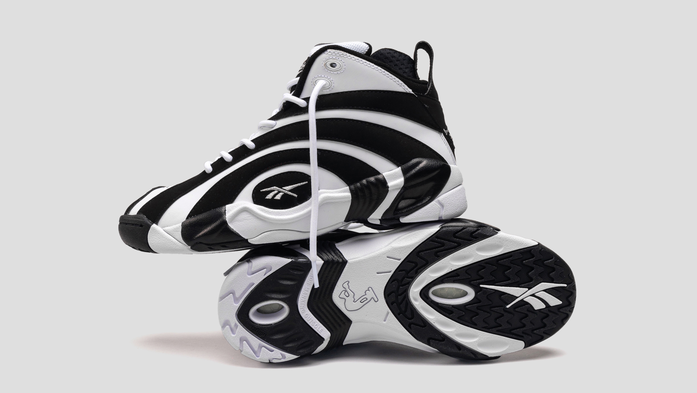 Auf der weißen Lederbase sitzen großflächig schwarze elliptische Kreise aus Nubuk, die sich auf der Mittelsohle fortsetzen. Die Mitte dieser Ellipsen bildet ein schwarzes, fast vollständiges Oval, auf welches das Reebok Vector Logo in Weiß aufgestickt ist. Im Bereich der Achillessehne befindet sich innen im Schuh eine weiche Polsterung, die für ein angenehmes Tragegefühl sorgt. Dadurch dass diese schwarze Polsterung etwas höher als der Außenschuh ist, gehört die Polsterung zur Silhoutte. An ihr sitzt ein Pull Tab, welches das Anziehen der Schuhe einfacher macht. Unter dem Pull Tab sehen wir ein weiteres schwarzes Panel auf dem sich Shaqs Markenzeichen befindet. Es zeigt das “The Green Monster“ (ein weiterer Nickname von Shaq) bei seiner Lieblingsbeschäftigung: einem krachenden, beidhändigen Dunk, bei dem er anschließend mit angezogenen Knien noch kurz am Ring hängen bleibt. Dieses gestickte Shaq-Logo finden wir außerdem noch unten auf der Zunge, direkt unterhalb des Lacings. Die Zunge selber ist recht kurz gehalten und schaut kaum über den Schaft hinaus. In der Sohle ist sowohl im Fersenbereich, wie auch im Bereich des Vorderfußes das Hexalite Dämpfungssystem verbaut. Es hat ab 1990 in Tennis-, Trainings-, Running- und Basketballschuhen von Reebok Verwendung gefunden. Durch seine wabenartige Konstruktion sollten Stöße beim Sporttreiben auf unterschiedlichem Untergrund abgedämpft werden. Bis heute ist es eine gern verwendete Technologie bei Reebok.