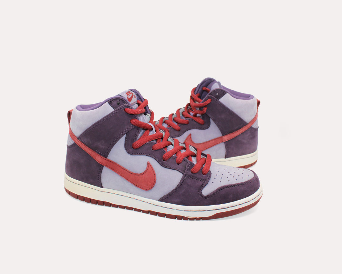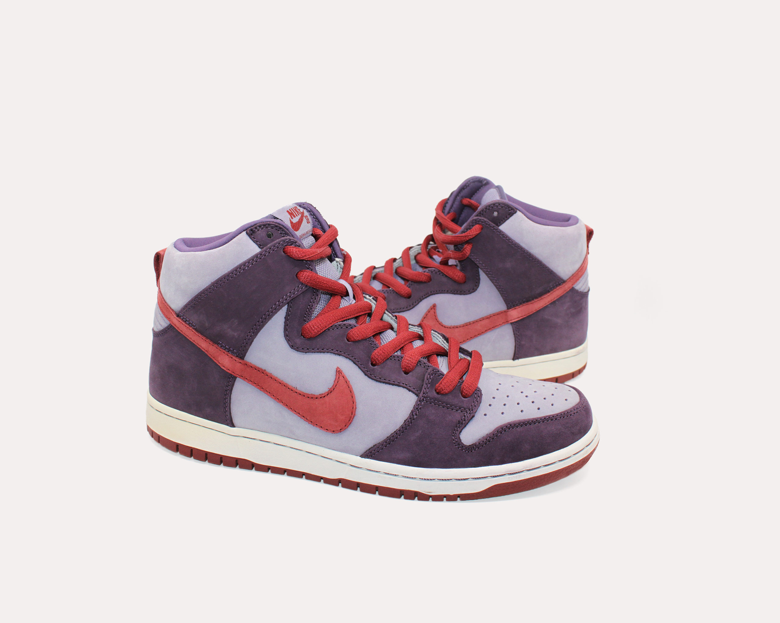 Es heißt, dass von allen drei Colorways lediglich 202 Paar hergestellt wurden. Entsprechend existieren von jeder Größe nur 10 bis 15 Paar, was das Pack sehr außergewöhnlich macht. Neben der Stückzahl war es aber vor allem das Material, an dem sich bis heute die Sammler erfreuen. Das damals verwendete Wildleder ist so unfassbar weich, dass es ein haptisches Erlebnis ist über das Upper zu streichen – es ist die Definition vom viel zu inflationär verwendeten “buttery soft“. Natürlich kann das Material der jetzt wieder auf den Markt kommende Version des “Plums“ nicht mit der Lederqualität von 2001 mithalten, doch man muss Nike attestieren, dass sie einen guten Job gemacht haben. Das Suede ist weich, leicht haarig und vor allem wirft es die unterschiedlichen Schattierungen der verschiedenen Lila-Töne, je nachdem in welche Richtung die kurzen Haare des Wildleder stehen. Dies gehört zu den Eigenschaften des Schuhs, welche die Besitzer eines OG “Plums“ an dem Schuh so lieben. Auch beim Shape kann man anerkennen, dass Nike sich immer mehr ins Zeug legt. Der Toespring, an dem sich ja die Geister scheiden, ist gering. Dies sorgt dafür, dass der Schuh eben nicht den so oft verfluchten Bananen-Shape zeigt, wie es Nike Retros früher regelmäßig taten. Ein gutes Beispiel hierfür ist die High Top-Version des Nike Dunk High Pro SB “Plum“ aus dem Jahr 2011. Vor 9 Jahren ist es an den hier beschriebenen Dingen gescheitert: Material und Shape waren nicht ansatzweise zufriedenstellend. Mit solchen Vergleichen müssen Nike und alle anderen Brands, die Retros auf den Markt bringen, einfach leben, denn das ist es, woran sie gemessen werden.
