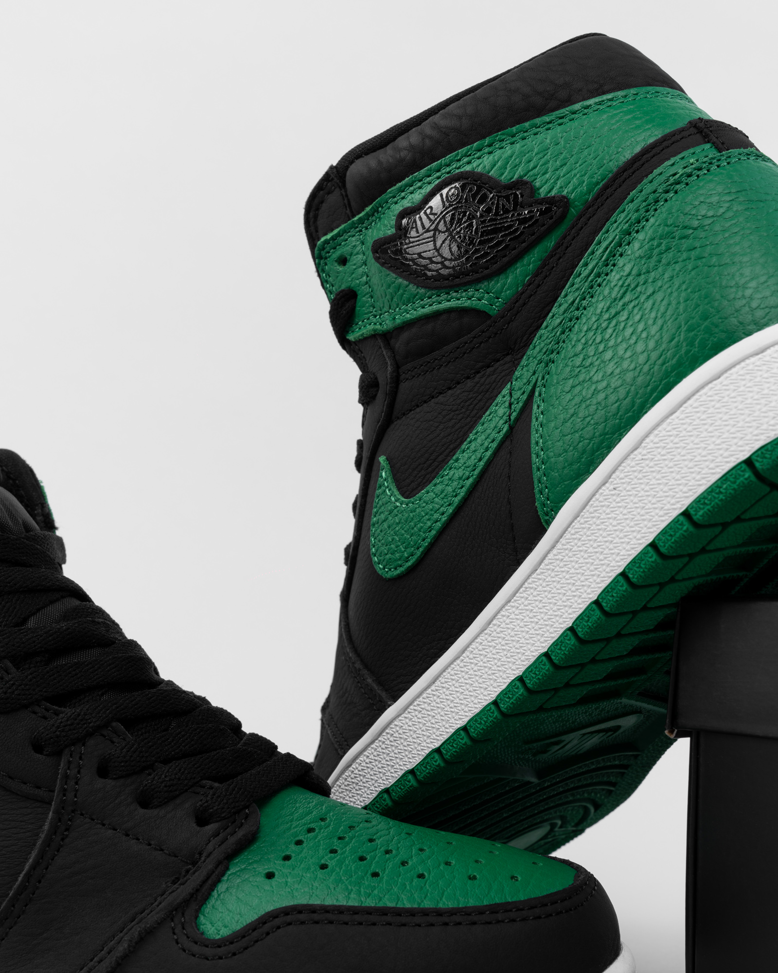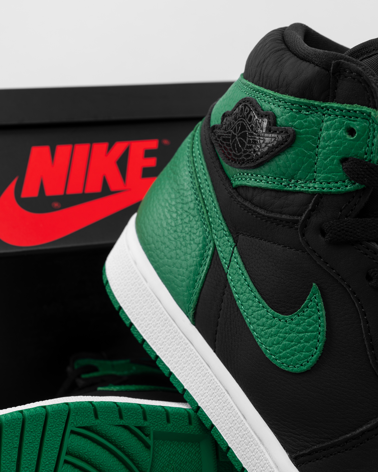 Offiziell gibt es keine Erläuterung für die Verwendung des Rots am “Pine Green“ 1er, aber wir müssen schon feststellen, dass die Farbkombination stark an die Signature-Farben des Modelabels Gucci erinnern. Zufall? Wir wissen es nicht. Was wir aber wissen ist, dass im September 2018 schon einmal ein Air Jordan 1 mit dem Colorway “Pine Green“ released wurde, jedoch war das Colorblocking der damaligen Version etwas anders. Damals war das Sidepanel weiß und der Swoosh war schwarz. Auch das Tonguelabel war farblich anders gestaltet. Schon 2009 gab es einen Jordan 1 mit einem ganz ähnlichen Colorblocking, an das sich die älteren Sammler erinnern werden. Damals war es ein Boston Celtics Colorway, der zusätzlich noch eine weiße Toebox hatte und als Teil des sogenannten “DMP Packs“ (Defining Moments Pack) zusammen mit einem AJ1 “Bred“ kam.