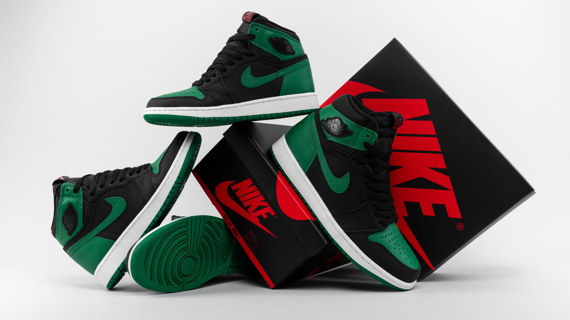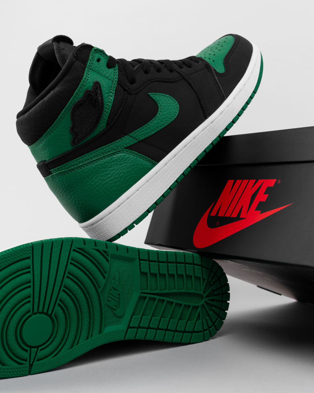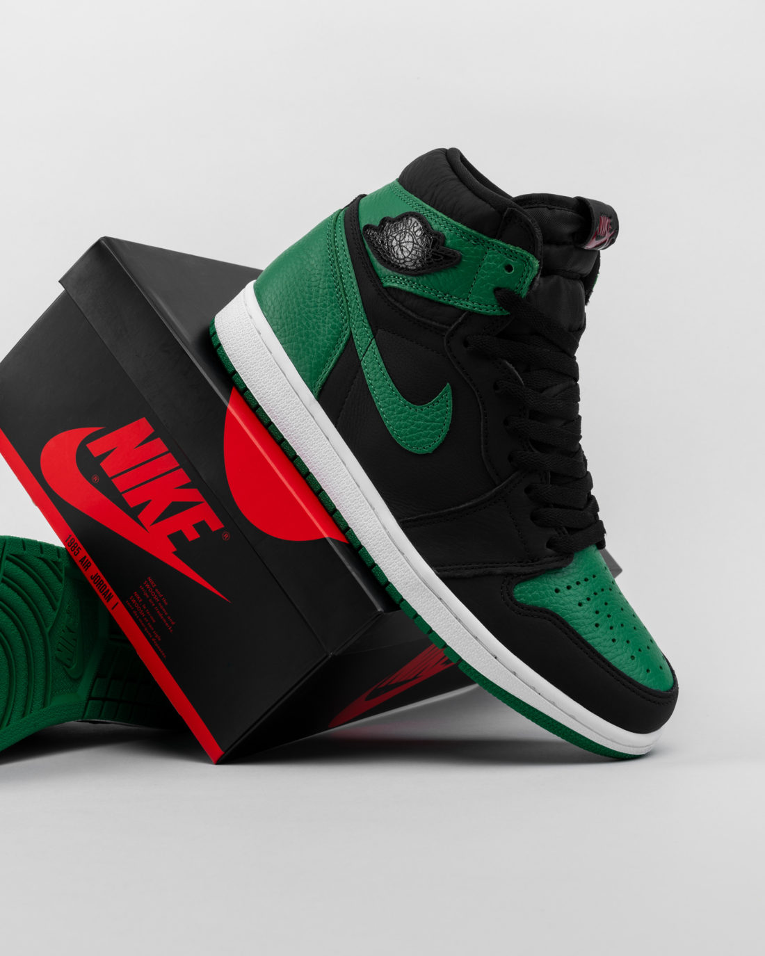 Offiziell gibt es keine Erläuterung für die Verwendung des Rots am “Pine Green“ 1er, aber wir müssen schon feststellen, dass die Farbkombination stark an die Signature-Farben des Modelabels Gucci erinnern. Zufall? Wir wissen es nicht. Was wir aber wissen ist, dass im September 2018 schon einmal ein Air Jordan 1 mit dem Colorway “Pine Green“ released wurde, jedoch war das Colorblocking der damaligen Version etwas anders. Damals war das Sidepanel weiß und der Swoosh war schwarz. Auch das Tonguelabel war farblich anders gestaltet. Schon 2009 gab es einen Jordan 1 mit einem ganz ähnlichen Colorblocking, an das sich die älteren Sammler erinnern werden. Damals war es ein Boston Celtics Colorway, der zusätzlich noch eine weiße Toebox hatte und als Teil des sogenannten “DMP Packs“ (Defining Moments Pack) zusammen mit einem AJ1 “Bred“ kam.
