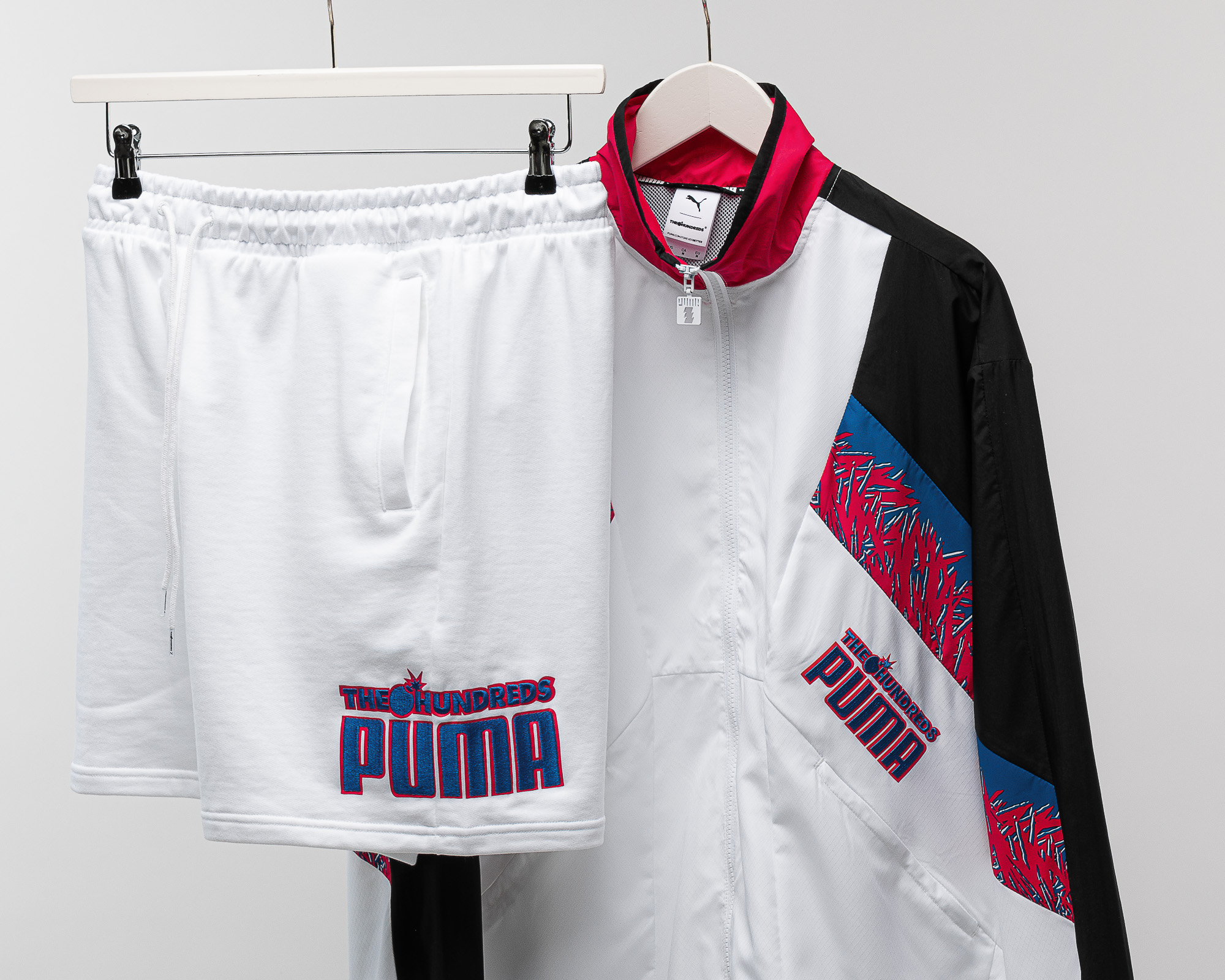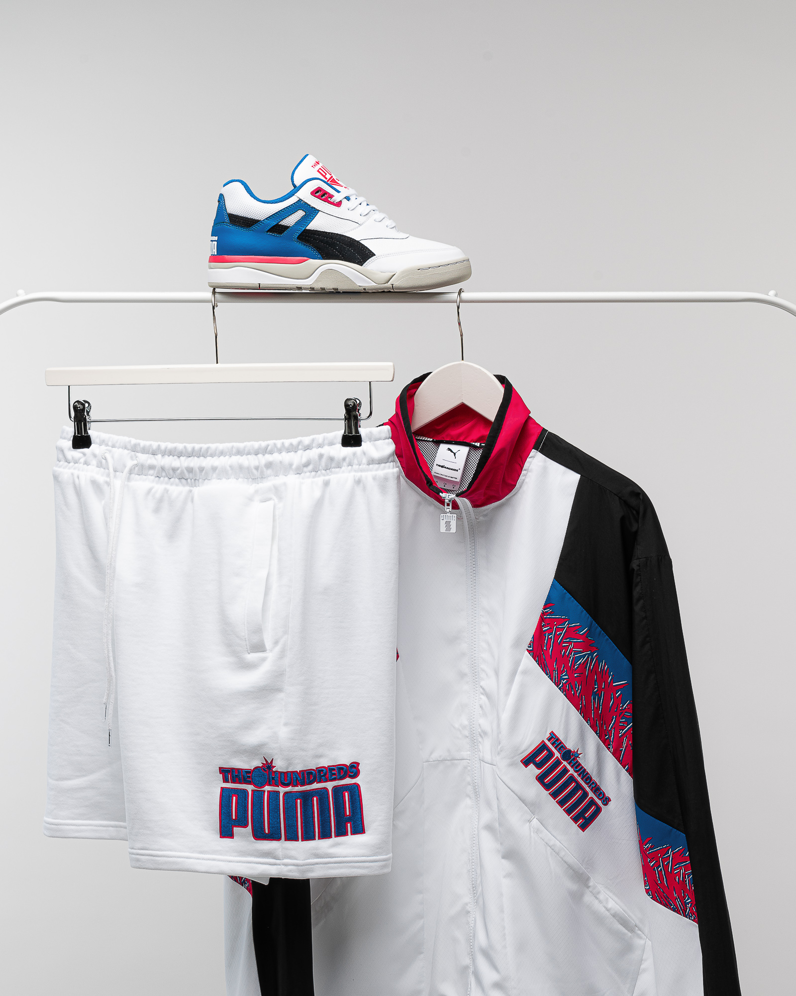 Auf den Außenseiten links und rechts hat der Clyde zwar jeweils ein schwarzes Upper aus Wildleder, auf dem ein gesticktes The Hundreds Logo am Quarter-Heel und ein weißer Formstrip sitzen, auf den Innenseiten jedoch wird es farbig. Der linke Schuh zeigt innen ein altrosanes Suede-Upper mit himmelblauem Formstrip, wohingegen der rechte Clyde auf der Innenseite moosgrün ist und einen orangen Formstrip hat. Die Story besagt, dass der Schuh die Party-Crew der 90er repräsentiert, die farbenfroh durchs Nachtleben gezogen ist. Neben dem Clyde haben wir den PUMA Palace Guard ran geholt, der eigentlich ein Basketballschuh war, im Zuge der schon lange andauernden Retrowelle aber im Lifestyle angekommen ist. Der Palace Guard repräsentiert die “Preppy“-Crew, also die etwas besser situierten Jungs und Mädels, die man damals als Popper bezeichnet, manch einer würde auch sagen beschimpft hat. Hier steht das weiße Lederupper im Vordergrund, das vom schwarzen Formstrip kontrastiert wird und schließlich am Heel in ein Mttelblau bricht. Letzteres findet sich im Lining wieder, ist aber nicht der einzige bunte Aspekt des Schuhs. Das am Clyde bereits zu findende Altrosa setzt seine Reise durch die Range der Produkte fort und bildet einen Teil der Mittelsohle, die aber hauptsächlich grau und weiß gestaltet ist. Rosa passt in jedem Fall hervorragend zum Thema “Preppy“. Das matchende Oberteil für diesen Schuh ist die Track Jacket, die neben den Hauptfarben Weiß und Schwarz auch die gerade am Palace Guard und am Clyde beschriebenen Farben Mittelblau und Altrosa aufnimmt. Das Popper 2020 Outfit perfekt macht die weiße Polyester-Short mit PUMA x The Hundreds Co-Branding Print auf beiden Hosenbeinen. Links in einem großen, mittelbaluen Lettering mit altrosaner Umrandung und rechts mit einem dezenten schwarzen Block und den entsprechenden Labels in Weiß.