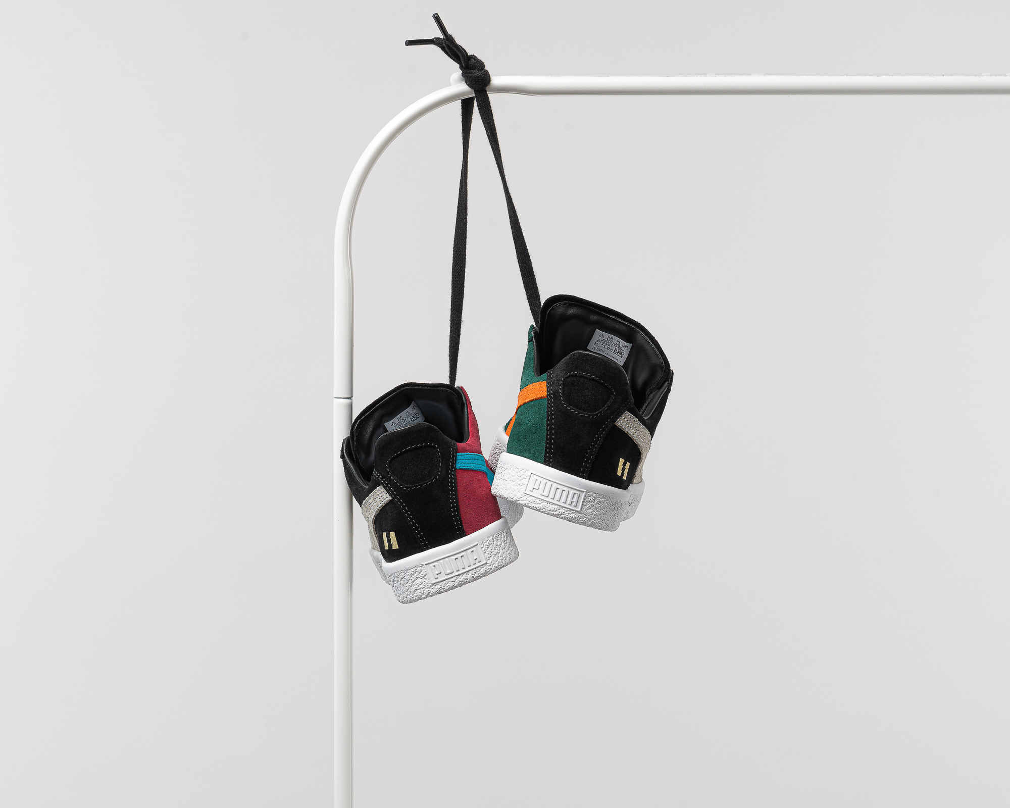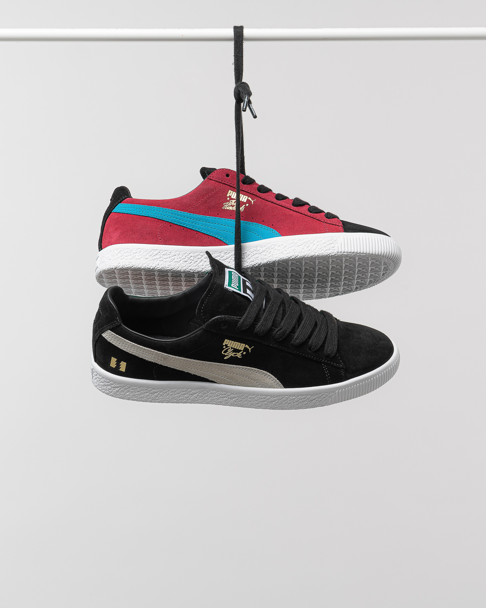 Gemäß dem The Hundreds-Mantra “People over Product“ hat man als Inspiration für die Kollektion die Cliquen herangezogen, die in den 90er Jahren das Nachtleben der größeren Städte unsicher gemacht haben und in denen viele von uns damals sozialisiert wurden. Aus den insgesamt fünf Sneakern der “Cliques“ Kollektion haben wir uns für den PUMA Palace Guard und den PUMA Clyde entschieden, der wohl das Kernstück der gesamten Kollektion darstellt. Grund hierfür ist natürlich seine unbestrittene kulturelle Relevanz als B-Boy- und Graffiti-Schuh der 70er und frühen 80er Jahre, der in den 90er Jahren, zu der Zeit also, als die oben erwähnten Cliquen aktiv waren, ein Comeback gefeiert hat. Der hier zu sehende Clyde hat eine Art Missmatched-Farbschema.