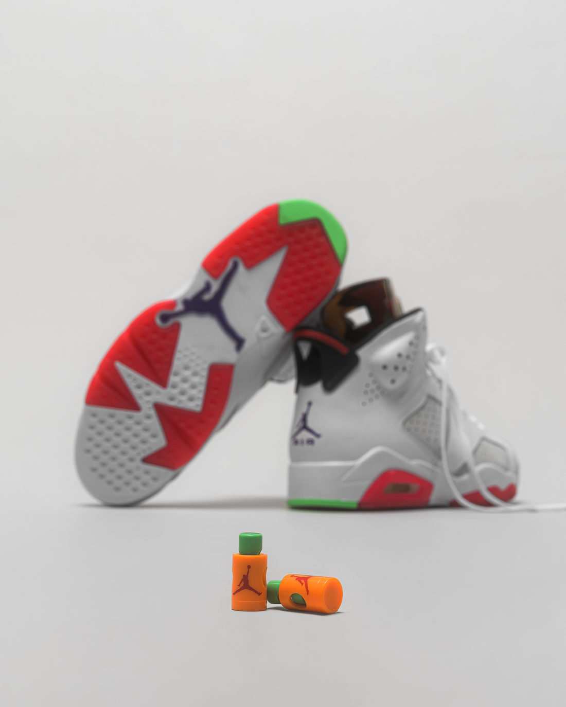 Eben dieser “Hare“ (zu Deutsch Hase) Colorway wurde jetzt erstmalig auf den Air Jordan 6 übertragen, an dem er eine sehr gute Figur macht. Auf der grauen Base aus Nubukleder, deren Farbe an das Grau von Bugs Bunnys Fell angelehnt ist, sitzen weiße Overlays aus Glattleder, die den gesamten hinteren Schuh überziehen. Ein Großteil der Midsole ist ebenfalls weiß, unterbrochen von Bereichen, die ein dunkleres Rosa zeigen. In diesem True Red genannte Rosa ist auch die Zunge samt Lace Shield gestaltet. Auch hier dient wohl Bugs Bunny als farbliche Vorlage, hat das Häschen doch eine rosafarbene Stupsnase und Innenohren. Das farblich auffälligste Merkmal des originalen “Hare“ Air Jordan 7 war damals des Muster auf der Zunge. Auch beim jetzigen Air Jordan 6 wird darauf nicht verzichtet. Man findet es an der Innenseite der Zunge, sowie am Sockliner und der Außensole. Ansatzweise kann man es auch an den Lace Locks erkennen, die beim 6er Jordan natürlich nicht fehlen dürfen. Einen lilafarbenen Jumpman mit passendem AIR Stitching kann man auf dem Heel finden, der Jumpman auf der Zunge ist schwarz. Die aufwendige Perforation am Sidepanel, sowie am Schaft, macht den Schuh optisch rund.