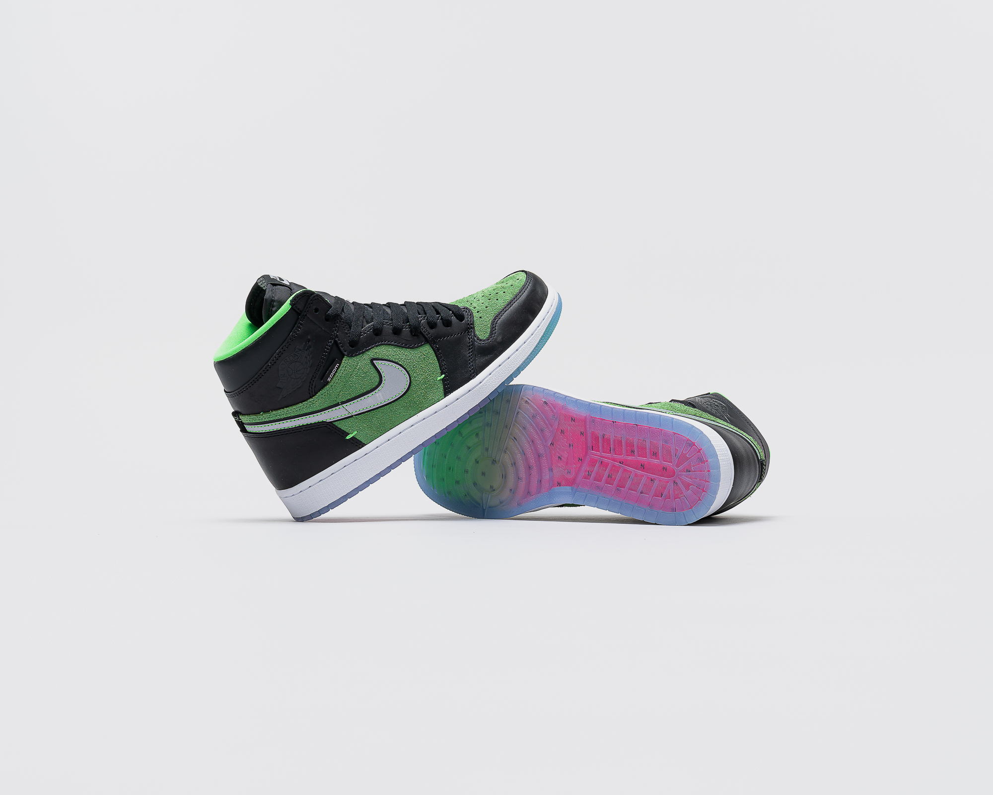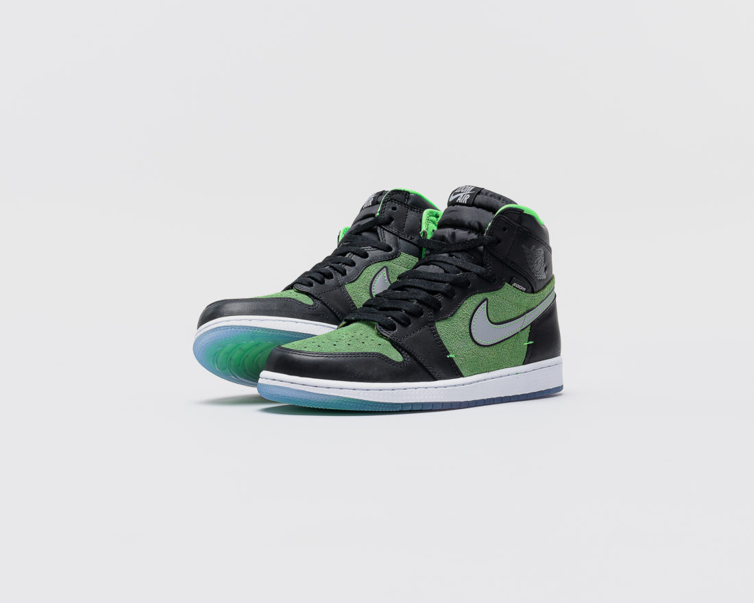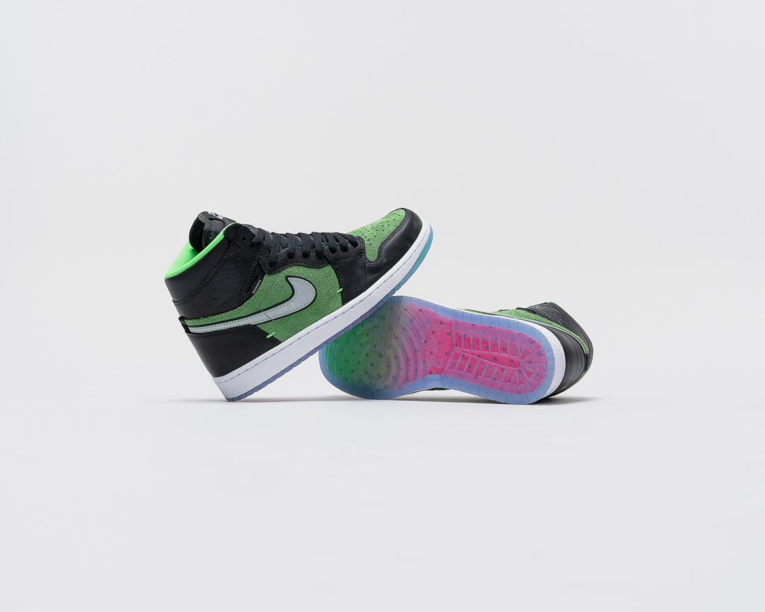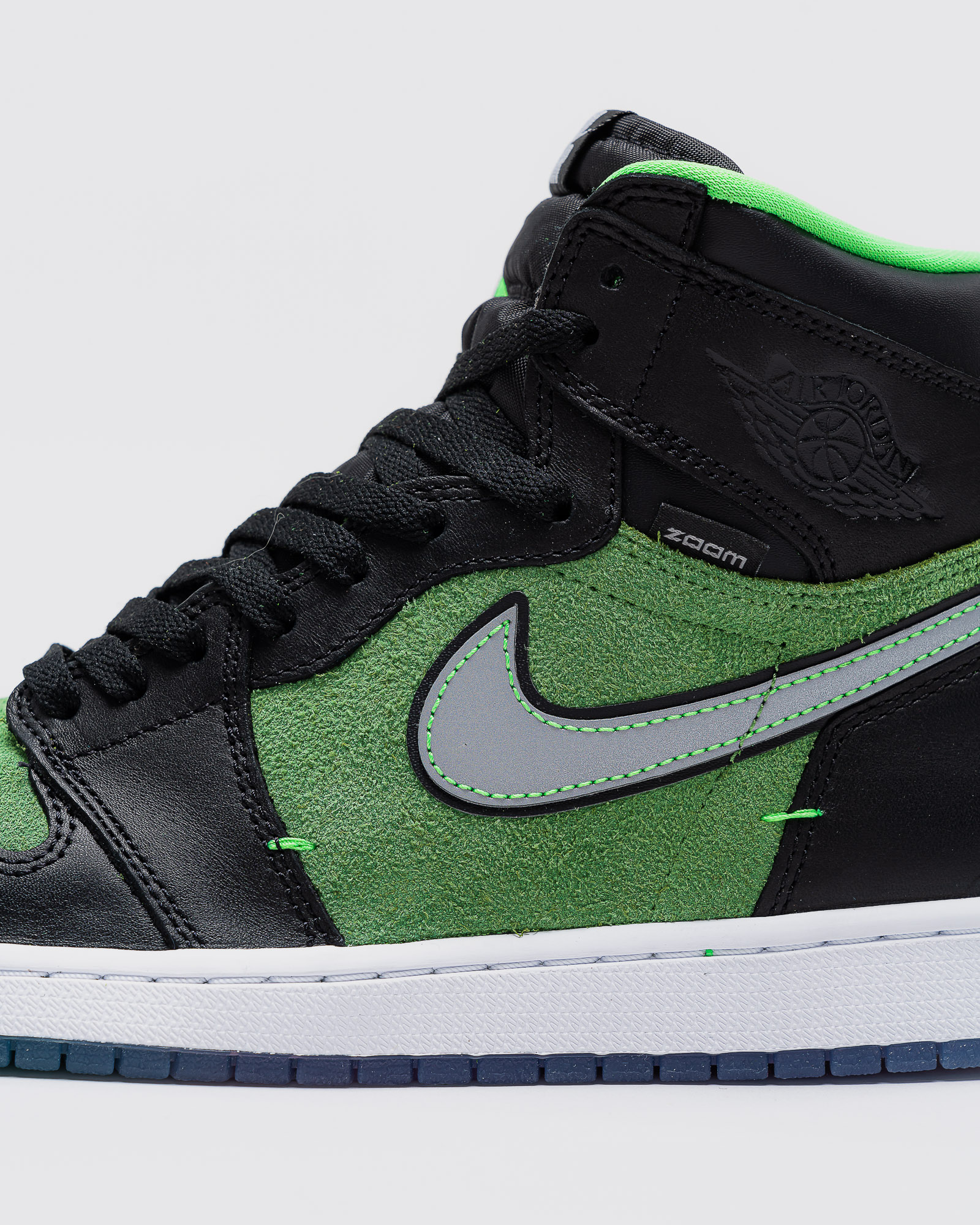 und des angesprochenen Dunks es sind. Dies könnte jetzt natürlich ein Zufall sein, doch die Jordan Brand Designer scheinen tatsächlich im Nike SB Archiv gestöbert zu haben, denn auch das Material dieser beiden Panels ist dasselbe wie beim “Brut“ SB Dunk High – ein leicht angerautes, fast schon leicht haariges Suede. Auf jeden Fall sehen wir einen sehr interessanten Materialmix am Jordan 1, denn die weiteren Panels des Schuhs sind aus einem schwarzen Leder, das einen wirklich hochwertigen Eindruck macht. Das sollte man bei dem erhöhten Preis für den 1er Jordan aber auch erwarten können. Das Wings Logo auf dem Collar ist ebenfalls komplett schwarz, so dass man es auf den ersten Blick nicht wirklich erkennen kann. Der silberne Swoosh zeigt ein schwarzes Underlay wodurch man zunächst den Eindruck bekommt, als ob der Swoosh einen Rand hat. Direkt unter dem Ankle Flap wurde ein “ZOOM“ Lettering platziert. Weitere Hinweise auf Nikes Dämpfungssystem findet man auf dem Zungenlabel, das mit dem Swoosh, sowie dem “ZOOM Air“ Lettering gebranded wurde. Zu guter Letzt kann man noch Hinweise auf die Zoom Technologie unter der durchsichtigen Außensohle entdecken, denn durch sie schimmern unzählige Zetts hindurch. Diese wirken auf dem mehrfarbigen Untergrund ziemlich nice. Den Look vervollständigen eine weiße Mittelsohle und ein grelleres Grün am Lining. Eine Besonderheit bieten die zwei kleinen grünen Fäden, die auf den Außenseiten das Sidepanel mit den daneben liegenden Overlays verbinden. Eine Funktion wird nicht deutlich, aber es ist ein Hingucker.