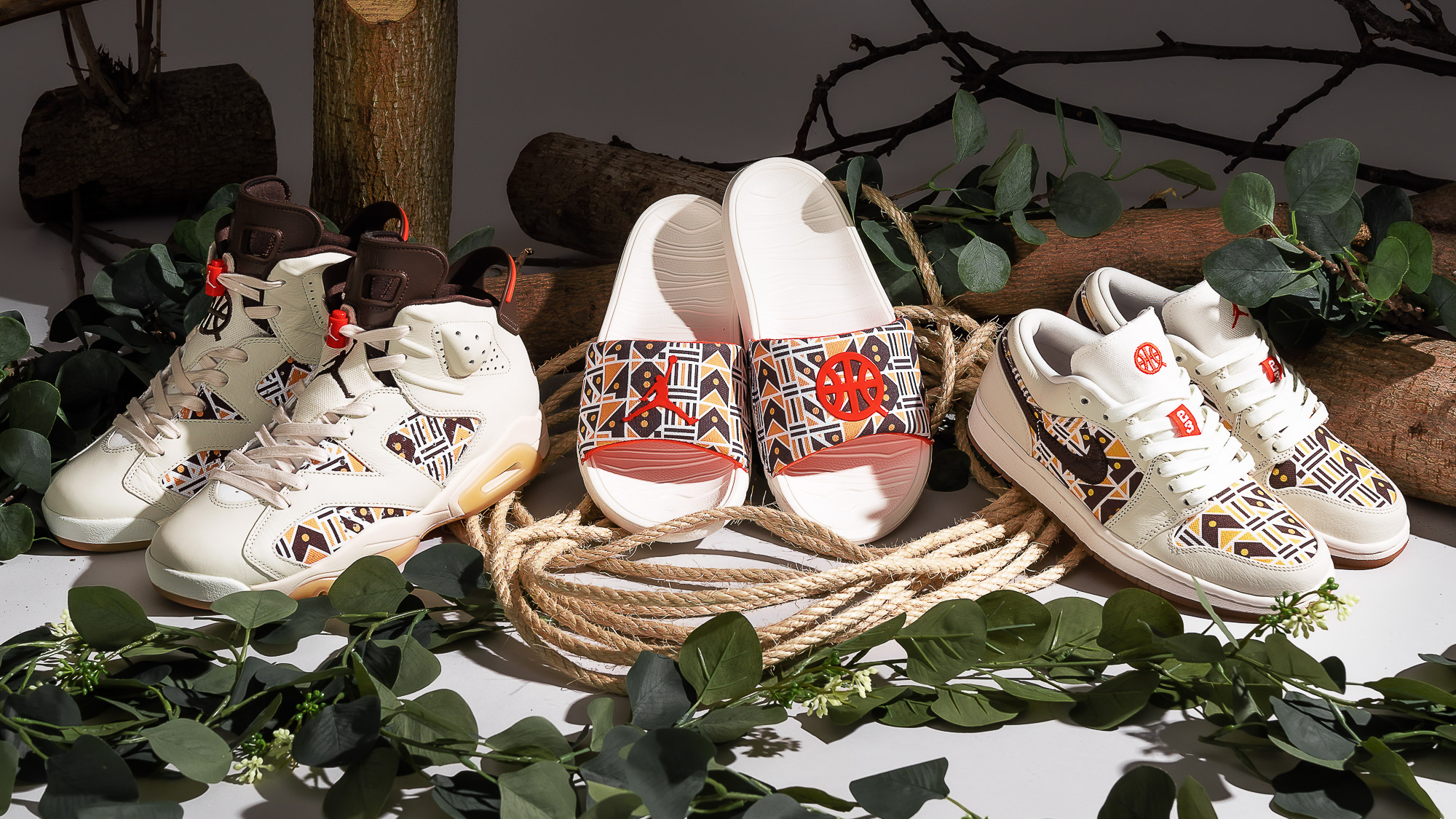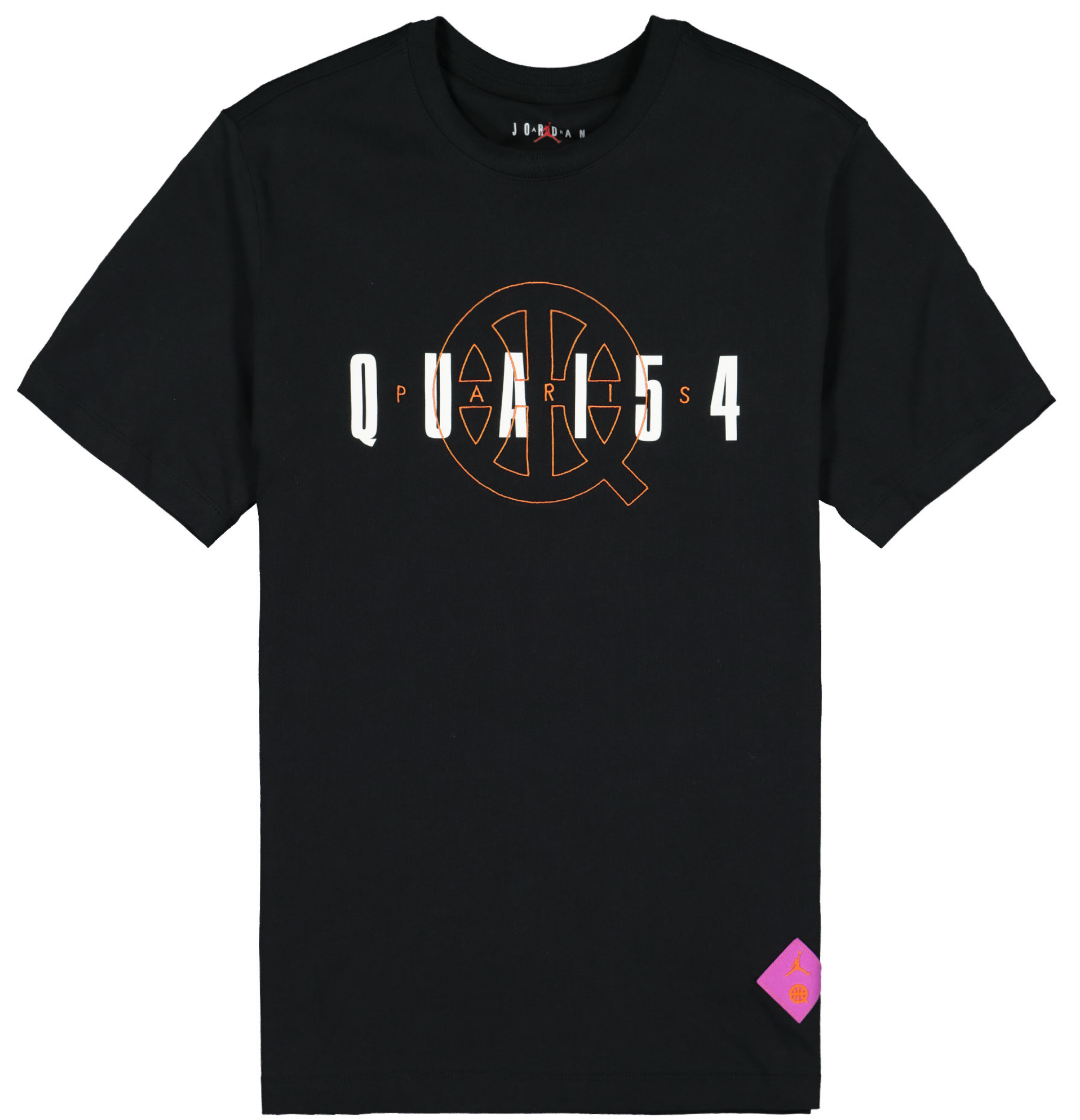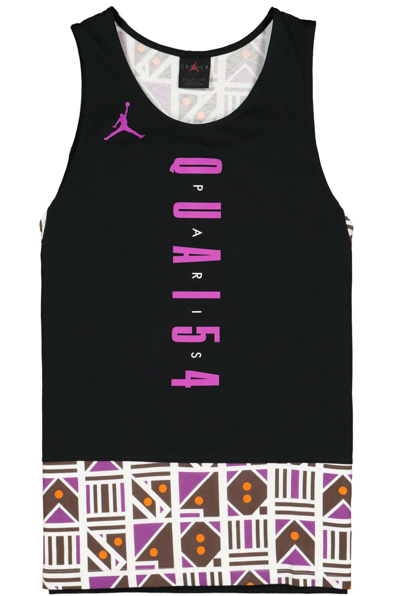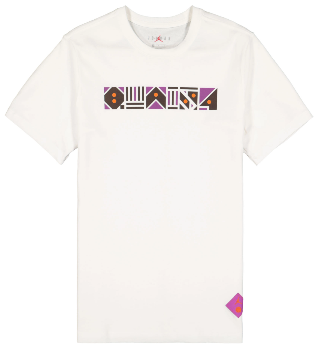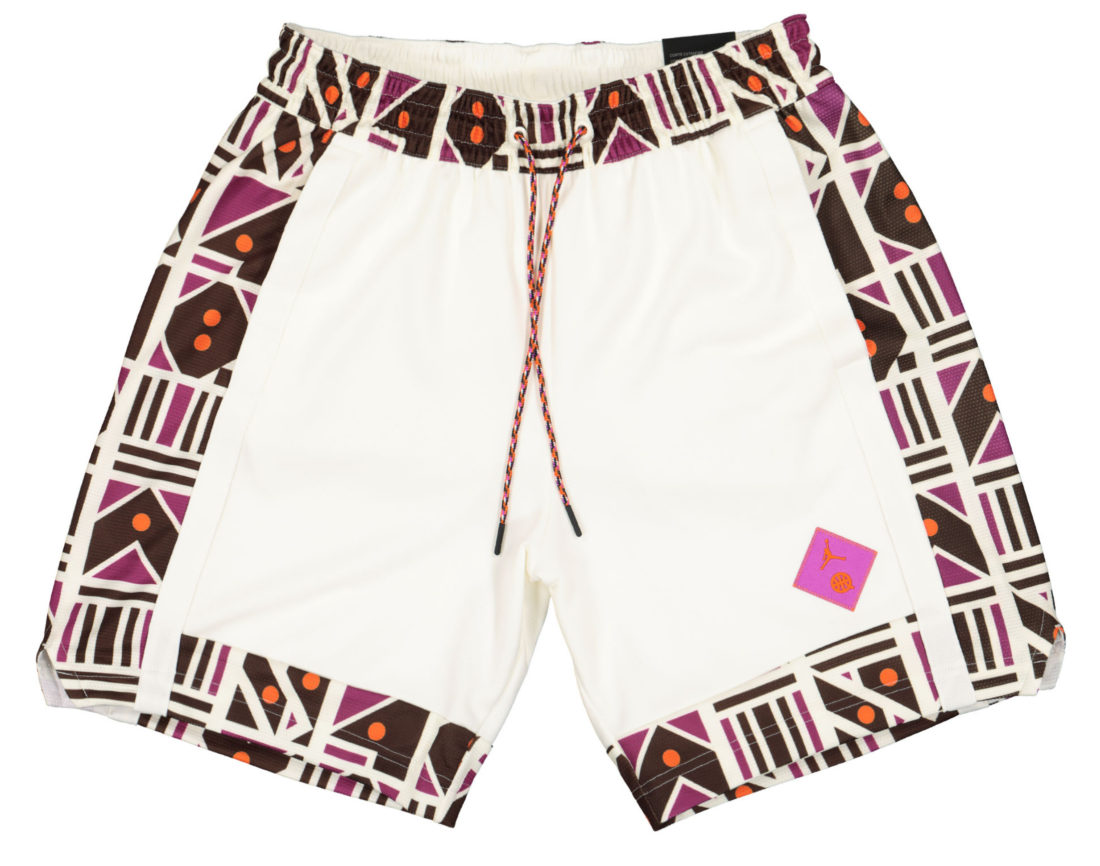 Kernstück der Kollektion ist sicherlich der Air Jordan 6 Retro im Sail/ Baroque Brown-Team Orange Colorway. Das Upper besteht aus einem schönen cremeweißen Tumbled Leather und Underlays, die ein interessantes Muster aus hell- und dunkelbraunen geometrischen Formen wie Dreiecken, Kreisen, Pfeilen oder Parallelogrammen zeigt. Passend zu den hellbraunen Formen sitzt unter dem Schuh eine gumfarbene Außensohle. Das Pulltab, die 6er-typische Zunge, das Nike Air Branding auf dem Heel, sowie das Lining matchen wiederum mit den dunkelbraunen Formen des Musters. Außerdem befindet sich ein oranger Streifen am Pulltab. Neben diesem 6er Jordan haben wir außerdem den Air Jordan 1 Quai 54 für euch, der dem 6er farblich sehr ähnlich ist. Die Base, auch Underlays genannt, zeigt im Prinzip dasselbe Muster wie der eben beschriebene AJ6. Auch hier sind die ledernen Overlays cremeweiß. Unter der weißen Midsole sitzt eine Gumsole. Der Swoosh, den wir ja am 6er nicht haben, ist dunkelbraun, das Lining und die Zunge des 1ers sind anders als beim 6er nicht dunkelbraun, sondern weiß. Auch der Heel ist anders gestaltet. Der Air Jordan 1 Quai 54 zeigt auf dem Hacken das Wings Logo, statt des so oft gesehenen Nike Air Brandings. Orange finden wir beim Jumpman auf der Zunge. Neben diesen beiden “richtigen“ Sneakern können wir aber auch ein Paar Jordan Break Slides im 2020er Quai 54 Look anbieten. Die guten, alten Badelatschen kommen ebenfalls im beschrieben Style des 6ers und 1ers daher. Hierbei ist die Sohle cremeweiß und der Spann-Bogen mit dem geometrischen Muster versehen. Oben auf dem Muster sitzt ein oranger Basketball, der sich farblich auf der Innenseite des Bogens wiederfindet. Im Bereich Apparel können wir euch eine Sport DNA Jacket, eine BBall Quai 54 Short, ein Legacy Quai 54 Tanktop, sowie jeweils ein Logo- und ein Event-Quai 54 T-Shirt anbieten. Bei einem der T-Shirts, der Jacke, sowie der Short ist das Cremeweiß die dominierende Farbe, bei dem anderen T-Shirt und dem Tanktop überwiegt schwarz. Doch auch an allen fünf Apparel Teilen wurde gezielt und sehr geschmackvoll das bereits bei den Schuhen beschriebene Muster aus geometrischen Formen platziert. Hier kommen neben Hell- und Dunkelbraun auch noch die Farben Lila und Orange an verschiedenen Stellen zum Einsatz. Eine wunderbare Reminiszenz an alte Shirts, Sweater und Hoodies aus den 80er und 90er Jahren zeigt das Tanktop, auf dem die Worte Quai 54 und Paris in der Art eines bekannten Vintage AIR JORDAN Letterings gestaltet wurden. Ein schönes Detail welches Nostalgie aufkommen lässt.