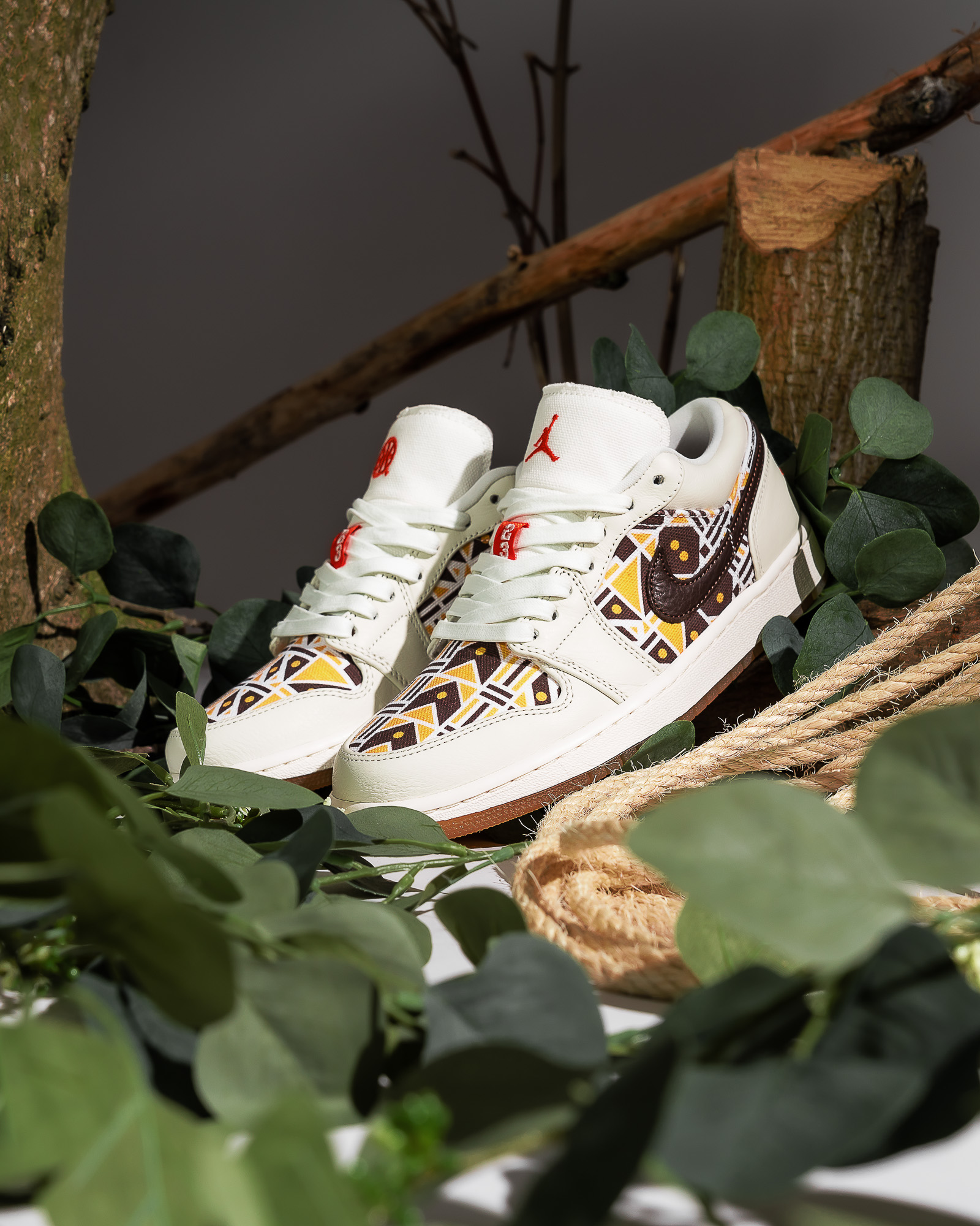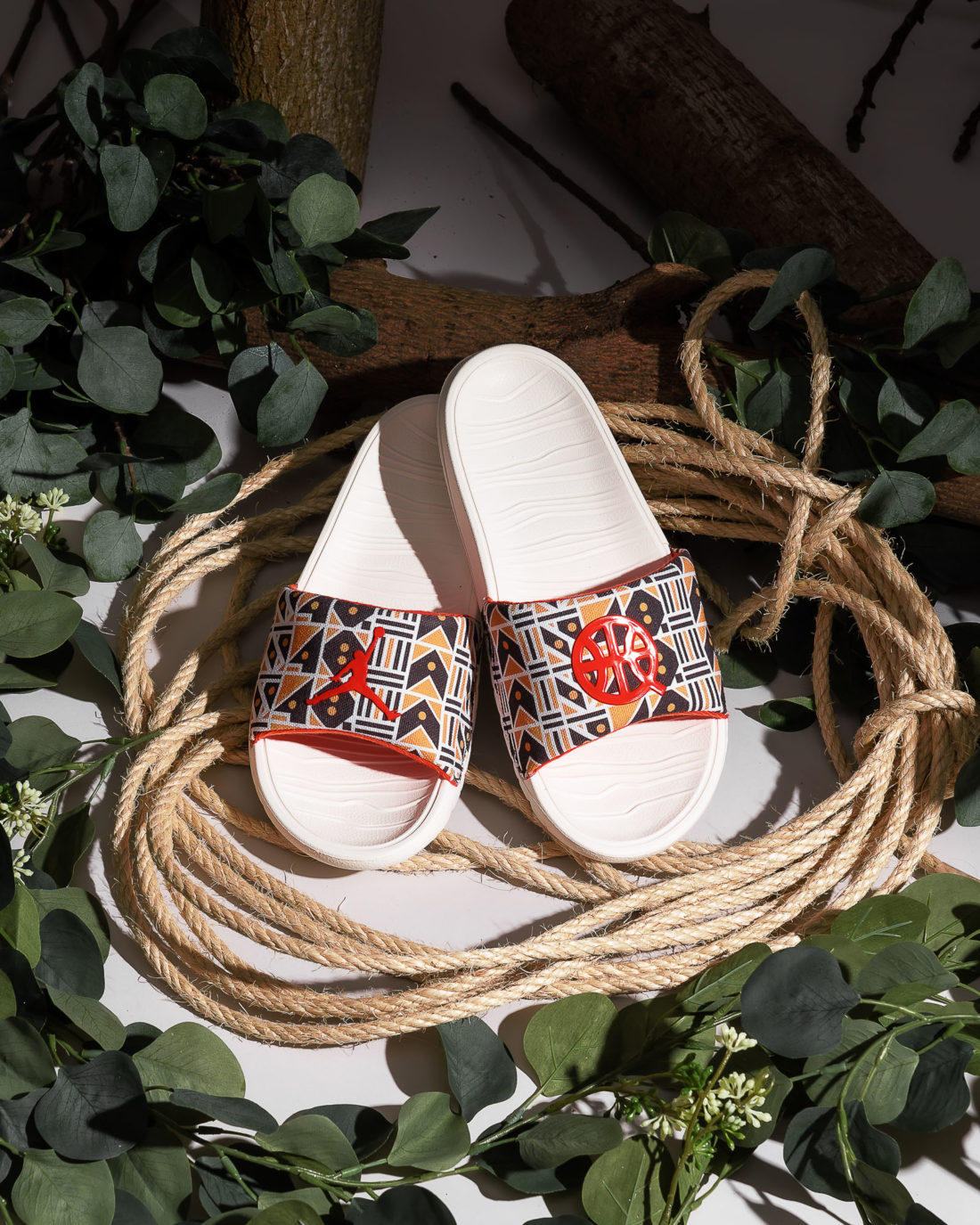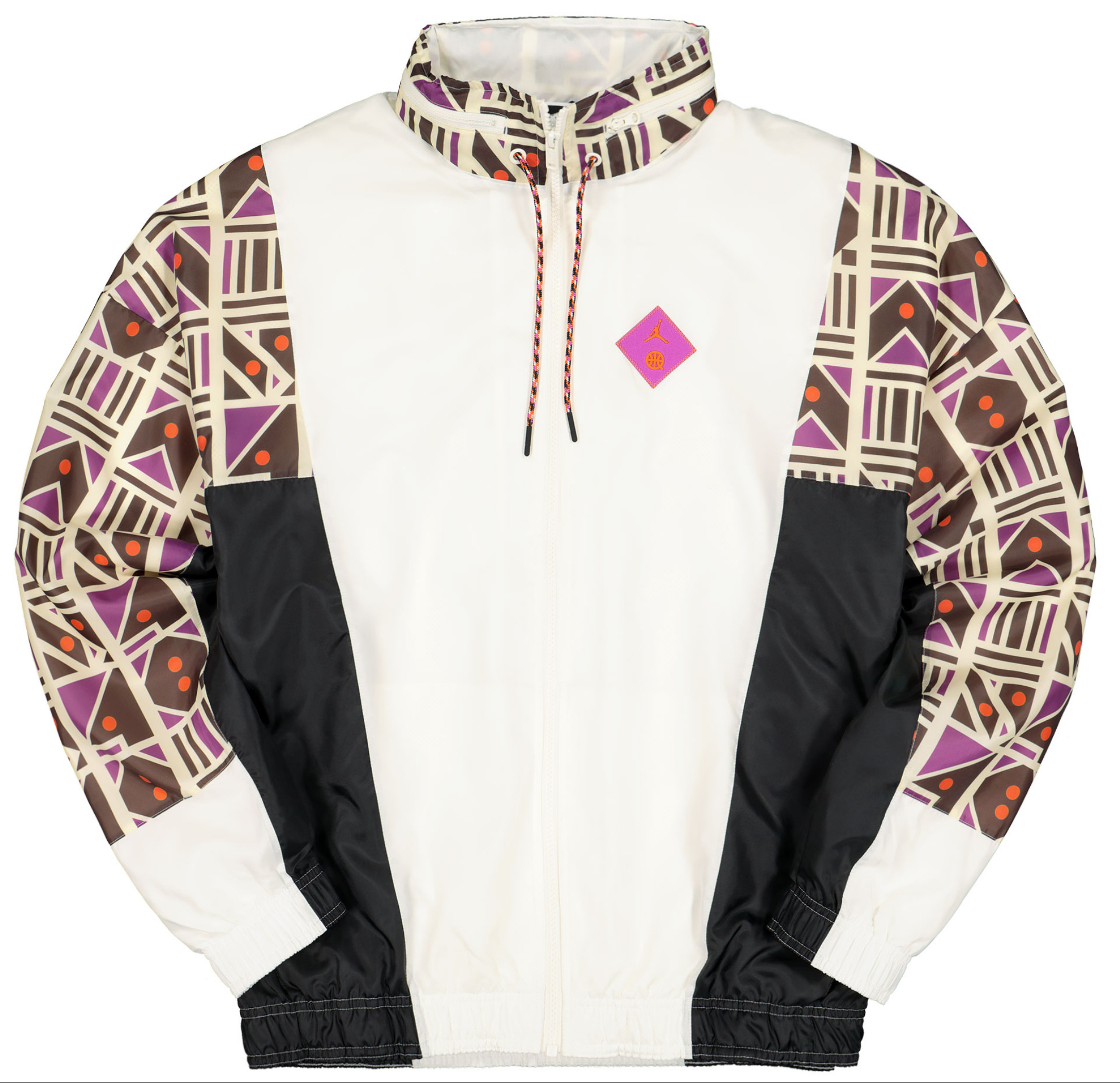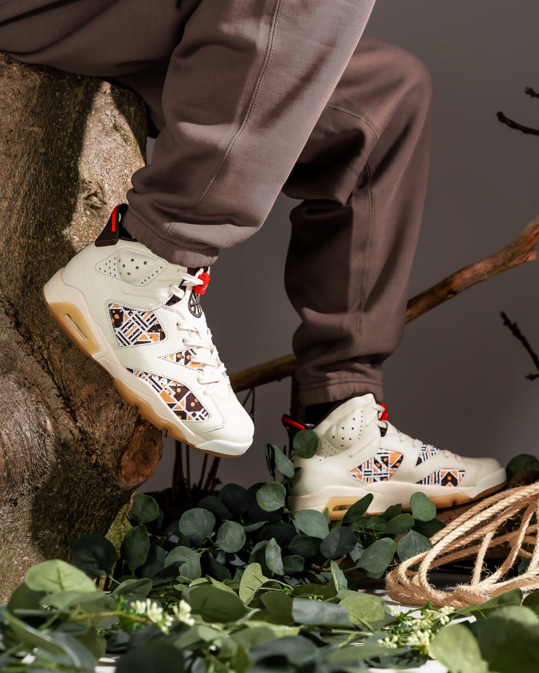Kernstück der Kollektion ist sicherlich der Air Jordan 6 Retro im Sail/ Baroque Brown-Team Orange Colorway. Das Upper besteht aus einem schönen cremeweißen Tumbled Leather und Underlays, die ein interessantes Muster aus hell- und dunkelbraunen geometrischen Formen wie Dreiecken, Kreisen, Pfeilen oder Parallelogrammen zeigt. Passend zu den hellbraunen Formen sitzt unter dem Schuh eine gumfarbene Außensohle. Das Pulltab, die 6er-typische Zunge, das Nike Air Branding auf dem Heel, sowie das Lining matchen wiederum mit den dunkelbraunen Formen des Musters. Außerdem befindet sich ein oranger Streifen am Pulltab. Neben diesem 6er Jordan haben wir außerdem den Air Jordan 1 Quai 54 für euch, der dem 6er farblich sehr ähnlich ist. Die Base, auch Underlays genannt, zeigt im Prinzip dasselbe Muster wie der eben beschriebene AJ6. Auch hier sind die ledernen Overlays cremeweiß. Unter der weißen Midsole sitzt eine Gumsole. Der Swoosh, den wir ja am 6er nicht haben, ist dunkelbraun, das Lining und die Zunge des 1ers sind anders als beim 6er nicht dunkelbraun, sondern weiß. Auch der Heel ist anders gestaltet. Der Air Jordan 1 Quai 54 zeigt auf dem Hacken das Wings Logo, statt des so oft gesehenen Nike Air Brandings. Orange finden wir beim Jumpman auf der Zunge. Neben diesen beiden “richtigen“ Sneakern können wir aber auch ein Paar Jordan Break Slides im 2020er Quai 54 Look anbieten. Die guten, alten Badelatschen kommen ebenfalls im beschrieben Style des 6ers und 1ers daher. Hierbei ist die Sohle cremeweiß und der Spann-Bogen mit dem geometrischen Muster versehen. Oben auf dem Muster sitzt ein oranger Basketball, der sich farblich auf der Innenseite des Bogens wiederfindet. Im Bereich Apparel können wir euch eine Sport DNA Jacket, eine BBall Quai 54 Short, ein Legacy Quai 54 Tanktop, sowie jeweils ein Logo- und ein Event-Quai 54 T-Shirt anbieten. Bei einem der T-Shirts, der Jacke, sowie der Short ist das Cremeweiß die dominierende Farbe, bei dem anderen T-Shirt und dem Tanktop überwiegt schwarz. Doch auch an allen fünf Apparel Teilen wurde gezielt und sehr geschmackvoll das bereits bei den Schuhen beschriebene Muster aus geometrischen Formen platziert. Hier kommen neben Hell- und Dunkelbraun auch noch die Farben Lila und Orange an verschiedenen Stellen zum Einsatz. Eine wunderbare Reminiszenz an alte Shirts, Sweater und Hoodies aus den 80er und 90er Jahren zeigt das Tanktop, auf dem die Worte Quai 54 und Paris in der Art eines bekannten Vintage AIR JORDAN Letterings gestaltet wurden. Ein schönes Detail welches Nostalgie aufkommen lässt.