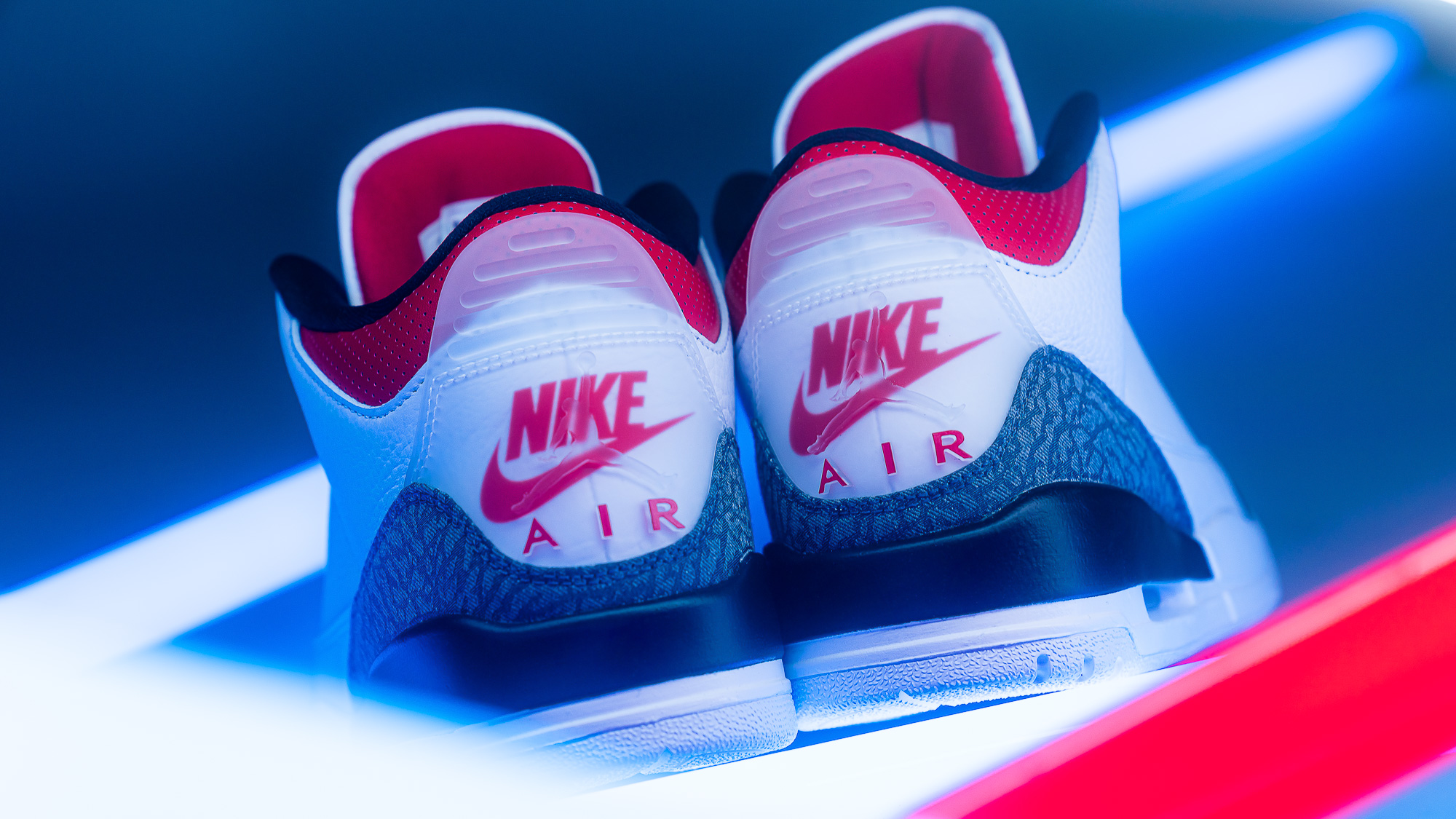 Die erste Besonderheit ist bereits aus der Überschrift ersichtlich. Jordan Brand verwendet für die am Jordan 3 obligatorischen Elephant Print Panels diesmal graues Denim als Material. Auf diesen ist gut zu erkennen, welch schöne Textur der Elephant Print auf das Denim wirft. Ob es sich hier um ein japanisches Denim handelt, das für seine hohe Qualität und Robustheit bekannt ist, bleibt zu bezweifeln, denn sonst würde der Preis der AJ3 vermutlich deutlich höher liegen. Wie es auf machen Blogs dennoch zu solchen Spekulationen kommt, erläutern wir etwas weiter unten im Text. Zunächst wollen wir die zweite Besonderheit dieses Schuhs beschreiben. Am Heel sehen wir neben dem Nike Air Branding, das direkt auf dem weißen Upper sitzt, auch einen Jumpman. Dieser allerdings befindet sich auf einem Plastikteil, das sich quasi als zweite Schicht über den Heel zieht und weiter oben in das vom 3er bekannte Pulltab übergeht. Das beschriebene Plastikteil ist durchsichtig, so dass man das rote Nike Air Branding auf dem Heel sehen kann. Der Jumpman hingegen scheint in das Plastik eingeformt zu sein, so dass man ihn mit dem Finger spüren und nachfahren kann.