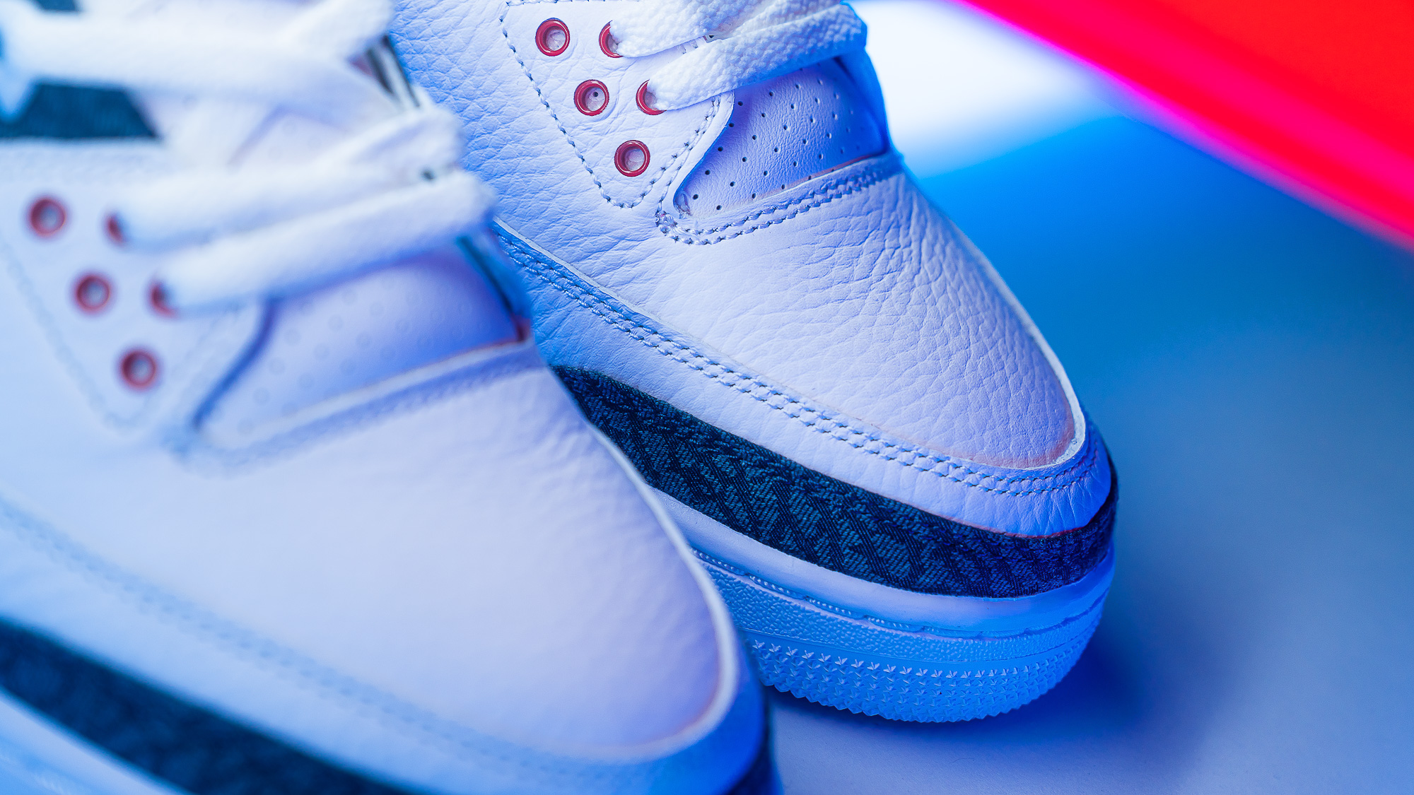 Das bereits erwähnte weiße Upper ist aus einem schön genarbten Leder. Wie beim OG Nike Air Jordan 3 “Fire Red“ kommt der Bereich direkt unterhalb des Schuhkragens in Rot. Da die offizielle Bezeichnung der hier verwendeten Farbe, also der “Color Code“, tatsächlich auch Fire Red ist, wurde dieser AJ3 im Netz unter anderem auch schon als “Denim Fire Red“ bezeichnet. Dieser Name sollte jedoch einzig und allein dem Jordan 3 vorbehalten sein, der auch das entsprechende Colorblocking des OGs aufweist. Der hier vorgestellte 3er tut dies nicht. Im Gegensatz zum OG “Fire Red“ hat dieser Jordan statt eines roten Linings ein schwarzes. Außerdem ist der obere Teil der Mittelsohle nicht durchgehend rot, sondern zweigeteilt weiß und schwarz. Auch beim obersten Loch der Schnürung ist ein farblicher Unterschied vorhanden. Kein Grund also, hier von einem “Fire Red“ 3er zu sprechen.