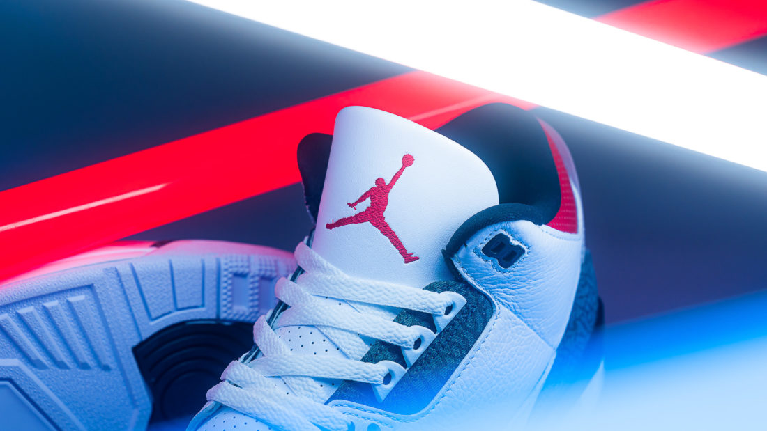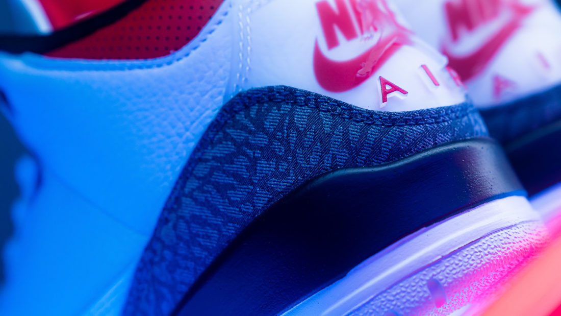 Die erste Besonderheit ist bereits aus der Überschrift ersichtlich. Jordan Brand verwendet für die am Jordan 3 obligatorischen Elephant Print Panels diesmal graues Denim als Material. Auf diesen ist gut zu erkennen, welch schöne Textur der Elephant Print auf das Denim wirft. Ob es sich hier um ein japanisches Denim handelt, das für seine hohe Qualität und Robustheit bekannt ist, bleibt zu bezweifeln, denn sonst würde der Preis der AJ3 vermutlich deutlich höher liegen. Wie es auf machen Blogs dennoch zu solchen Spekulationen kommt, erläutern wir etwas weiter unten im Text. Zunächst wollen wir die zweite Besonderheit dieses Schuhs beschreiben. Am Heel sehen wir neben dem Nike Air Branding, das direkt auf dem weißen Upper sitzt, auch einen Jumpman. Dieser allerdings befindet sich auf einem Plastikteil, das sich quasi als zweite Schicht über den Heel zieht und weiter oben in das vom 3er bekannte Pulltab übergeht. Das beschriebene Plastikteil ist durchsichtig, so dass man das rote Nike Air Branding auf dem Heel sehen kann. Der Jumpman hingegen scheint in das Plastik eingeformt zu sein, so dass man ihn mit dem Finger spüren und nachfahren kann.