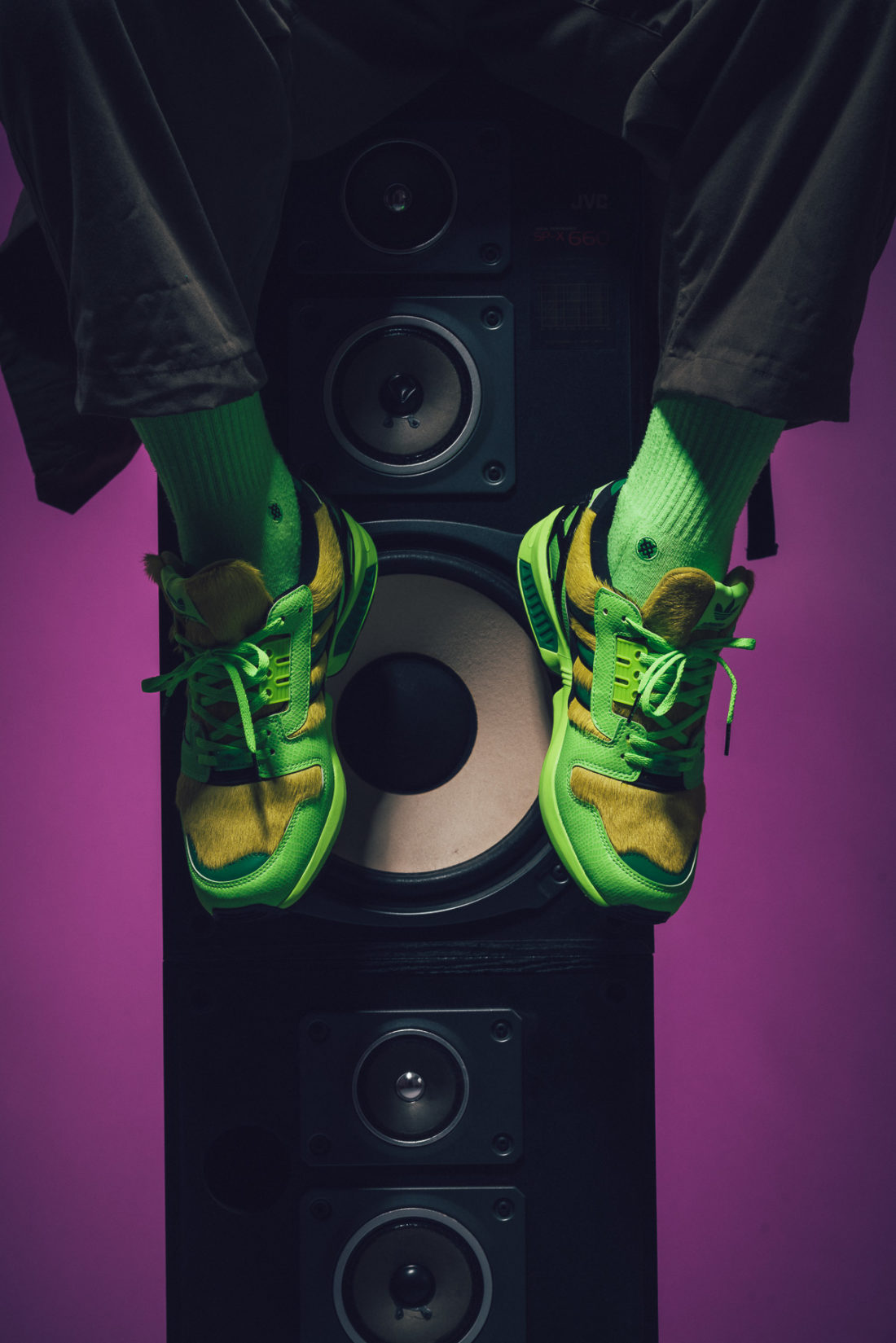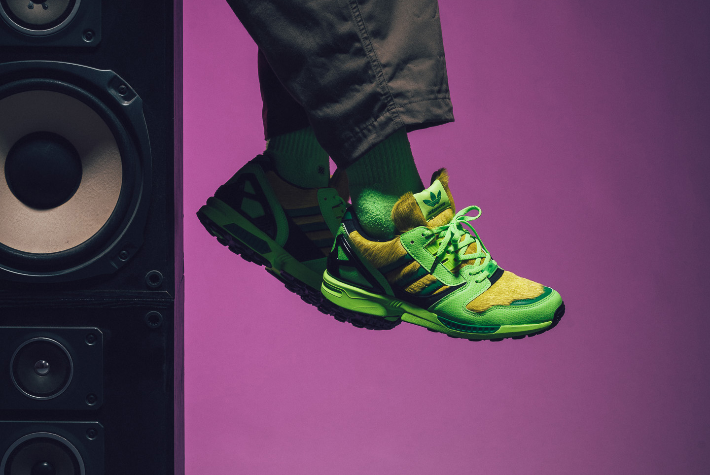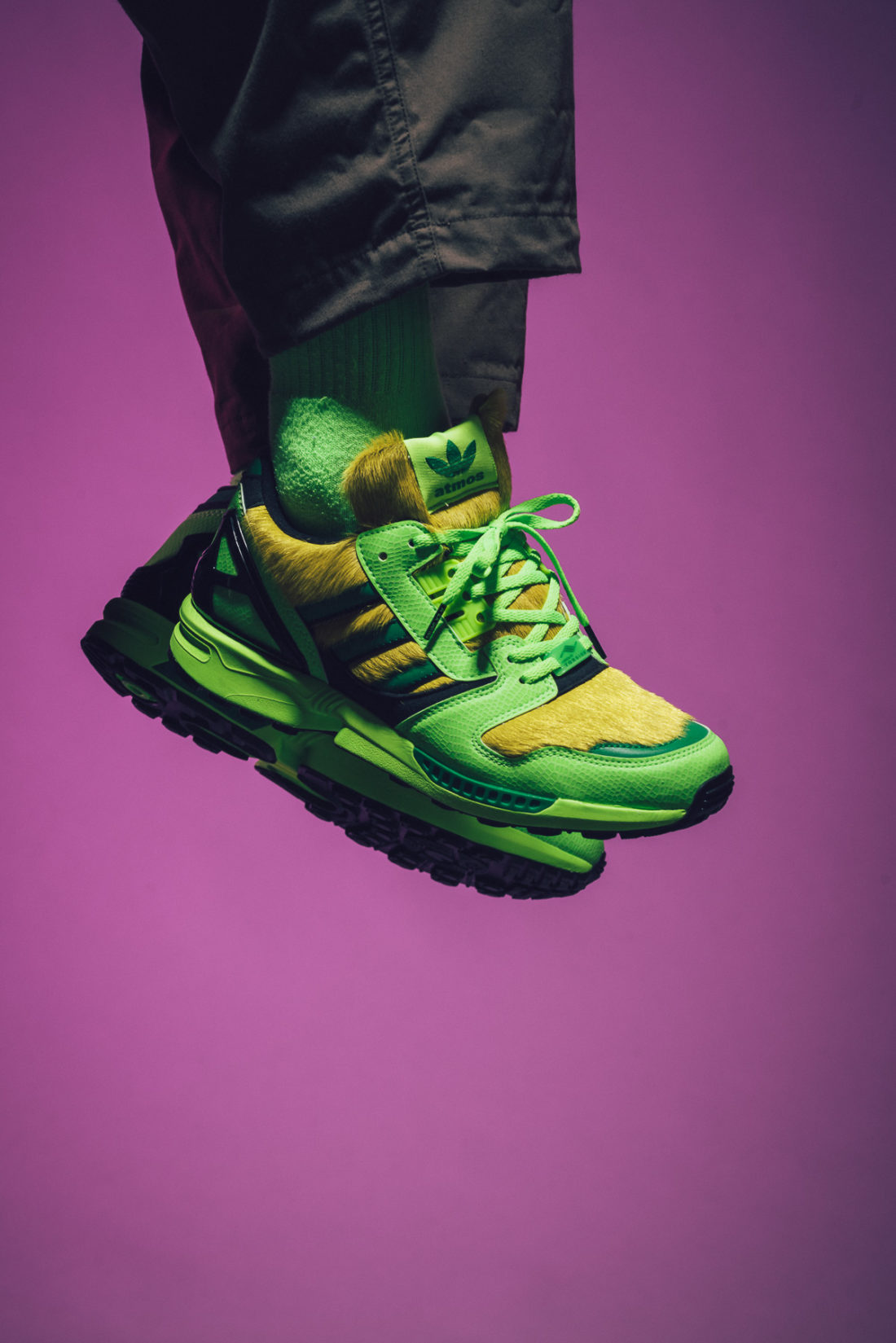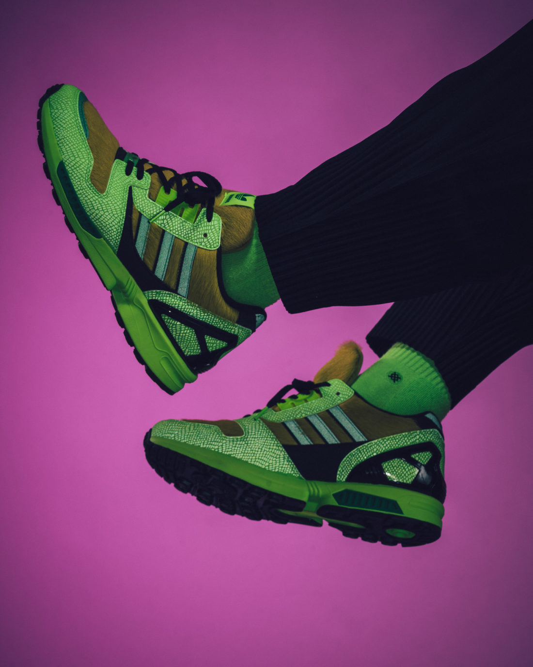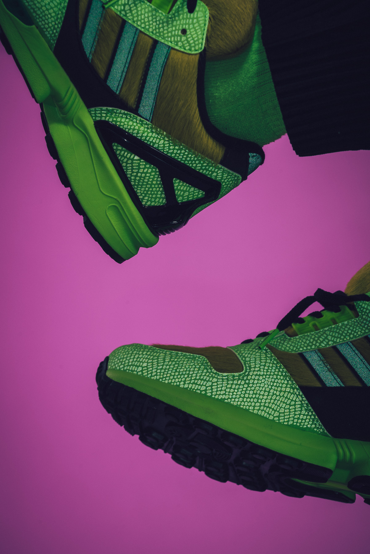 durch ein kontrastierendes Upper aus zwei Materialien ergänzt, das aus im Dunkeln leuchtender Schlangenhaut und sonnengelbem Ponyhaar besteht. Die markante Silhouette wird dann mit passenden neongrünen Sockliner, Schnürsenkeln, Tonguetabs und Lace Jewels gekrönt. Der Schuh kommt natürlich auch in der zur A-ZX Serie zugehörigen weißen Special-Box.