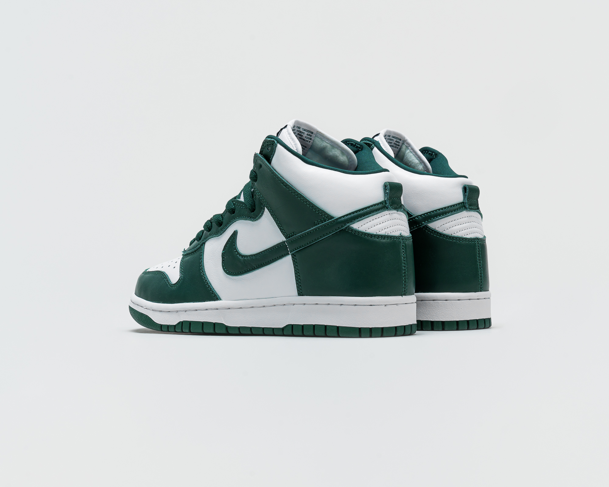 Für die nächsten beiden Dunk High Releases steht bei Nike scheinbar der amerikanische Bundesstaat Michigan im Fokus der Inspiration, das lässt zumindest die Bezeichnung des Grüntons vermuten. Die Michigan State Spartans sind das Sportteam der Michigan State University, deren Männerbasketball Team bereits zweimal den NCAA Titel gewonnen hat. Es handelt sich also um eine Universität, die einen gewissen Ruf in der Sportart hat, aus der der Nike Dunk ursprünglich kommt. Die Farben der der Michigan State Spartans sind Weiß und eben jenes Dunkelgrün, das Nike für diesen Schuh verwendet hat. Das Logo der Spartans ist vielen US-Sportbegeisterten bekannt. Es zeigt einen Spartanerhelm in Dunkelgrün, welches sich als kleines Logo auf dem Dunk sicherlich sehr gut gemacht hätte. Eigentlich schade, wir hätten das gerne gesehen. Doch da stellt sich einem Unternehmen wie Nike vermutlich die Frage, ob der Schuh dann noch kommerziell genug ist, oder ob er nur noch für Fans der Spartans interessant ist.
