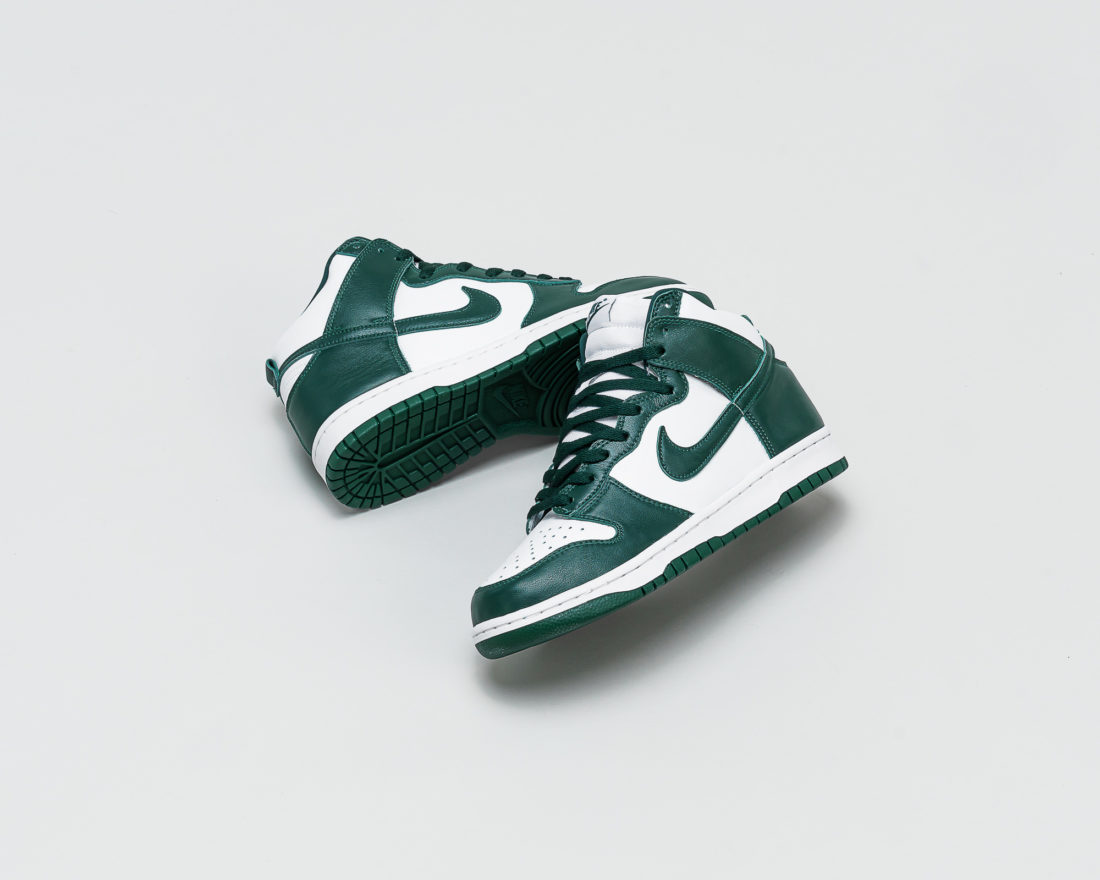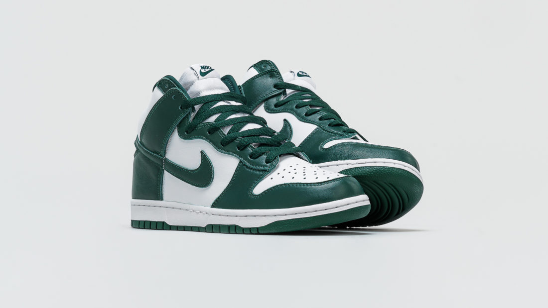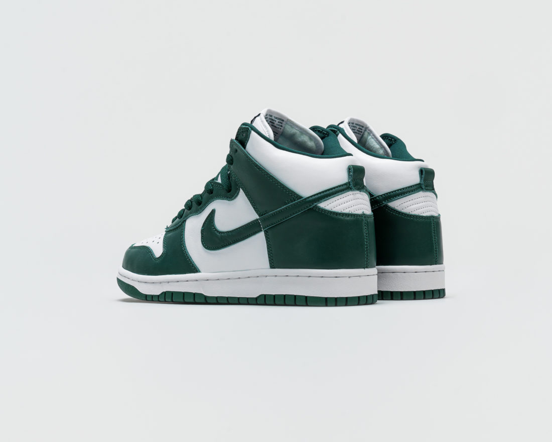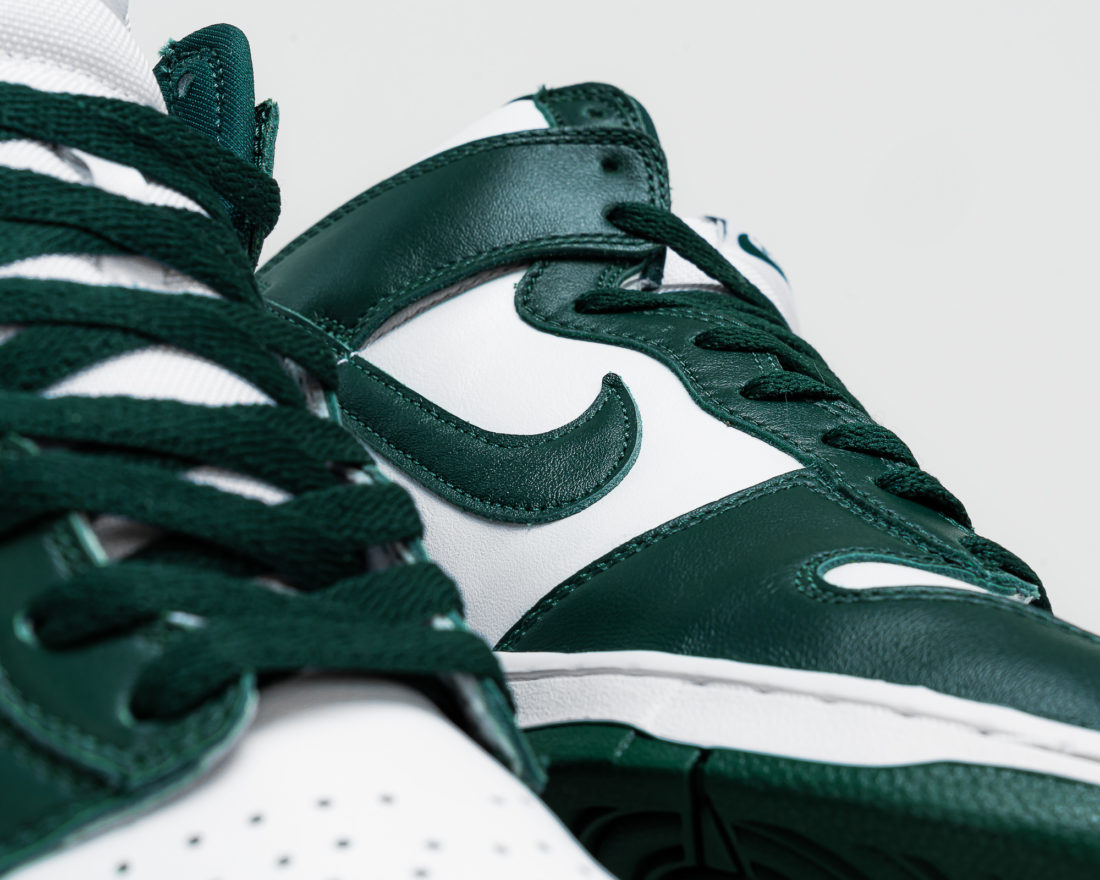 Für die nächsten beiden Dunk High Releases steht bei Nike scheinbar der amerikanische Bundesstaat Michigan im Fokus der Inspiration, das lässt zumindest die Bezeichnung des Grüntons vermuten. Die Michigan State Spartans sind das Sportteam der Michigan State University, deren Männerbasketball Team bereits zweimal den NCAA Titel gewonnen hat. Es handelt sich also um eine Universität, die einen gewissen Ruf in der Sportart hat, aus der der Nike Dunk ursprünglich kommt. Die Farben der der Michigan State Spartans sind Weiß und eben jenes Dunkelgrün, das Nike für diesen Schuh verwendet hat. Das Logo der Spartans ist vielen US-Sportbegeisterten bekannt. Es zeigt einen Spartanerhelm in Dunkelgrün, welches sich als kleines Logo auf dem Dunk sicherlich sehr gut gemacht hätte. Eigentlich schade, wir hätten das gerne gesehen. Doch da stellt sich einem Unternehmen wie Nike vermutlich die Frage, ob der Schuh dann noch kommerziell genug ist, oder ob er nur noch für Fans der Spartans interessant ist.