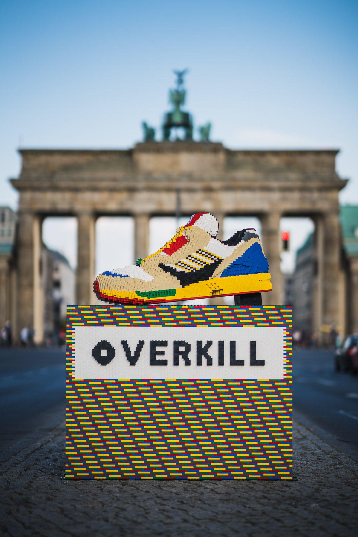 Trotz des eher bescheidenen Wetters versammelten sich mehrere Hundert sowohl ZX als auch Lego Liebhaber mit dem gegebenen Abstand und Maske vor dem Laden. Endlich im Trockenen angekommen durfte jeder an unserem Quiz teilnehmen. Marc und Julian hatten für jeden 3 Fragen parat, welches das Wissen zu adidas, Lego und Overkill abfragten. Wer am Ende drei richtige Antworten hatte, durfte eines der heiß begehrten Fan Mocs, welches ein 1:1 Nachbau im Legodesign des echten Schuhs ist, sein Eigen nennen. Das optische Highlight stand aber mitten im Laden, ein riesiger Nachbau des ZX Modells aus Lego! Bevor wir das Schmuckstück in den Laden gebracht haben, ließen wir es uns nicht nehmen ihn zusammen mit der eigens angefertigten Lego Vitrine zum Brandenburger Tor zu karren um noch ein paar schöne Bilder in Szene zu setzen.