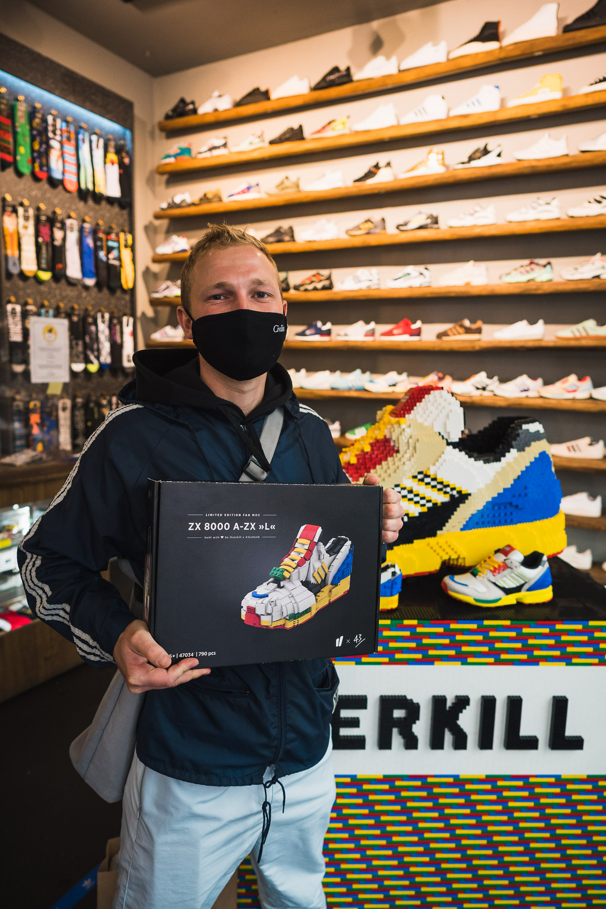 Despite the rather modest weather, several hundred both ZX and Lego enthusiasts gathered in front of the store with the given distance and mask. Finally arrived inside the store, everyone was allowed to participate in our quiz. Marc and Julian had 3 questions for everyone, which asked for knowledge about adidas, Lego and Overkill.