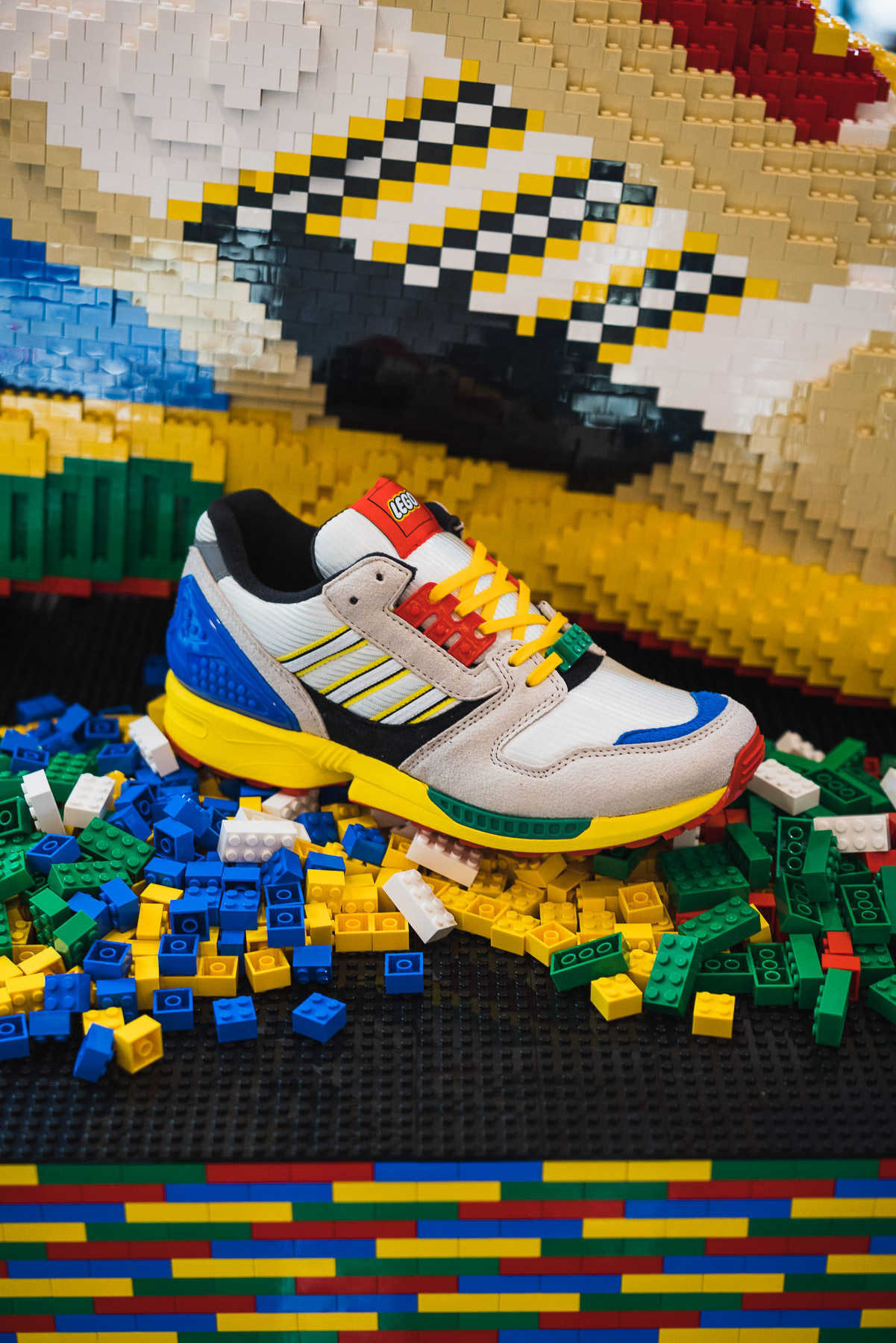 Am vergangenen Freitag hatten wir endlich mal wieder einen Release im Laden! Der adidas ZX 8000 Lego durfte unter das Volk gebracht werden und die Resonanz unser ZX Gemeinde war wieder einmalig! Mit dem Buchstaben L aus der A-ZX Serie hat adidas vielen Erwachsenen, welche im Herzen noch Kinder sind, einen Gefallen getan. Der ZX 8000 genießt in der Szene sowieso den höchsten Stellenwert und das Design des LEGO Modells war trotz der Nutzung aller Hauptfarben, also Rot, Gelb, Grün und Blau kein Teller bunte Knete, sondern eine Version die sich nicht zu verstecken braucht. Kleine aber feine Details, wie das Lacelock in Form eines Bricks oder die kleinen Noppen an der Plastikferse, ließen die Herzen höherschlagen.