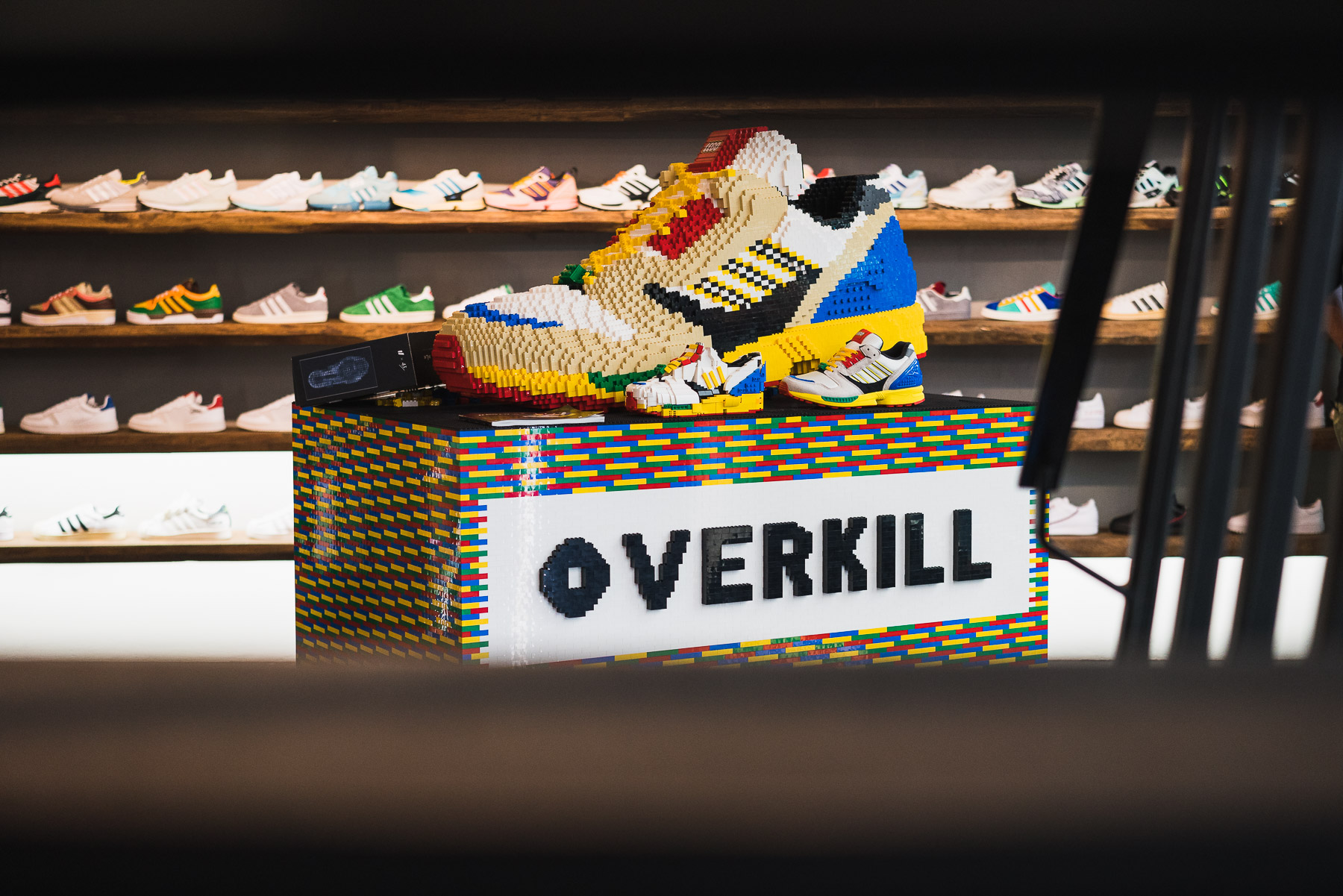 Trotz des eher bescheidenen Wetters versammelten sich mehrere Hundert sowohl ZX als auch Lego Liebhaber mit dem gegebenen Abstand und Maske vor dem Laden. Endlich im Trockenen angekommen durfte jeder an unserem Quiz teilnehmen. Marc und Julian hatten für jeden 3 Fragen parat, welches das Wissen zu adidas, Lego und Overkill abfragten. Wer am Ende drei richtige Antworten hatte, durfte eines der heiß begehrten Fan Mocs, welches ein 1:1 Nachbau im Legodesign des echten Schuhs ist, sein Eigen nennen. Das optische Highlight stand aber mitten im Laden, ein riesiger Nachbau des ZX Modells aus Lego! Bevor wir das Schmuckstück in den Laden gebracht haben, ließen wir es uns nicht nehmen ihn zusammen mit der eigens angefertigten Lego Vitrine zum Brandenburger Tor zu karren um noch ein paar schöne Bilder in Szene zu setzen.