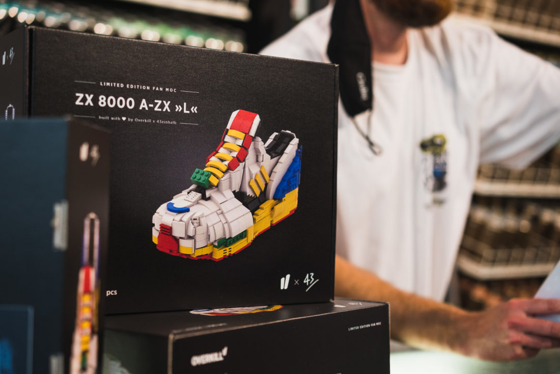 Whoever had three correct answers at the end was allowed to own one of the much sought-after Fan Mocs which is a 1:1 Legobrick version of the actual shoe. But the optical highlight was in the middle of the store, a huge replica of the ZX model made of Lego! Before we brought the jewel into the store, we took the opportunity to bring it together with the specially made Lego showcase to the Brandenburg Gate to shoot some more nice pictures. The professional Lego builder Rene from Brickfrabrik put together 8325 bricks. It took him 52 hours to build the two models and each of them is 22 Kilos heavy. The second shoe was shown at our friends of 43einhalb in Frankfurt, we worked together with the boys and girls on this project to give you the best result. Since the online release already started at midnight, a contingent was set aside especially for the instore release, so that everyone could go home happy and satisfied. It was once again a pleasure to exchange ideas with a few like-minded people and to look into happy eyes.